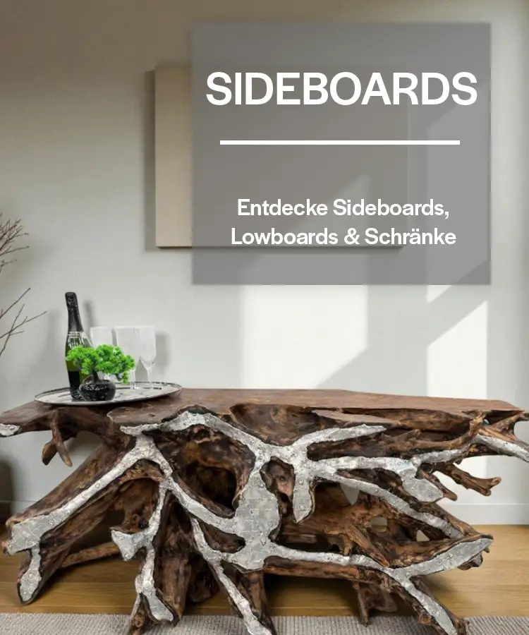 Entdecken Sie außergewöhnliche Sideboards, Highboards und Lowboards aus massivem Holz. Unsere Schränke, Konsolen und Anrichten vereinen traditionelle Handwerkskunst mit modernem Design von der Baumwurzel-Konsole bis zum Sideboard im Loft-Stil.