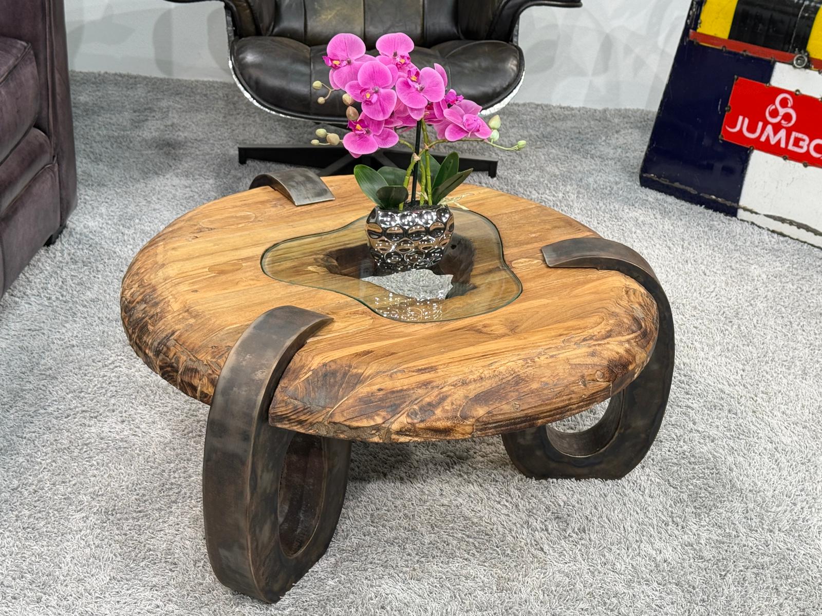 Runder Couchtisch "Clash" aus recyceltem Teakholz ca. Ø 80 x 40 cm mit Glaseinlage und Tischbeinen aus Rohstahl