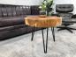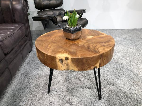 Couchtisch / Beistelltisch "Coin" ca. Ø 60cm x H 50cm aus zusammengesetzten Baumscheiben (Teak Wurzelbereich), inklusive Tischbeinen aus Rohstahl