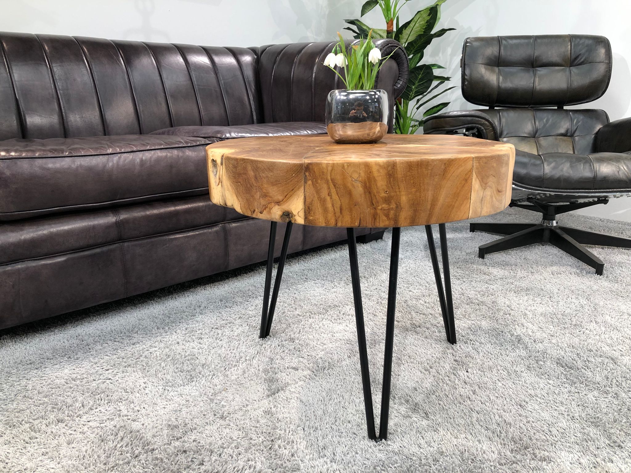 Materialien: Baumscheiben Teak aus dem Bereich der Baumwurzel, drei Tischbeine in V-Form aus schwarz matt lackiertem Rohstahl