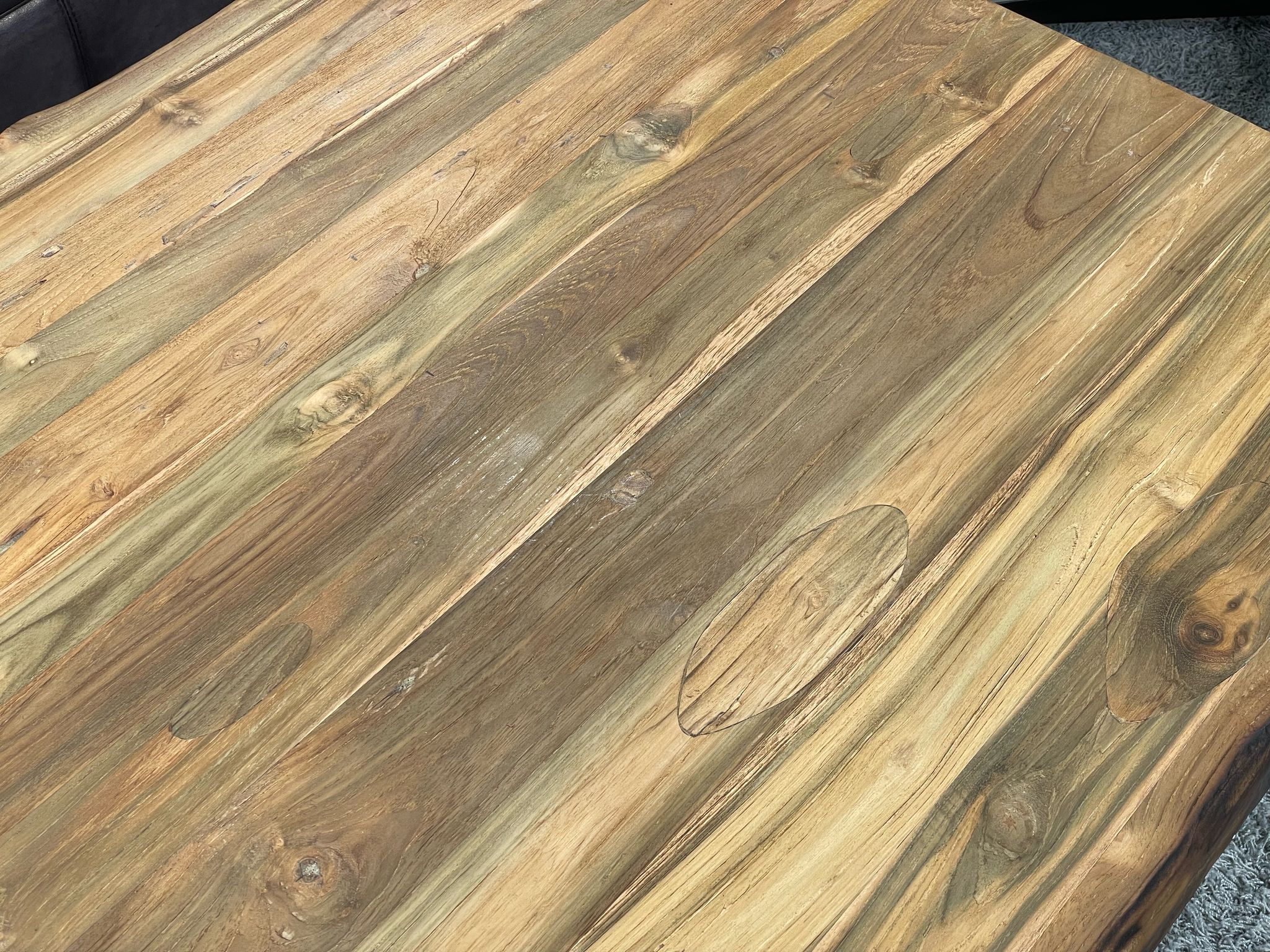 Die Kombination aus hochwertigem Teakholz und einem Tischgestell aus gebürstetem Edelstahl macht diesen Wohnzimmertisch zu einem vielseitigen Möbelstück, das sich harmonisch in moderne und rustikale Wohnstile einfügt.