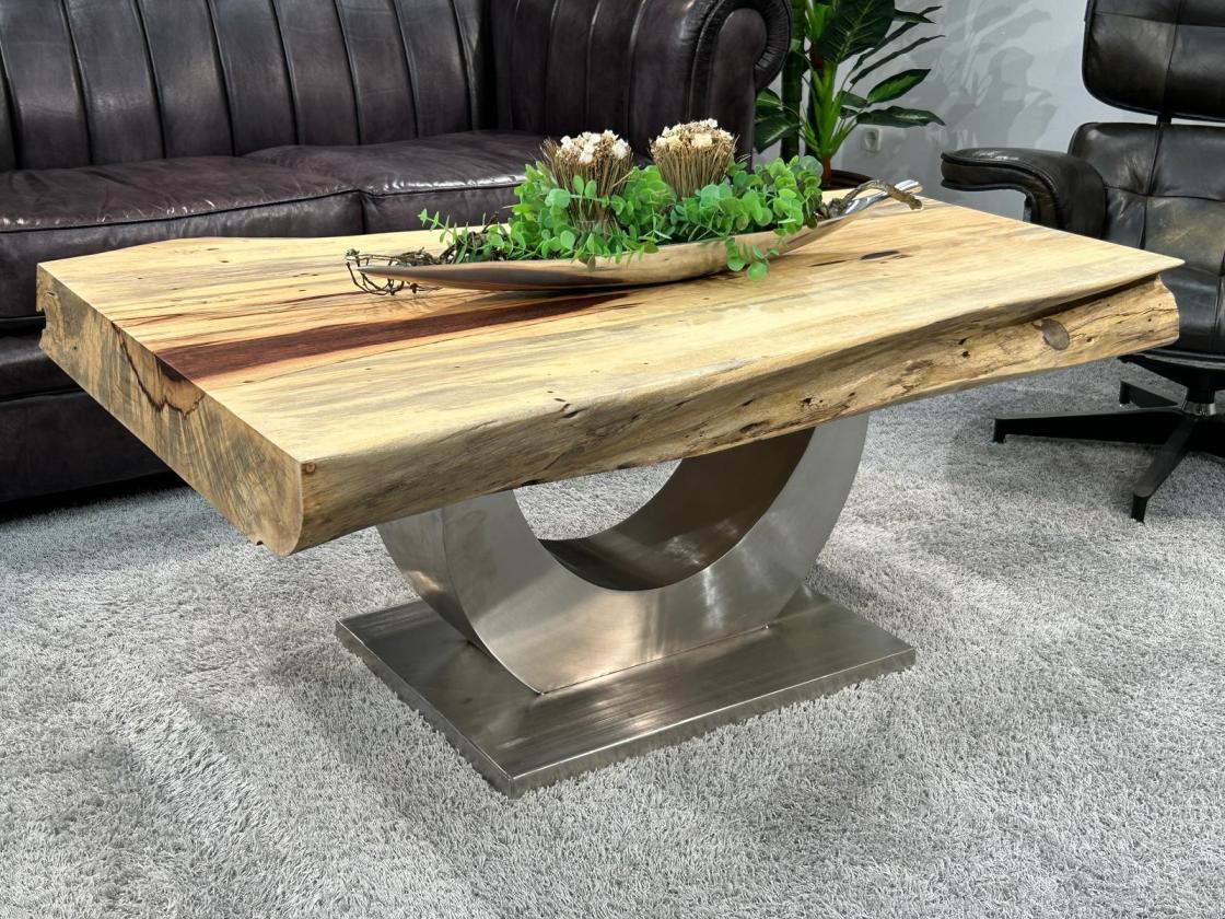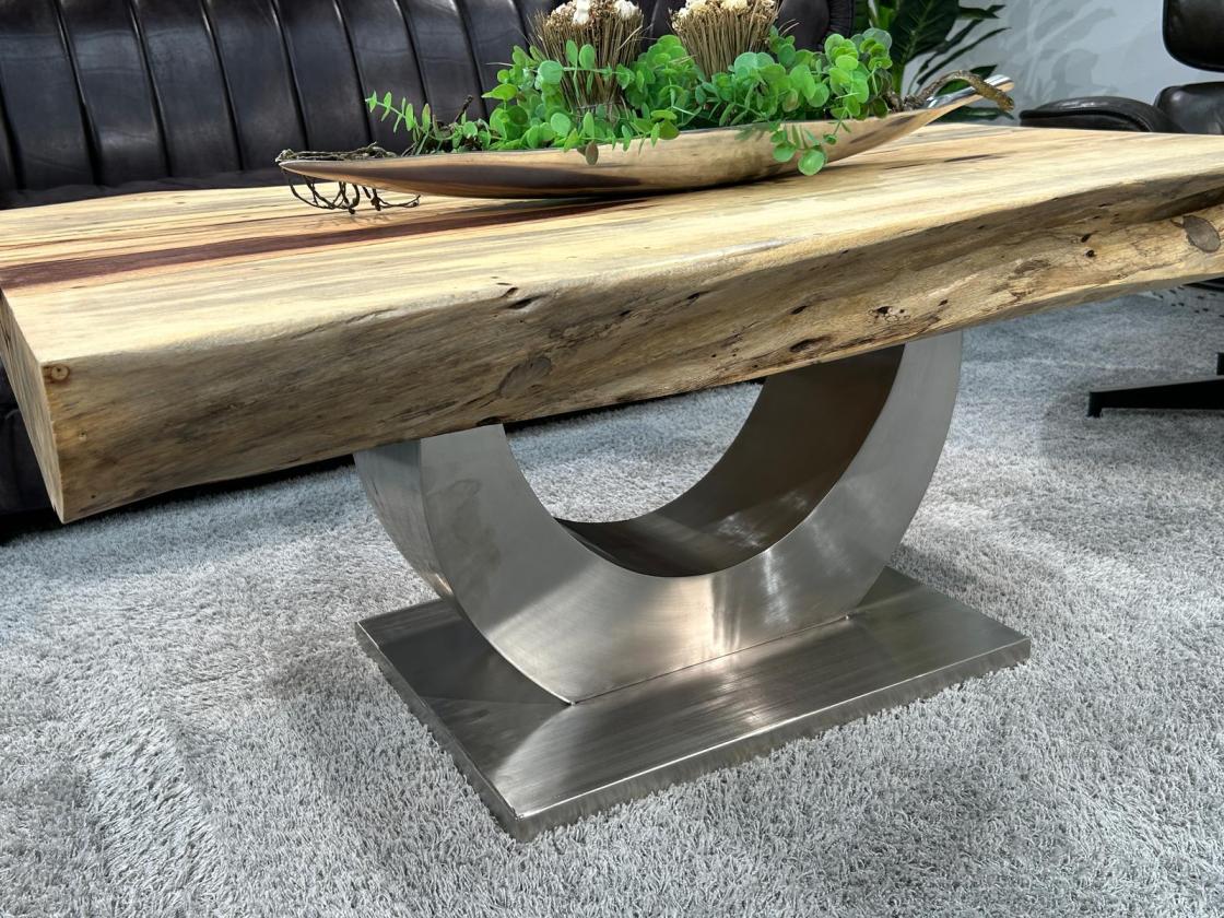 Der massive Baumkantentisch Deep Island Tamarind steht auf einem stabilen Tischfuß in Halbmond-Form, der aus gebürstetem Edelstahl gefertigt wurde. Das Metallgestell sorgt für eine hohe Stabilität und verleiht dem Tisch eine moderne, zeitlose Optik.