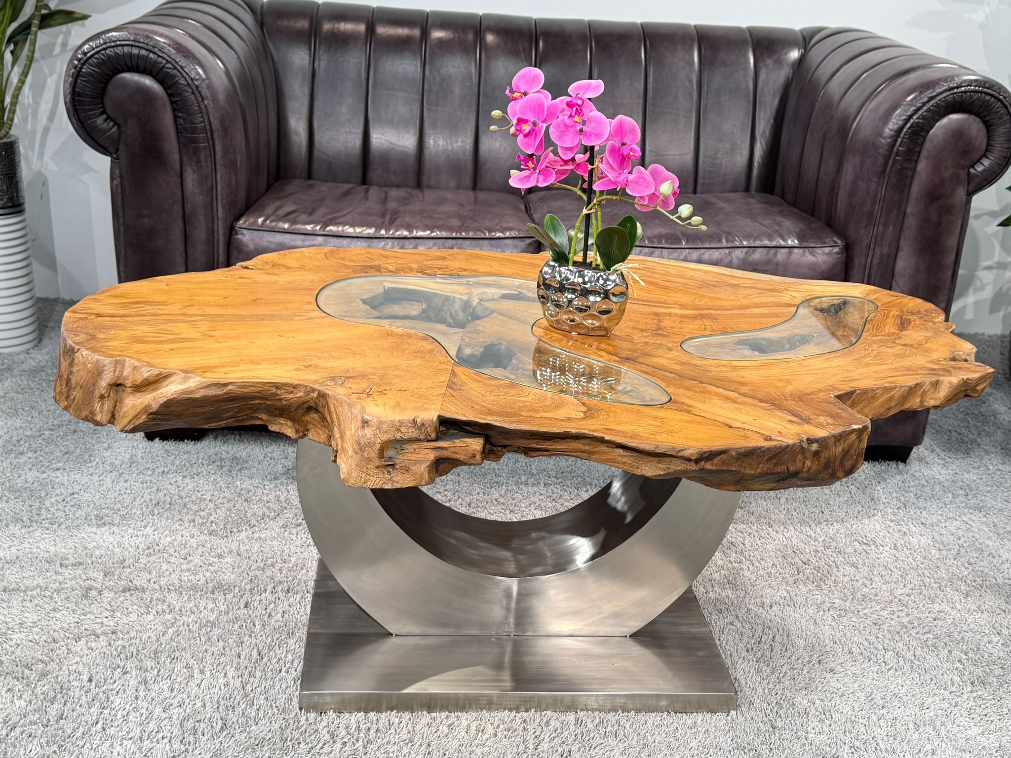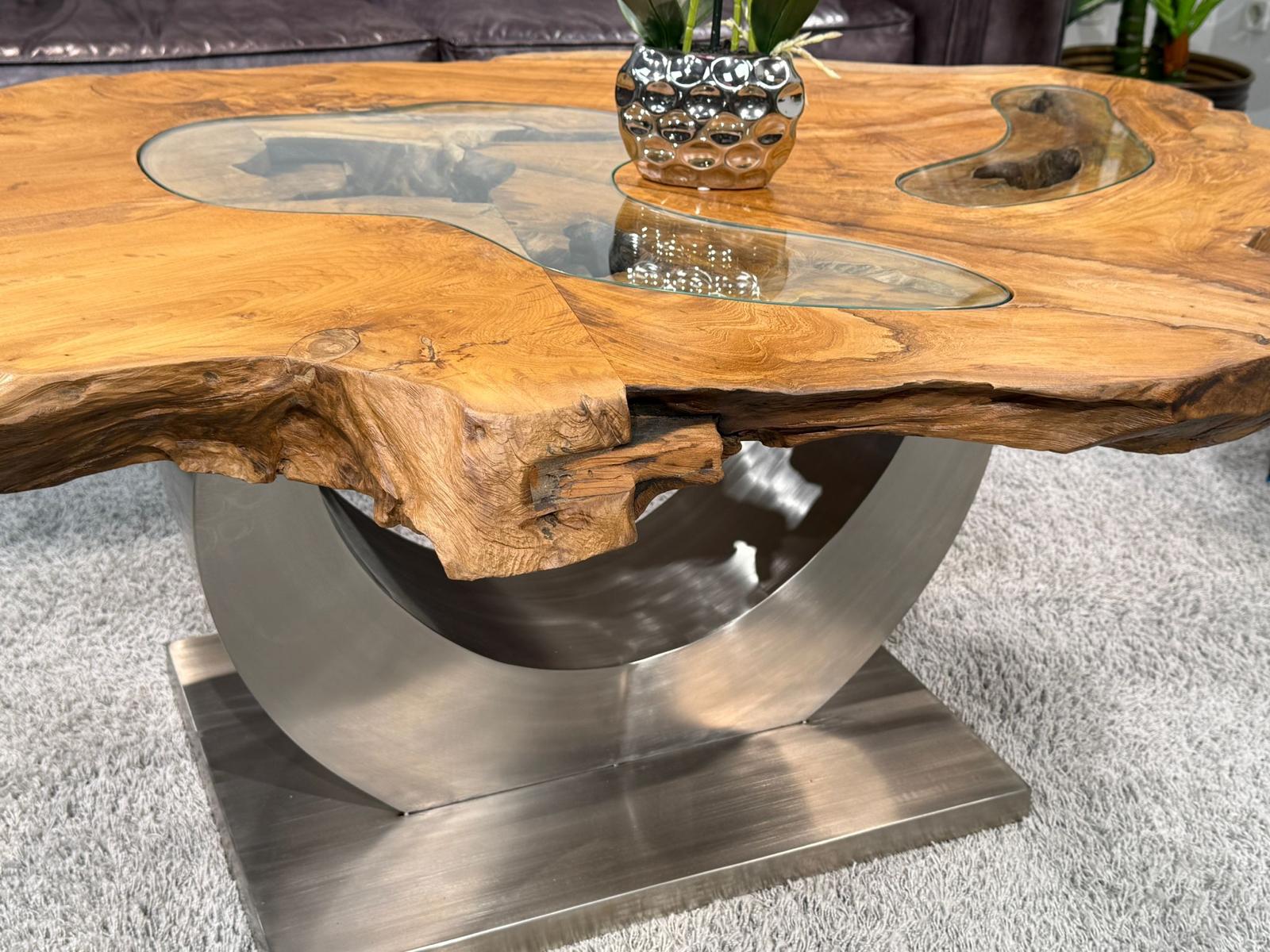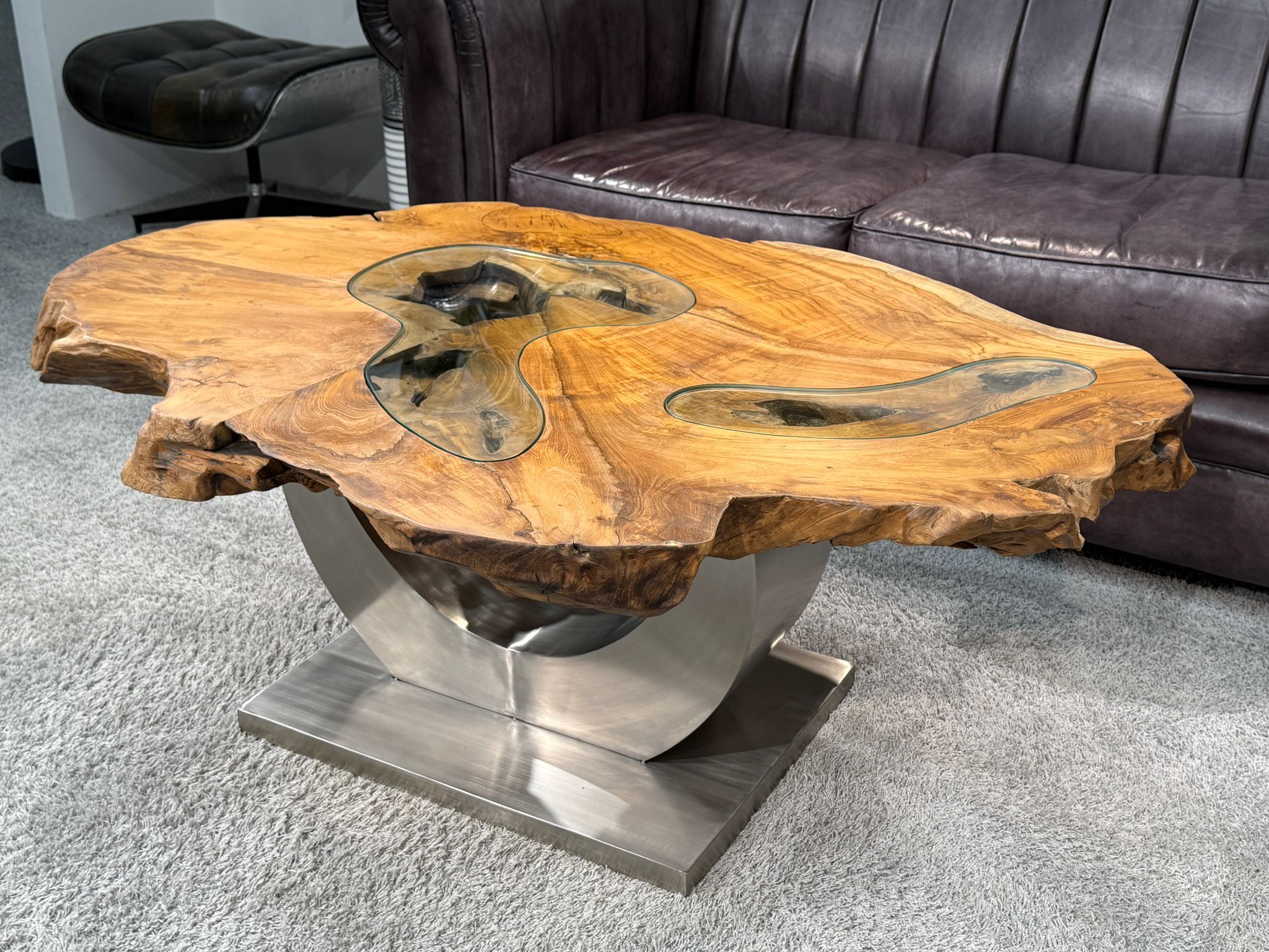 Das Wohnzimmertisch Unikat aus einem Baumstamm aus der Serie Expression ist ein außergewöhnliches Möbelstück, das natürliche Eleganz und handwerkliche Perfektion in sich vereint. Die Tischplatte wurde aus verleimten Baumscheiben eines Teakbaumes gefertigt, die aus dem Wurzelbereich stammen. Diese besondere Holzherkunft verleiht dem Tisch seine ausdrucksstarke Struktur und macht ihn zu einem echten Unikat.