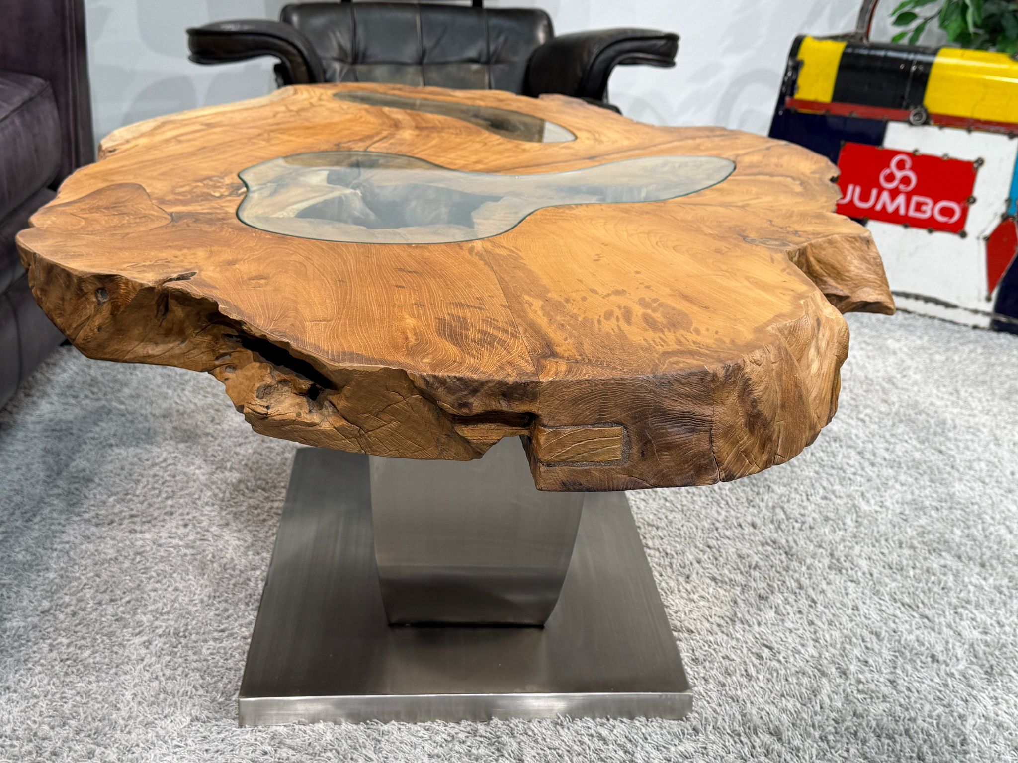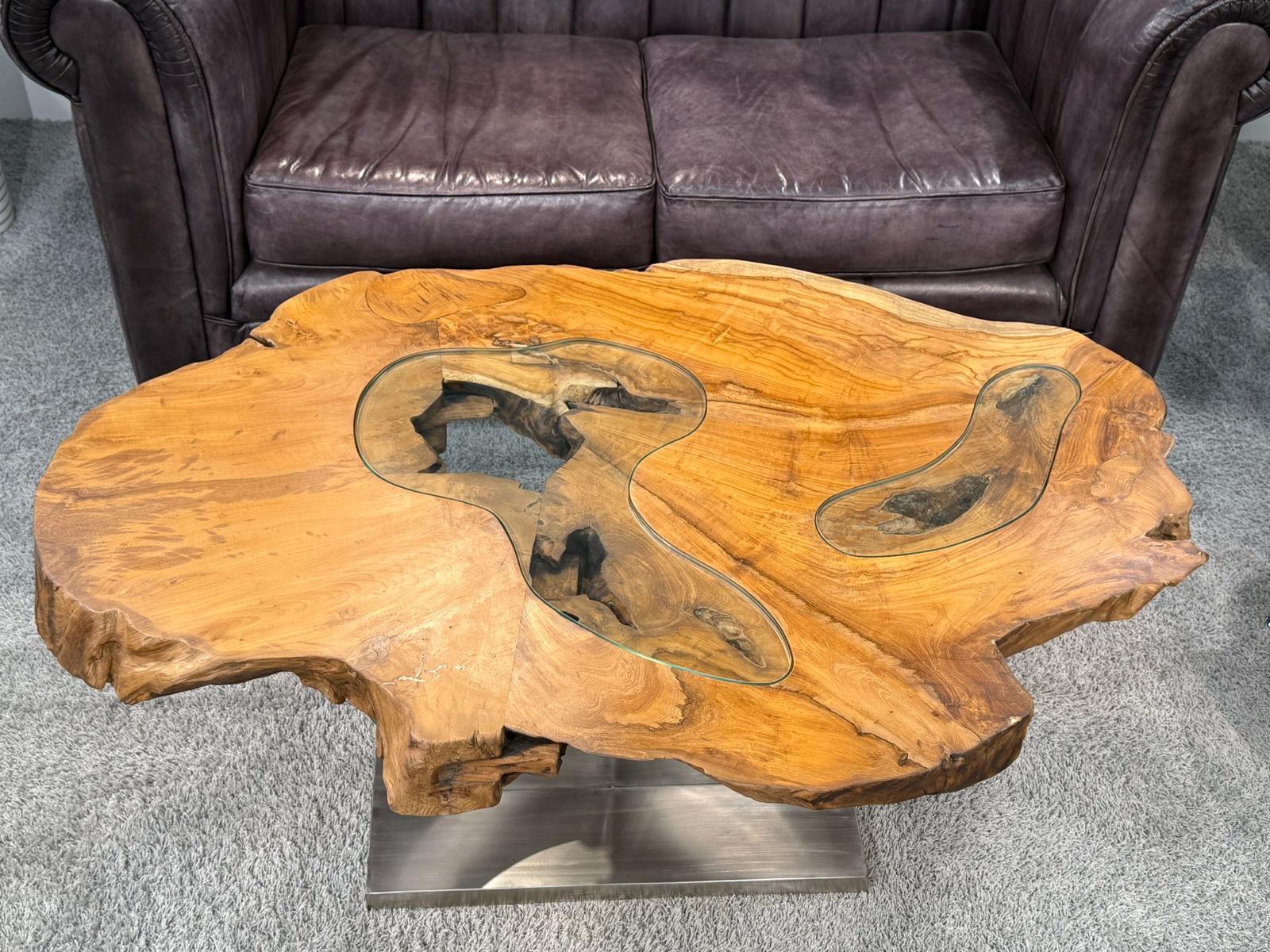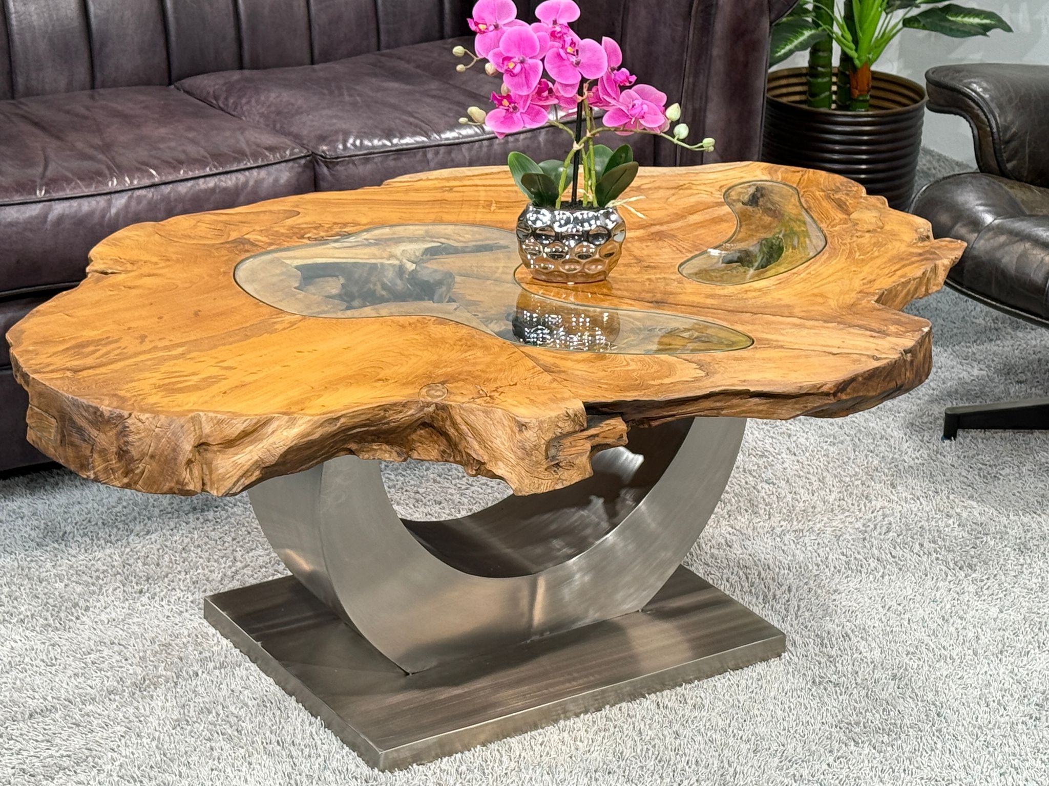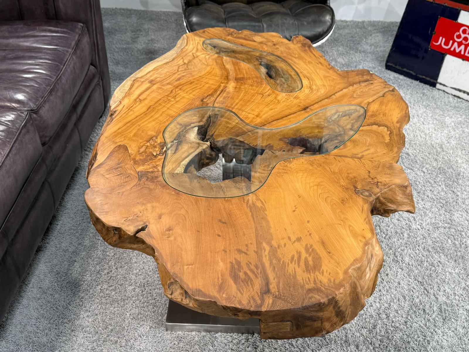 Das Wohnzimmertisch Unikat aus einem Baumstamm aus der Serie Expression ist ein außergewöhnliches Möbelstück, das natürliche Eleganz und handwerkliche Perfektion in sich vereint. Die Tischplatte wurde aus verleimten Baumscheiben eines Teakbaumes gefertigt, die aus dem Wurzelbereich stammen. Diese besondere Holzherkunft verleiht dem Tisch seine ausdrucksstarke Struktur und macht ihn zu einem echten Unikat.