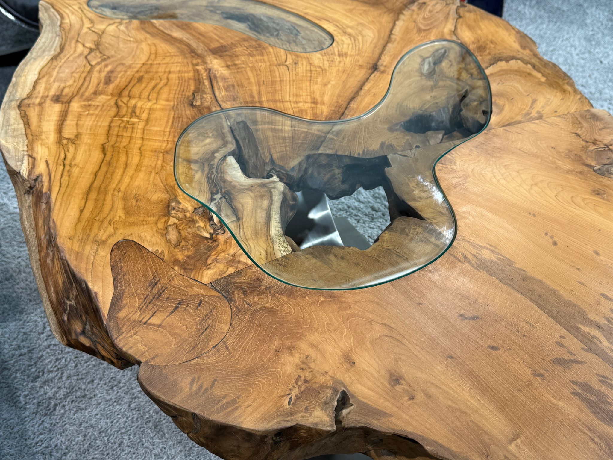 Die natürlichen Baumkanten wurden an den Außen- und Innenbereichen der Tischplatte sorgfältig erhalten, wodurch die ursprüngliche Form des Holzes sichtbar bleibt. Der entstandene freie Innenraum wurde in reiner Handarbeit mit einer hochwertigen Glaseinlage verziert, die die Details des Holzes betont. Die massive Tischplatte hat eine beeindruckende Stärke von 8 cm, wurde fein geschliffen und mit einem schützenden Wachs versiegelt, um die natürliche Schönheit des Holzes hervorzuheben.