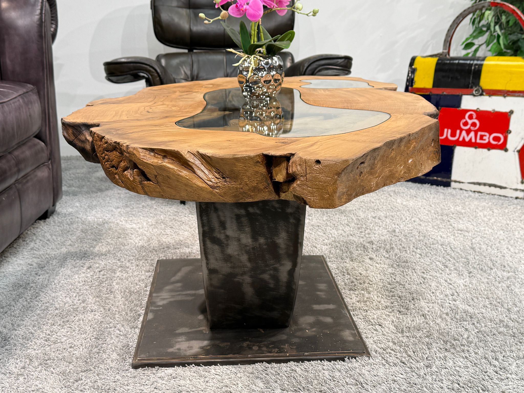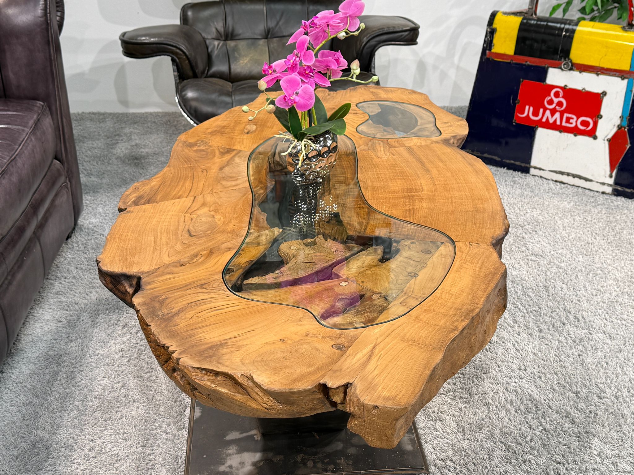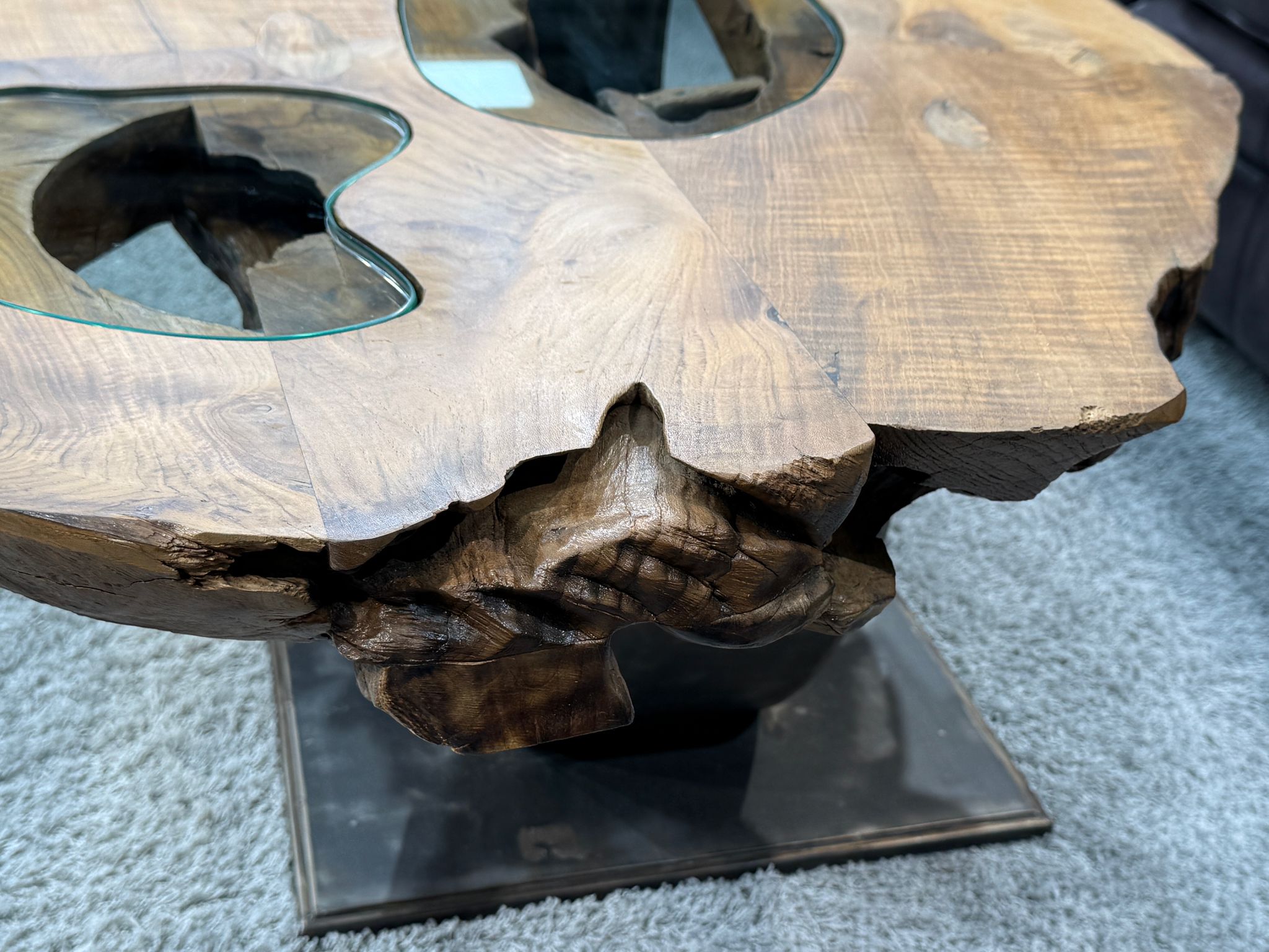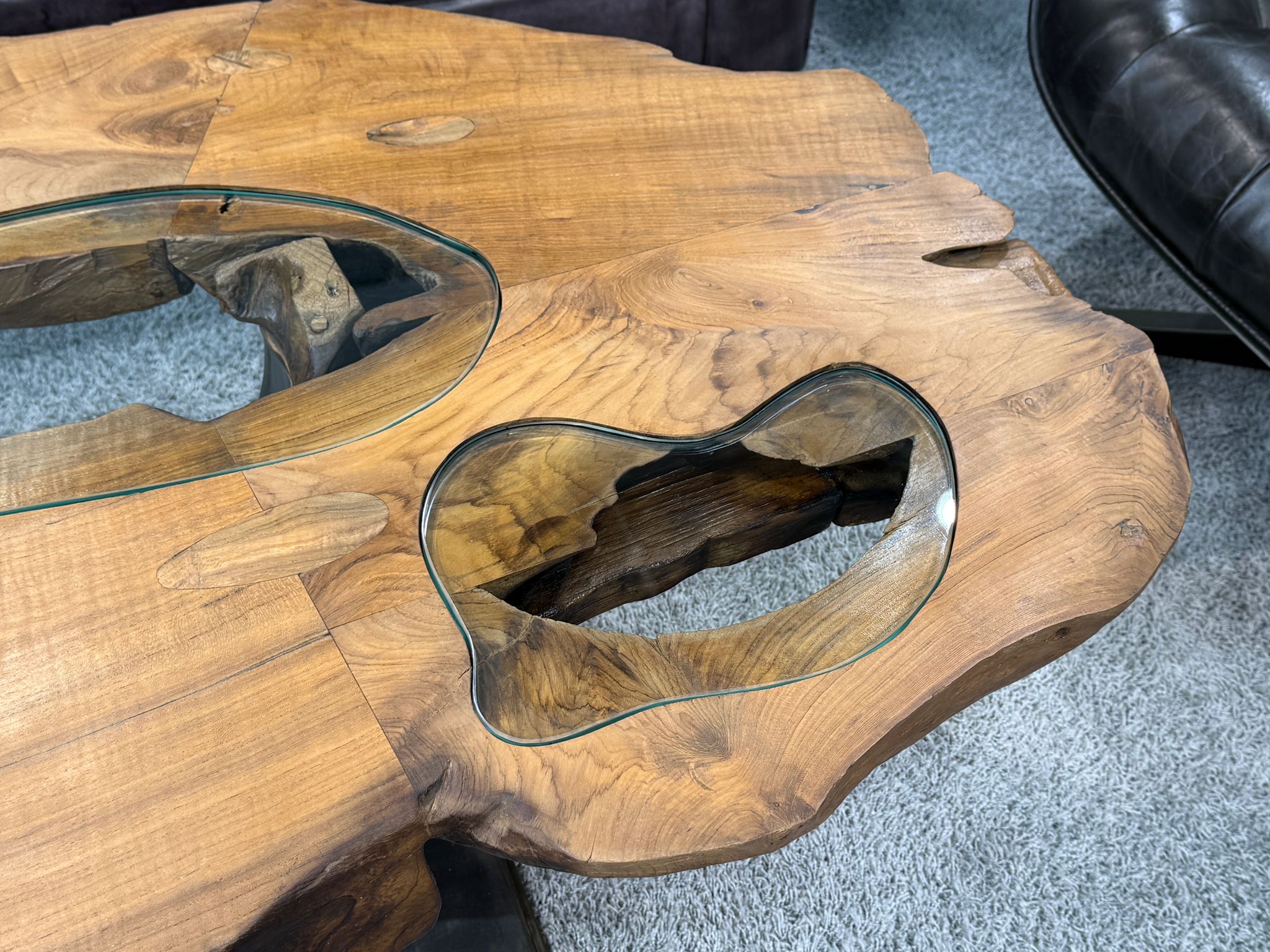 Das Wohnzimmertisch Unikat aus einem Baumstamm aus der Serie Expression ist ein außergewöhnliches Möbelstück, das natürliche Eleganz und handwerkliche Perfektion in sich vereint. Die Tischplatte wurde aus verleimten Baumscheiben eines Teakbaumes gefertigt, die aus dem Wurzelbereich stammen. Diese besondere Holzherkunft verleiht dem Tisch seine ausdrucksstarke Struktur und macht ihn zu einem echten Unikat.