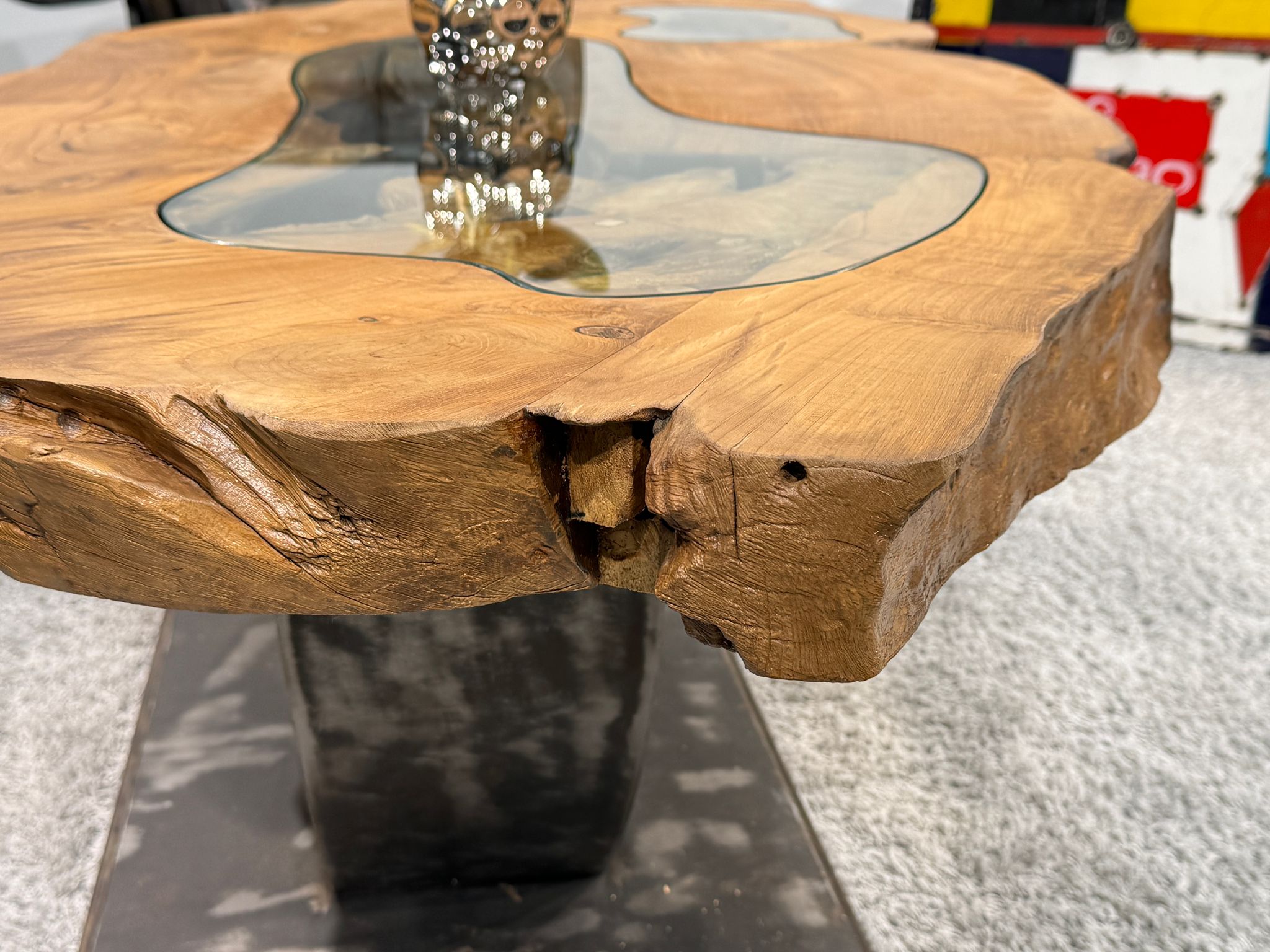 Die natürlichen Baumkanten wurden an den Außen- und Innenbereichen der Tischplatte sorgfältig erhalten, wodurch die ursprüngliche Form des Holzes sichtbar bleibt. Der entstandene freie Innenraum wurde in reiner Handarbeit mit einer hochwertigen Glaseinlage verziert, die die Details des Holzes betont. Die massive Tischplatte hat eine beeindruckende Stärke von 8 cm, wurde fein geschliffen und mit einem schützenden Wachs versiegelt, um die natürliche Schönheit des Holzes hervorzuheben.