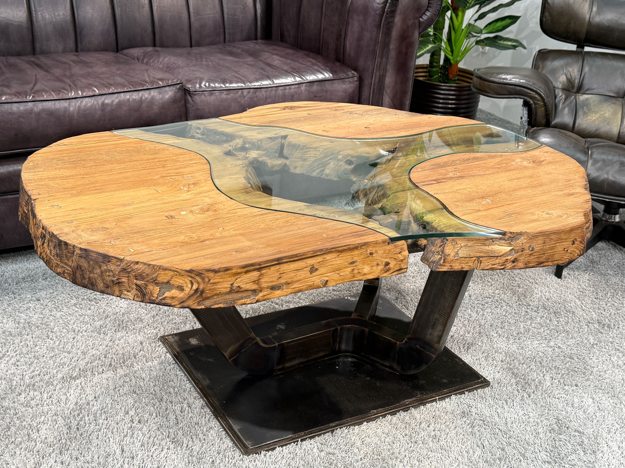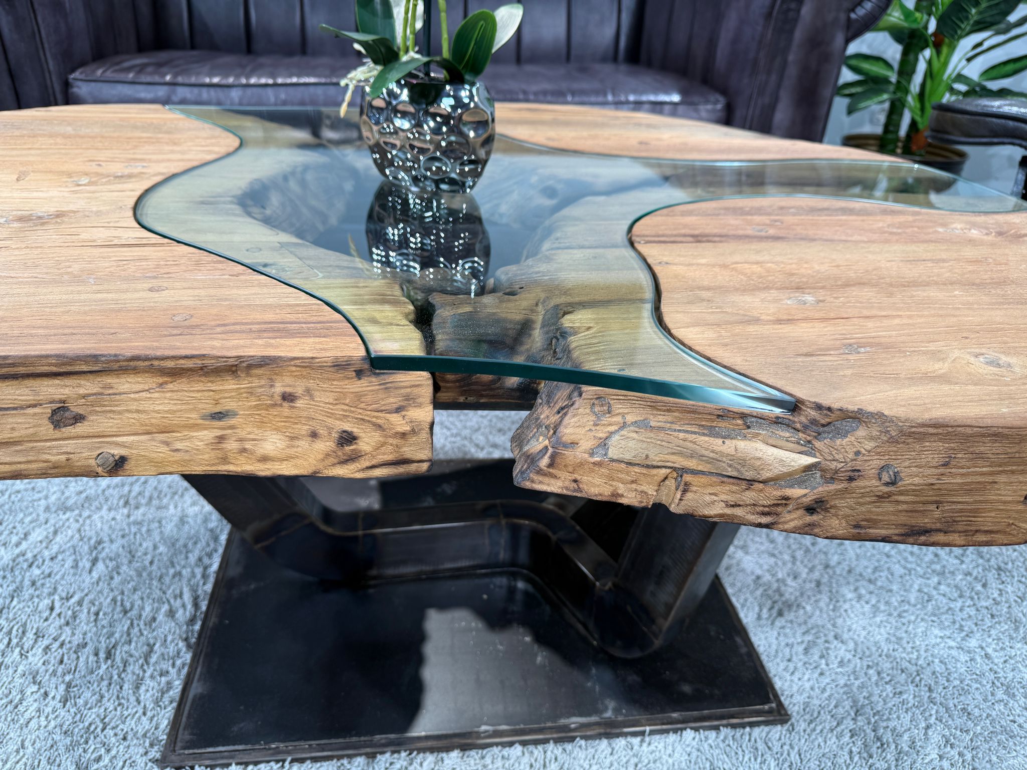 Massivholz Couchtisch "Fjord" mit einem Tischgestell aus Rohstahl Vintage und einem Glaseinleger