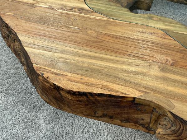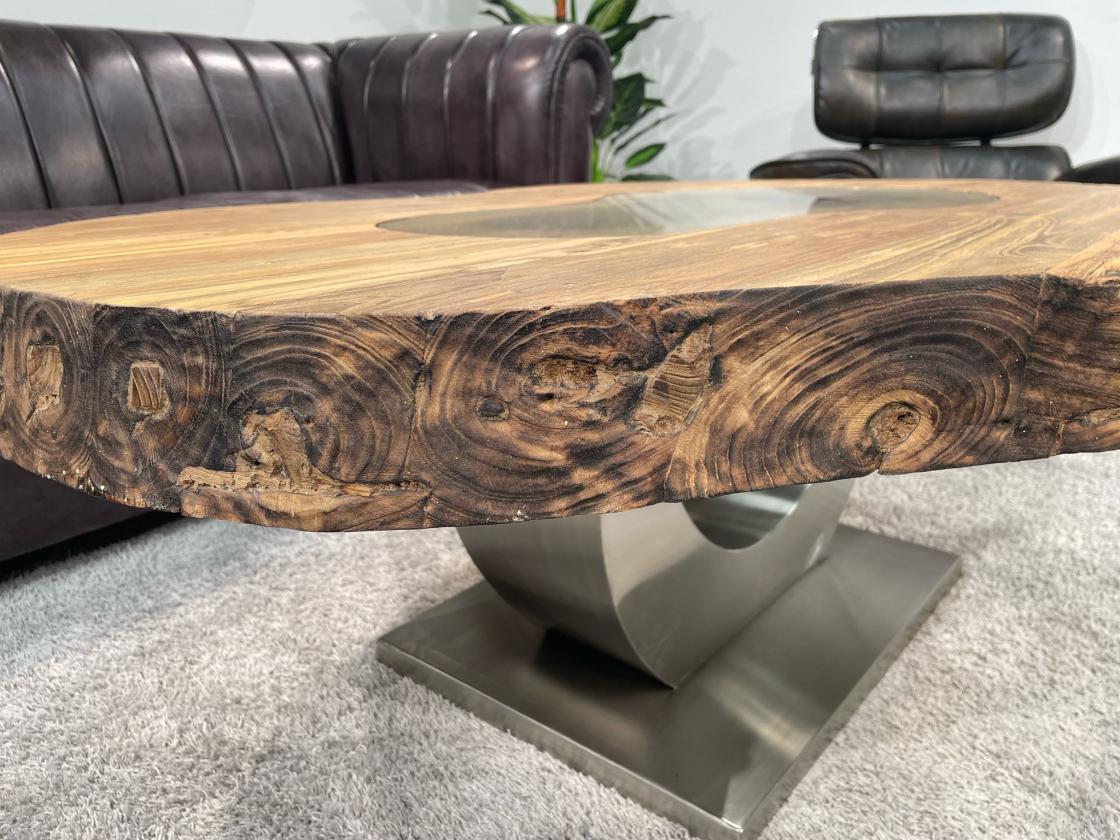 exklusive Couchtisch "Fusion" kombiniert hochwertige Materialien mit einzigartigem Design. Gefertigt aus recyceltem Massivholz und veredelt mit einer Glaseinlage, vereint dieser Tisch Natürlichkeit und modernes Wohndesign auf stilvolle Weise. Mit einer massiven Tischplatte von 8,5 cm Stärke setzt dieses Modell neue Maßstäbe in Sachen Qualität und Langlebigkeit.