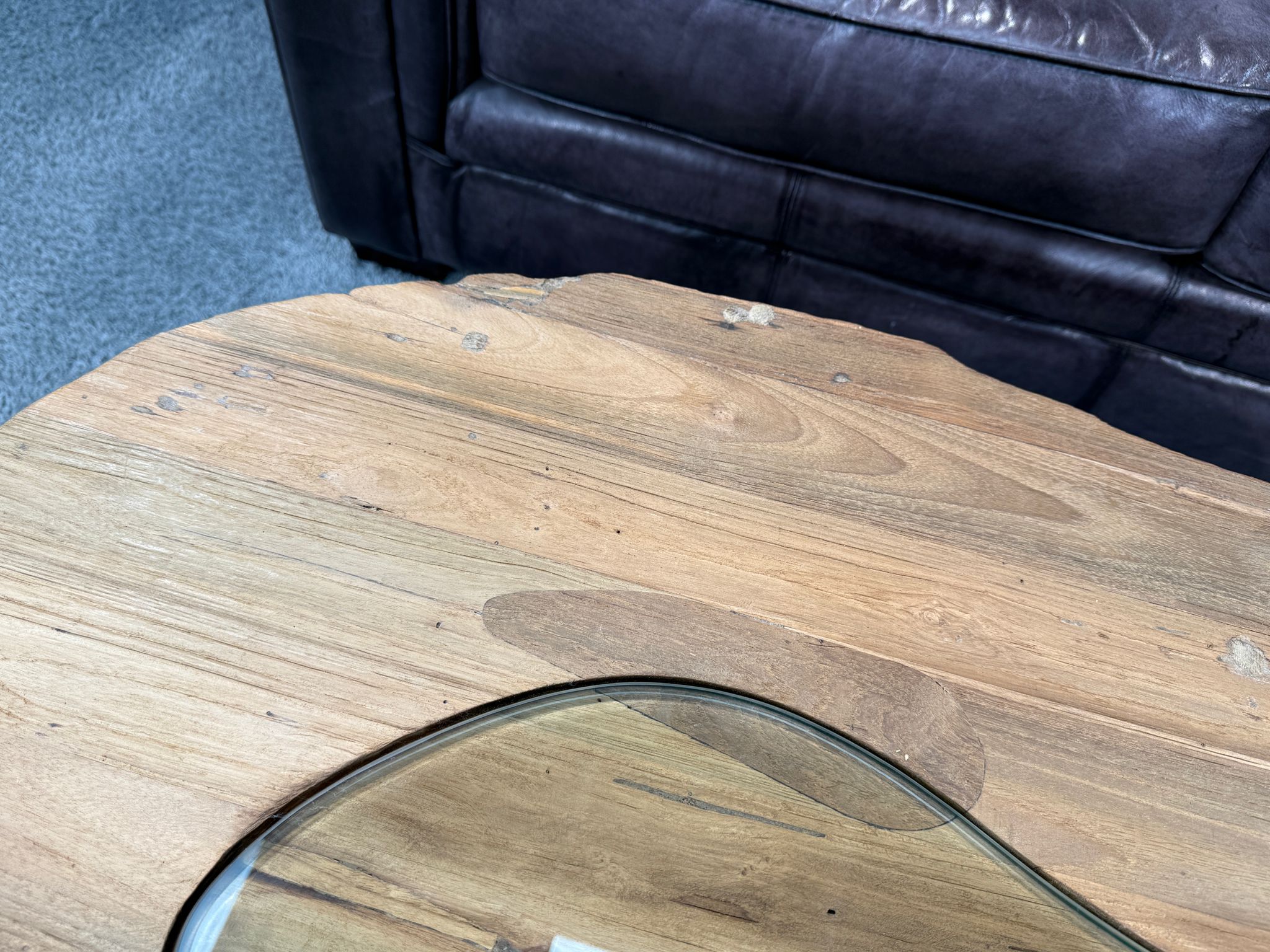 Die Tischplatte misst ca. 130 x 83-95 cm bei einer Stärke von 8 cm – nichts aufgedoppelt, sondern durch und durch massiv. In der Mitte der Platte befindet sich eine handgefertigte Glaseinlage, die das raue, lebendige Holz durchbricht und den Blick in die Tiefe des Materials freigibt. Diese Kombination aus recyceltem Holz und Glas verleiht dem Tisch seine charakteristische Optik.