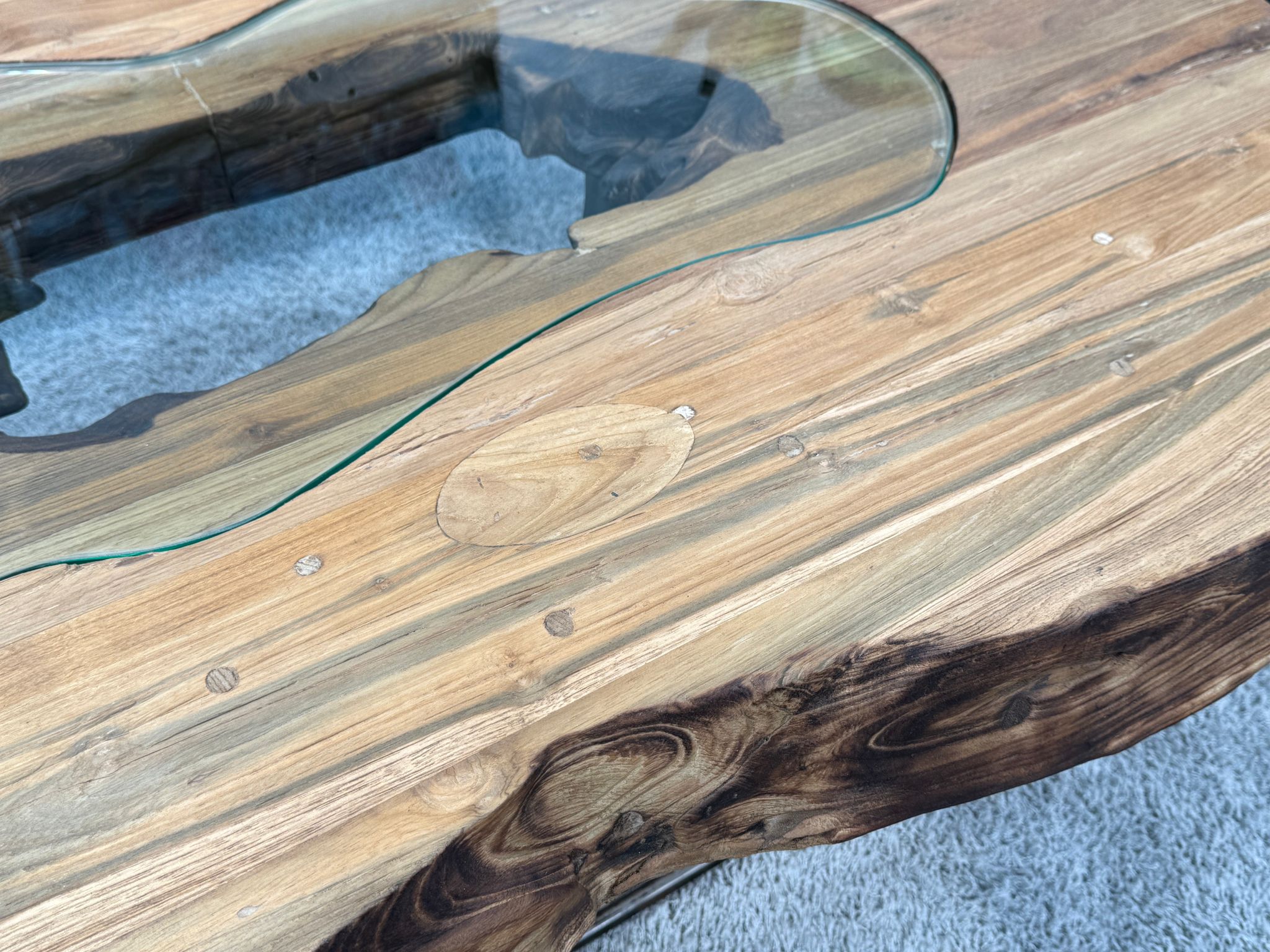Die Tischplatte misst ca. 132 x 80-85 cm bei einer Stärke von 8 cm – nichts aufgedoppelt, sondern durch und durch massiv. In der Mitte der Platte befindet sich eine handgefertigte Glaseinlage, die das raue, lebendige Holz durchbricht und den Blick in die Tiefe des Materials freigibt. Diese Kombination aus recyceltem Holz und Glas verleiht dem Tisch seine charakteristische Optik.