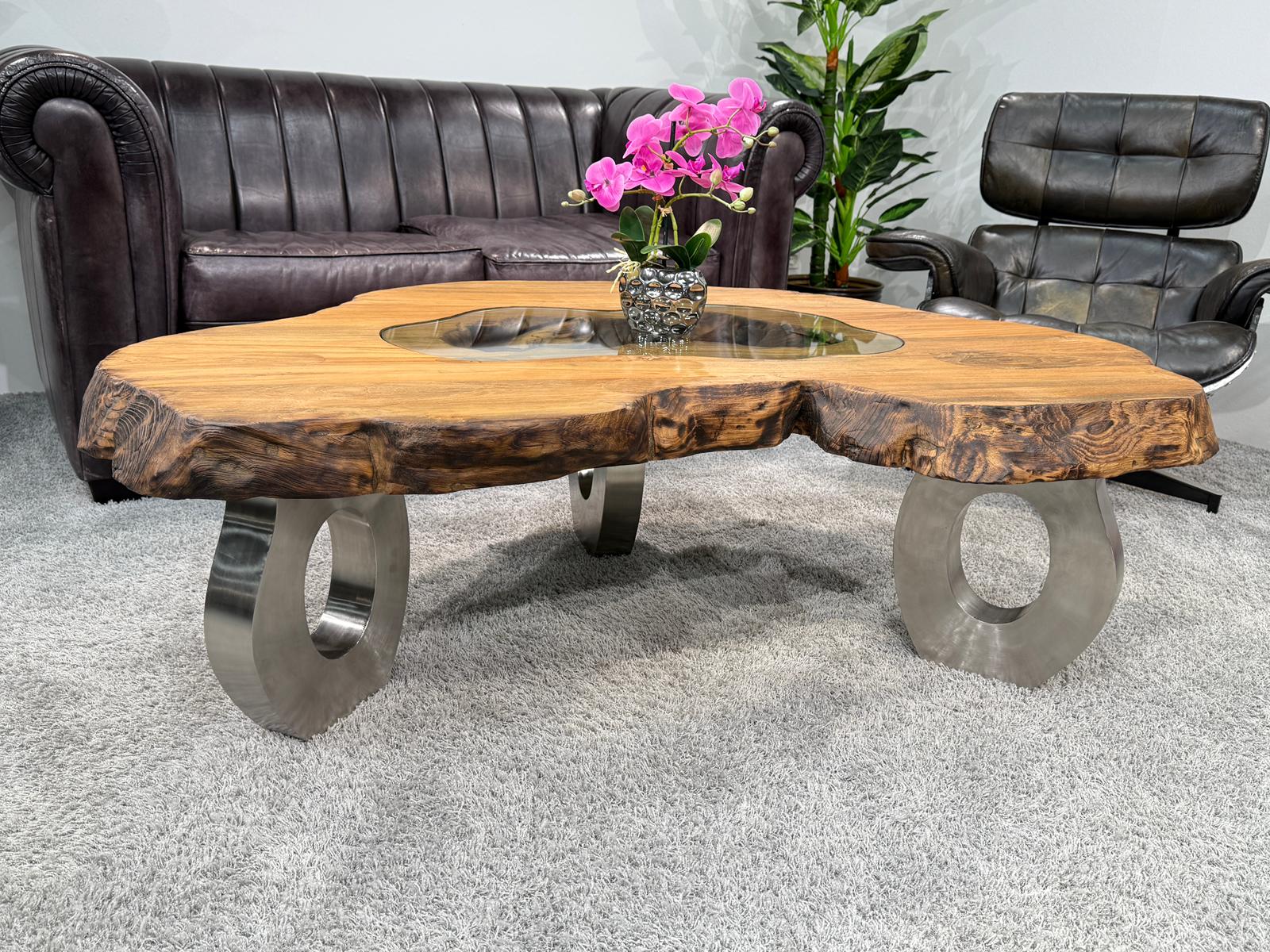 Material: Altholz (Recyceltes Teakholz), Glas, Tischfüße in O-Form aus Edelstahl gebürstet, 3 Stk.