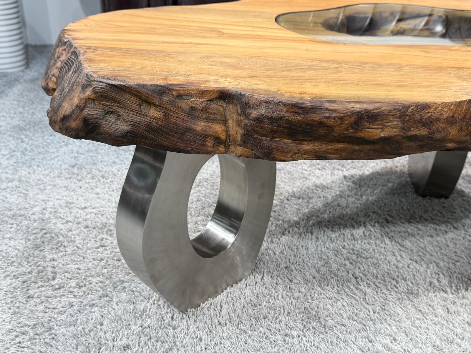 Couchtisch "Lakeside" aus Altholz mit Glaseinlage und einem Edelstahlgestell