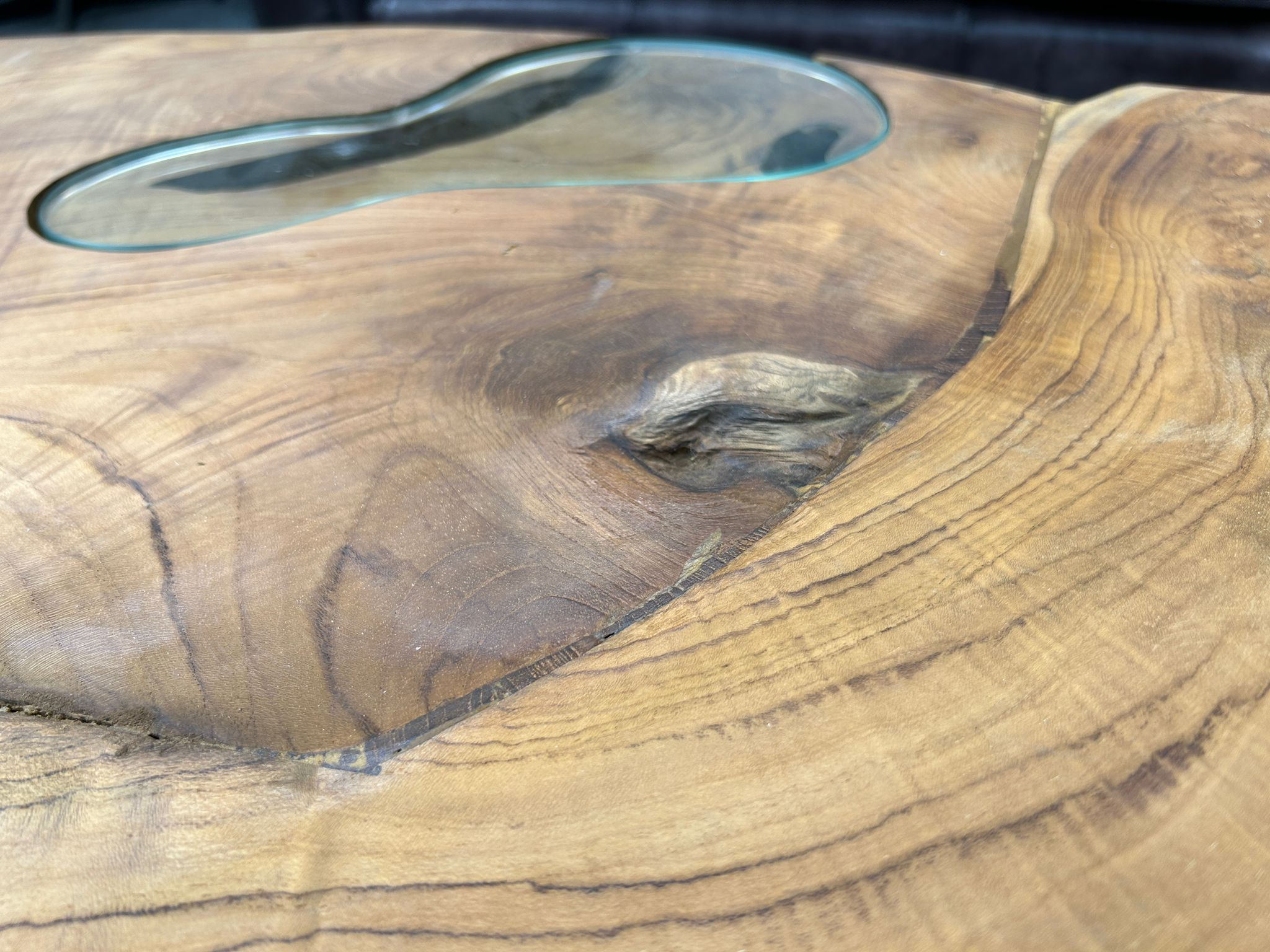 Ein zentrales gestalterisches Detail ist eine natürlich entstandene Verwachsung, die im Zentrum der Tischplatte liegt. Diese wurde in aufwendiger Handarbeit mit einer Glasplatte veredelt. Die eingesetzte Glaseinlage hat eine Stärke von 10 mm und betont die Einzigartigkeit des Holzes, indem sie den Blick auf die ursprüngliche Struktur des Baumstamms freigibt.
