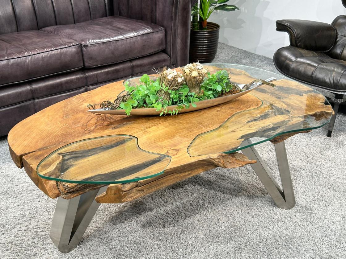 Ovaler Baumtisch / Couchtisch "Lakeside“ aus massivem Teakholz – handgefertigtes Einzelstück aus einem alten Baumstamm