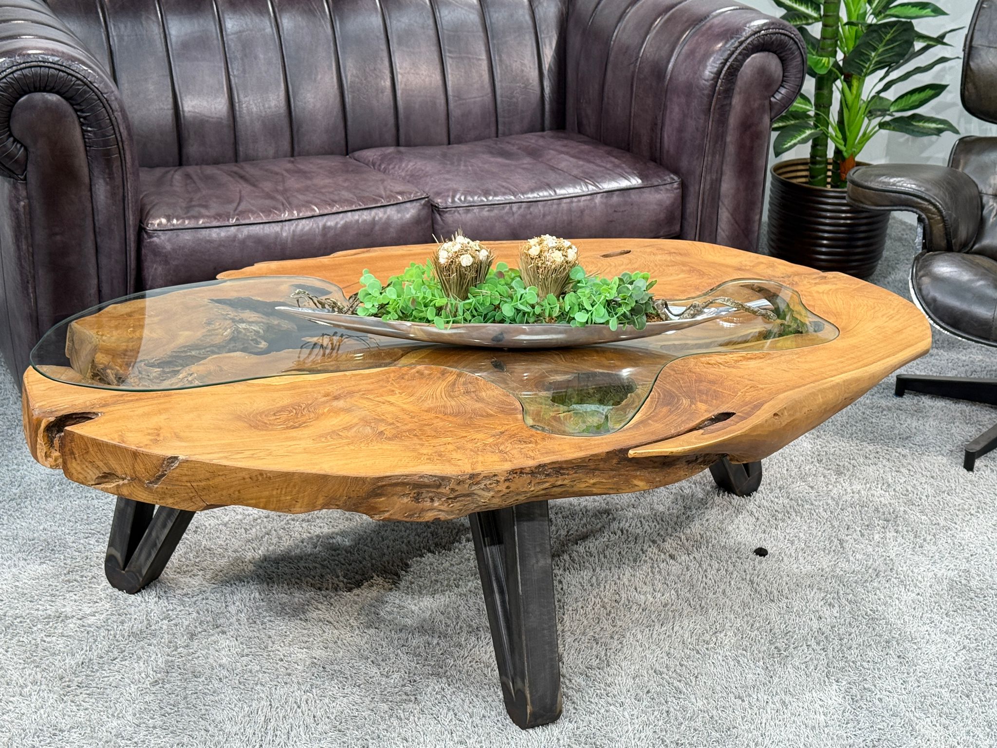 Dieser Wohnzimmertisch aus recyceltem Holz wurde in einzigartiger handwerklicher Verarbeitung gefertigt. Die natürlichen Strukturen der Baumscheiben bleiben erhalten, während die Glasplatte in der Mitte für eine ästhetische und funktionale Ergänzung sorgt. Der Wohnzimmertisch "Lakeside" trägt das Design der Natur. Wir können nur die wunderschönen Formen veredeln.
