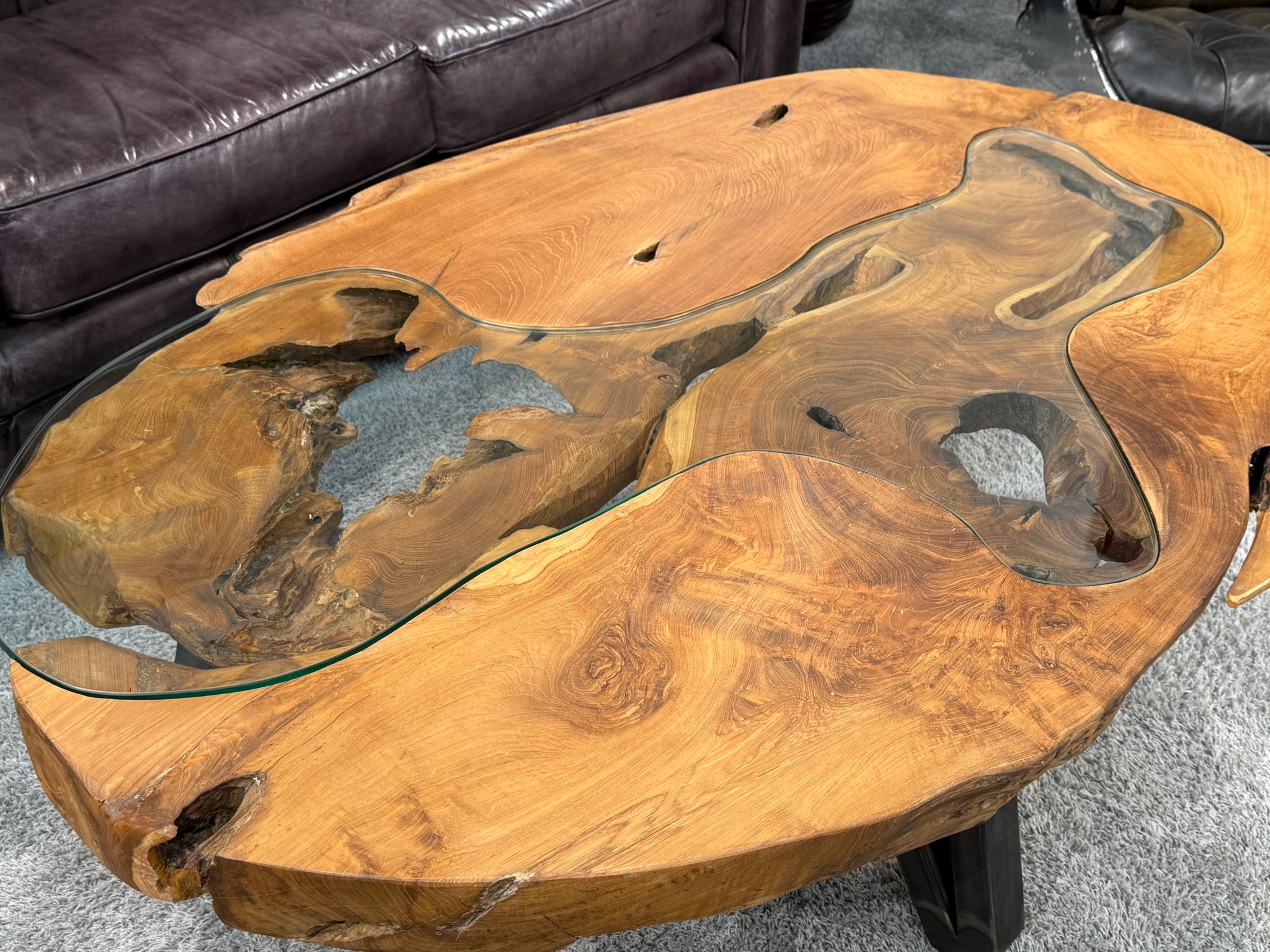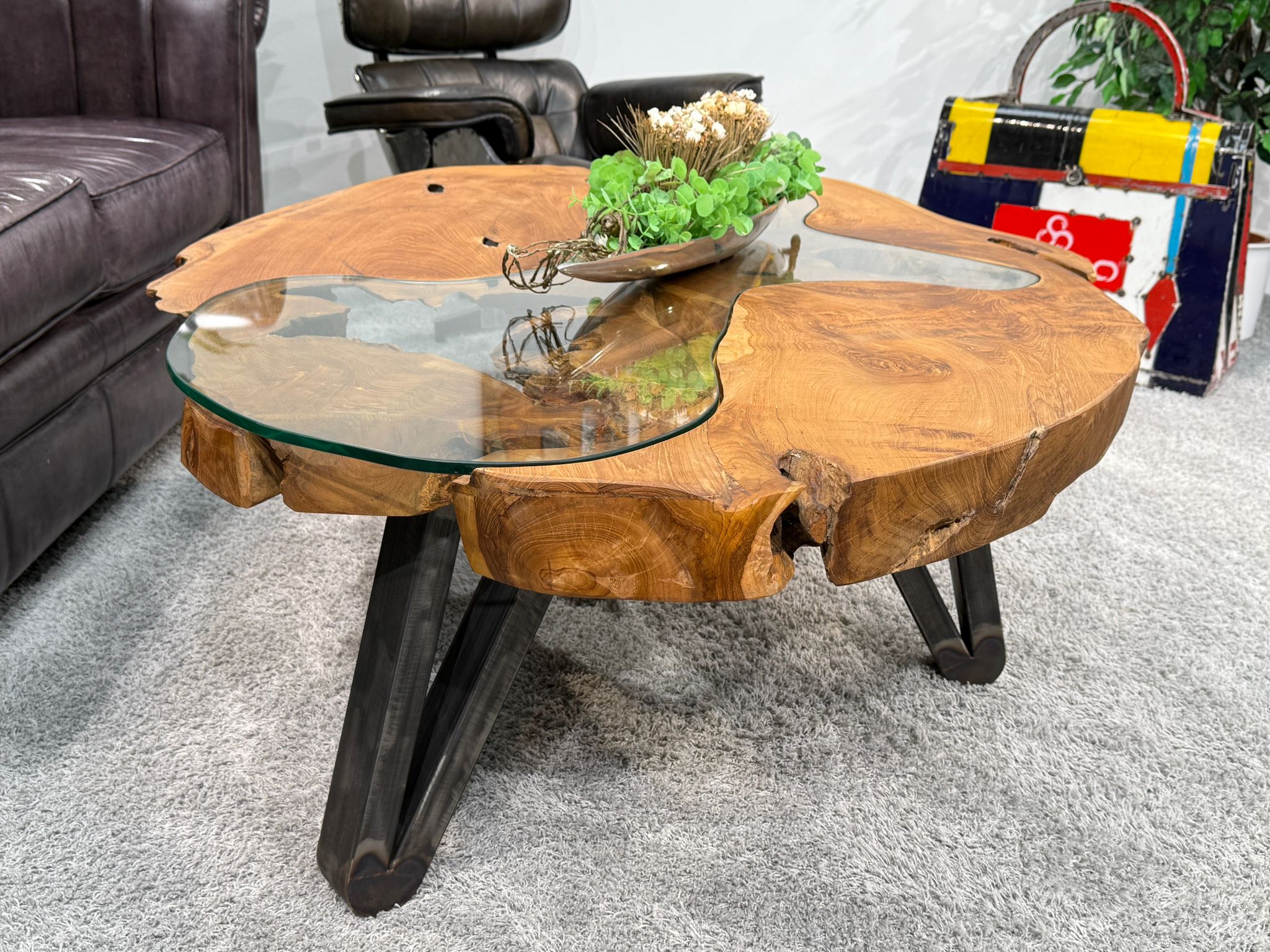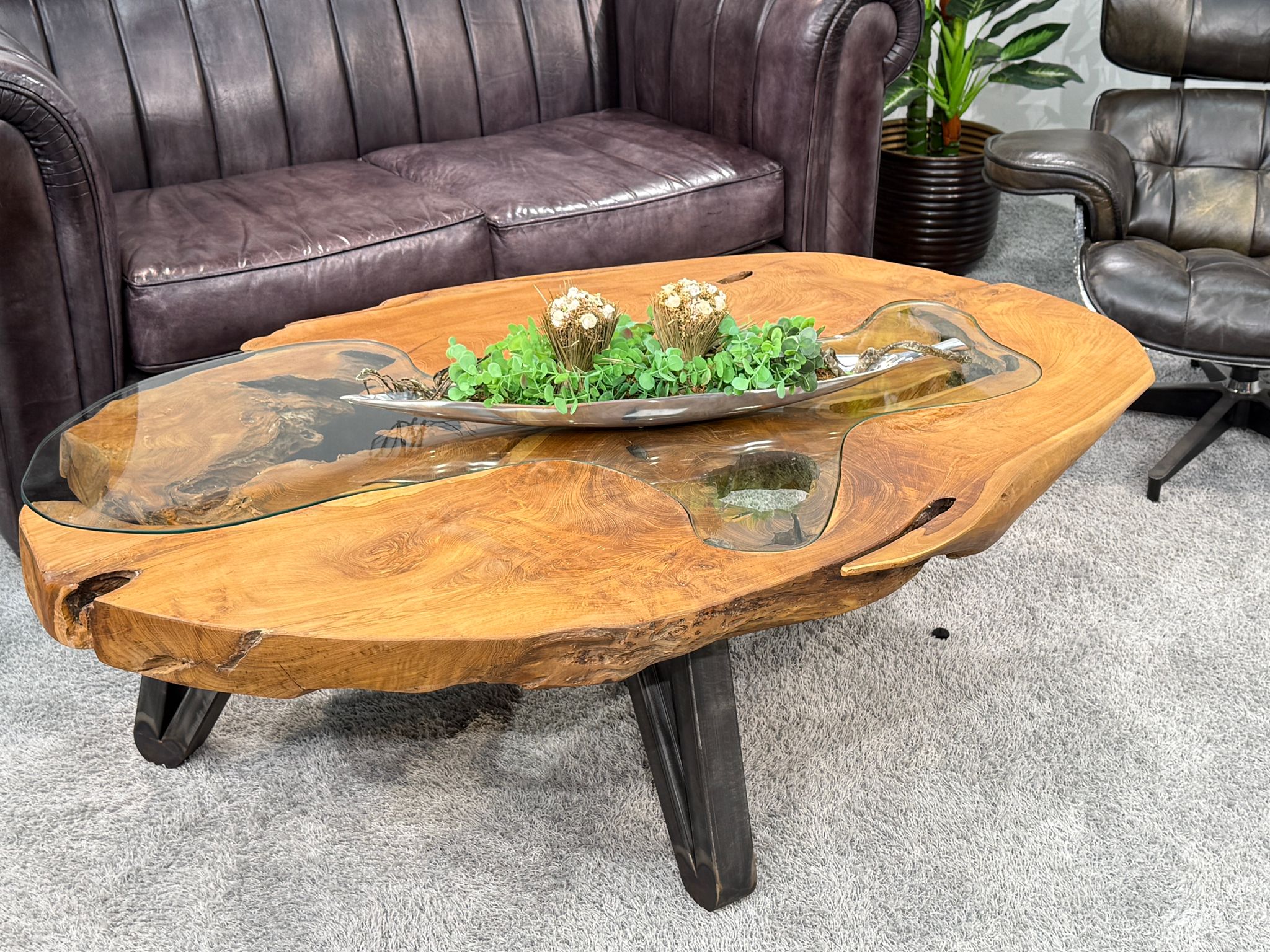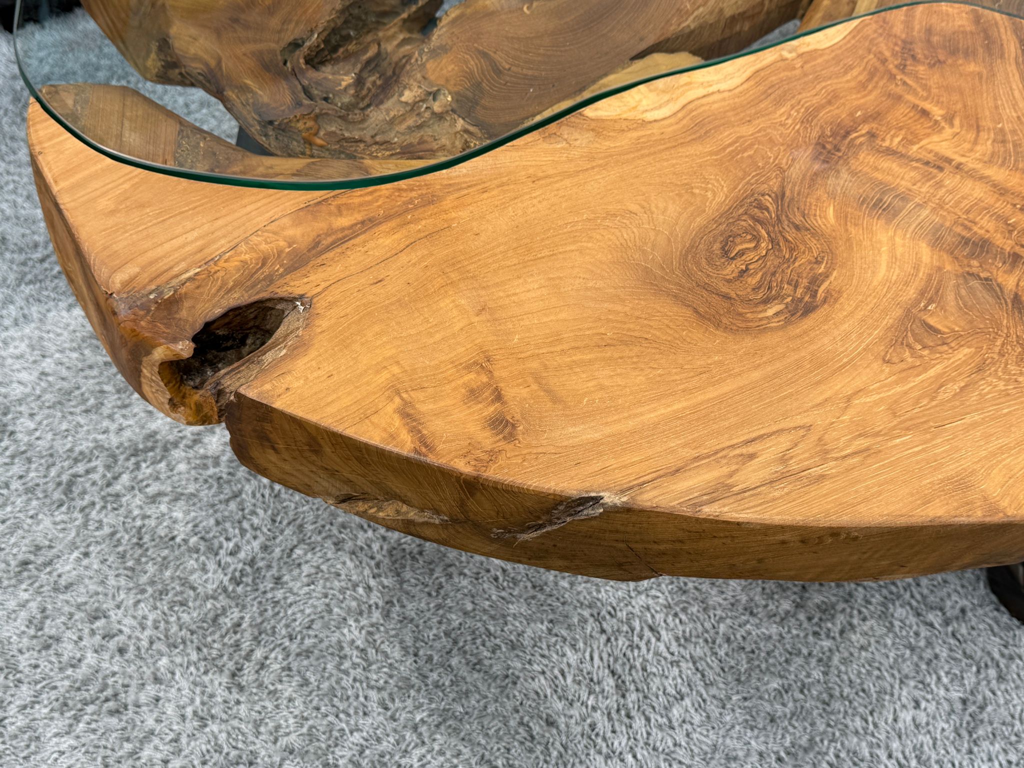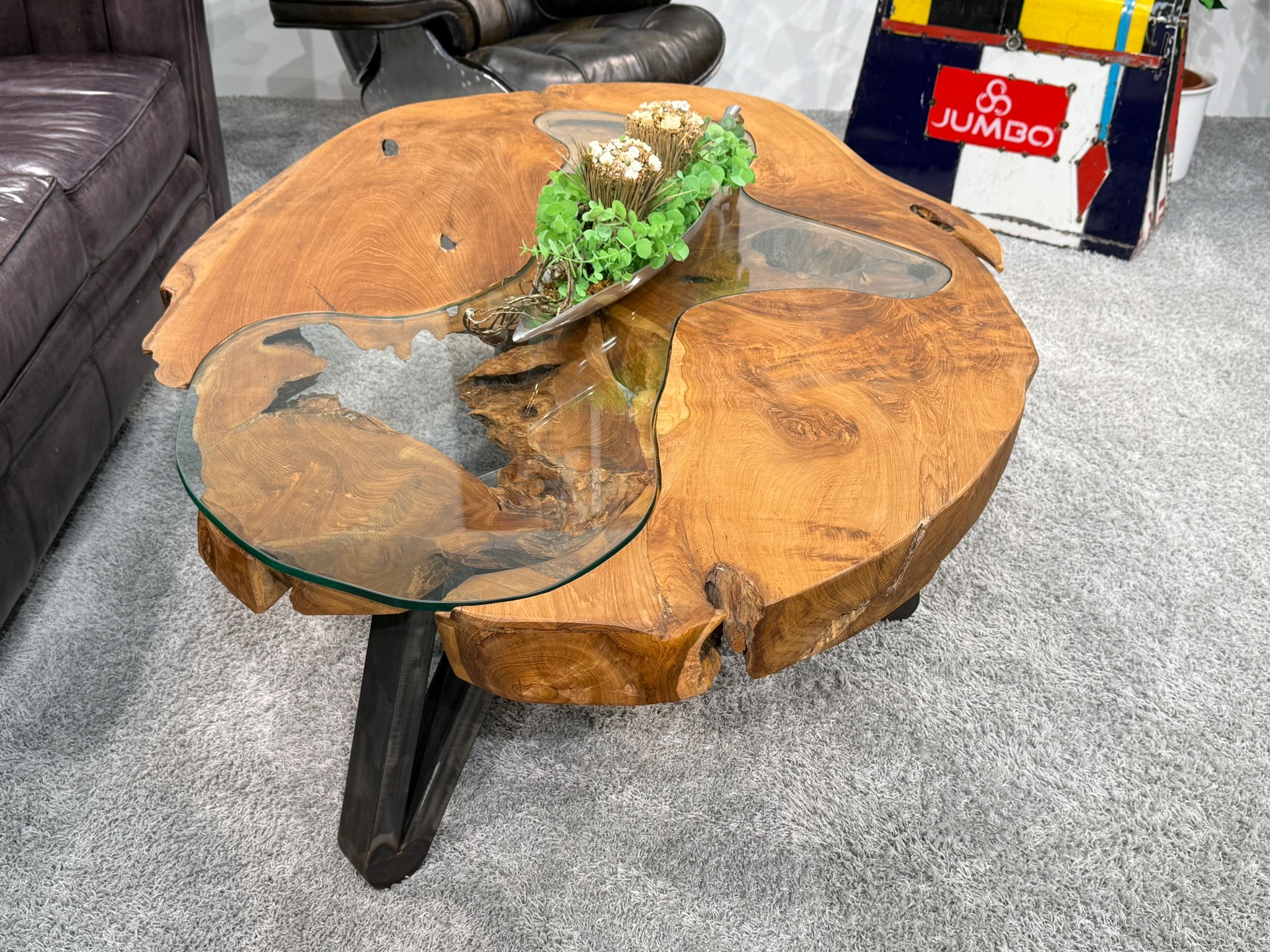 Die Tischplatte besteht aus zwei verleimten Baumscheiben, die aus antiken Baumstämmen aus Wiederaufforstungsgebieten der Inseln Java und Bali stammen. Die natürliche Wildkante in der Mitte der Tischplatte wurde bewusst erhalten und mit einer handgefertigten Glasplatte ergänzt.