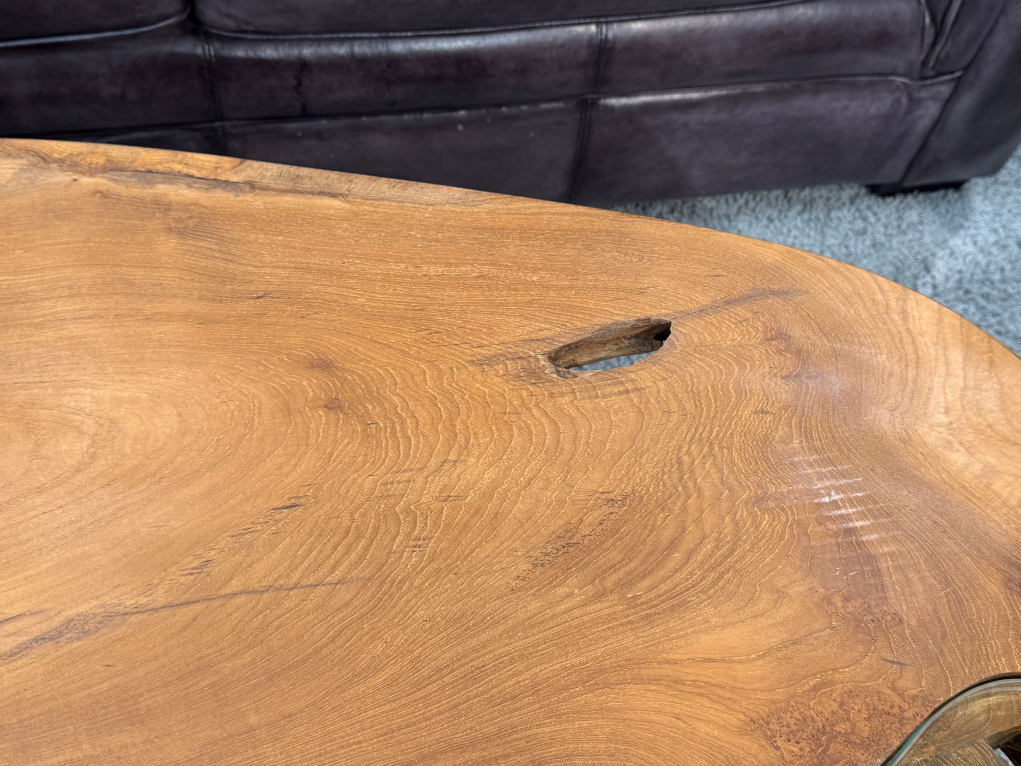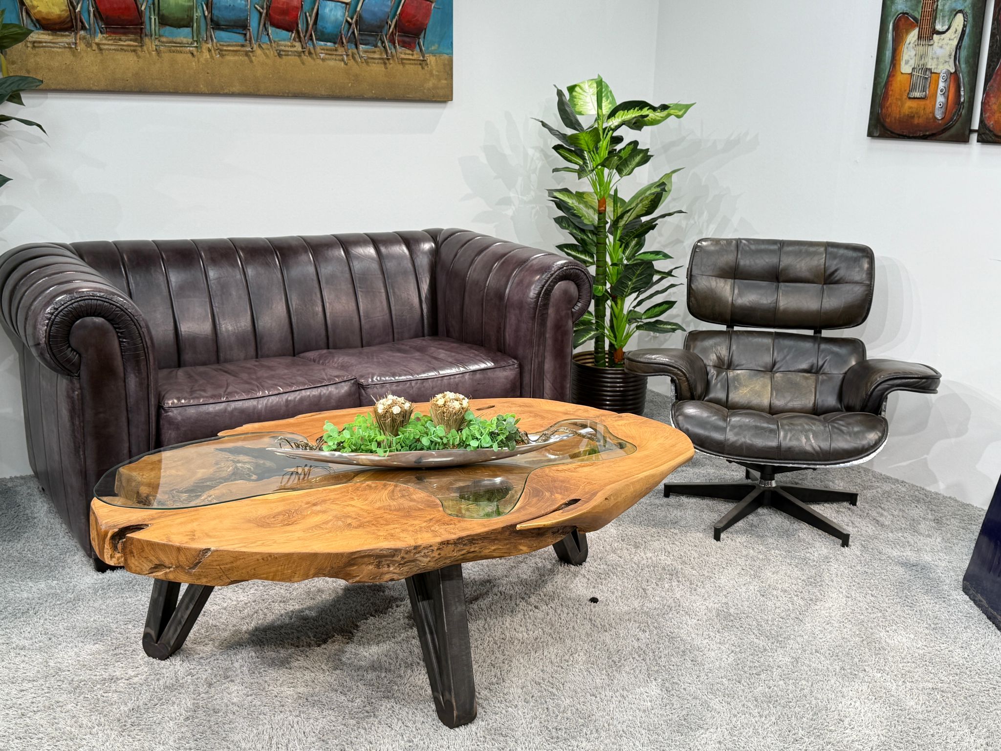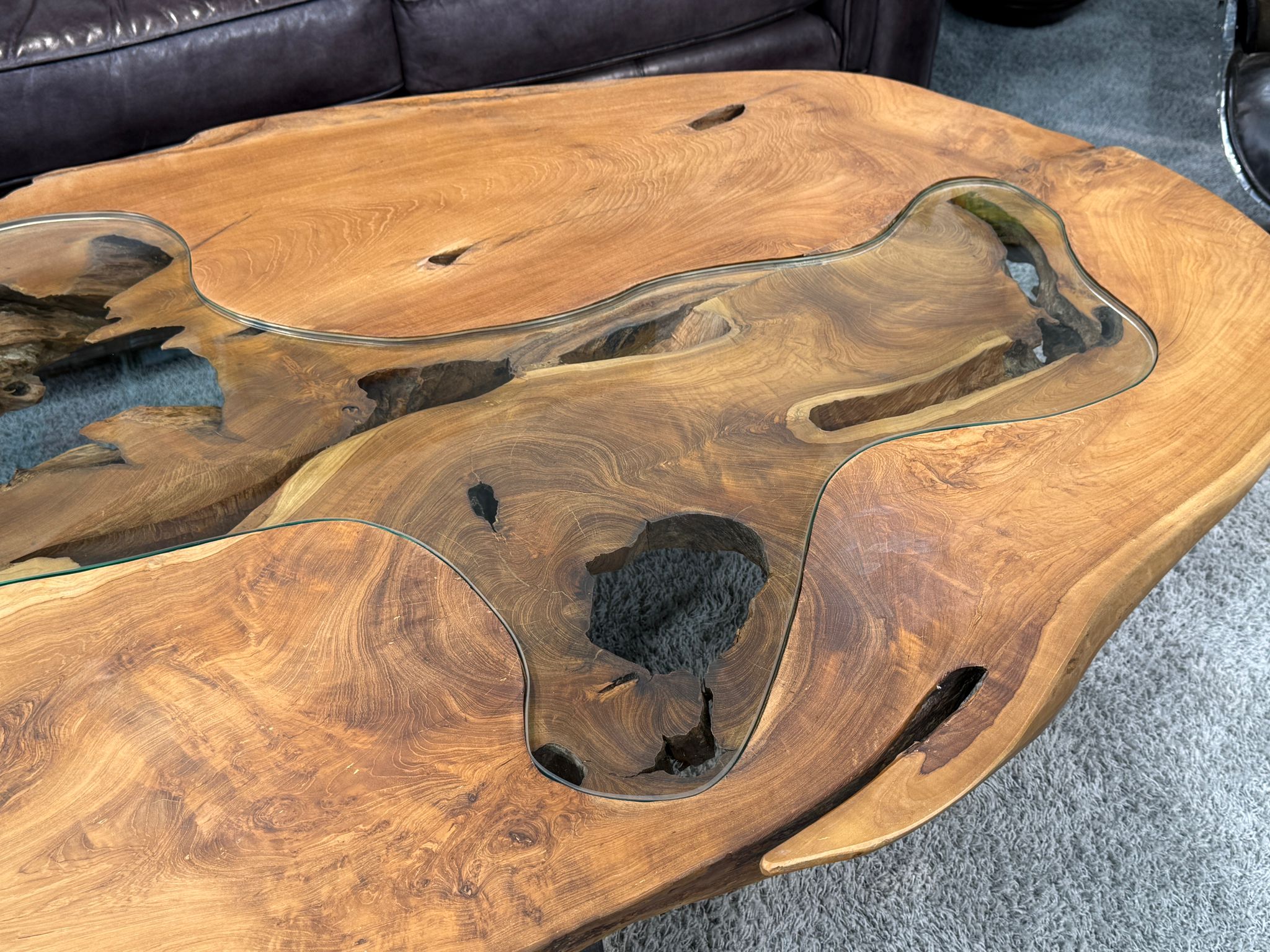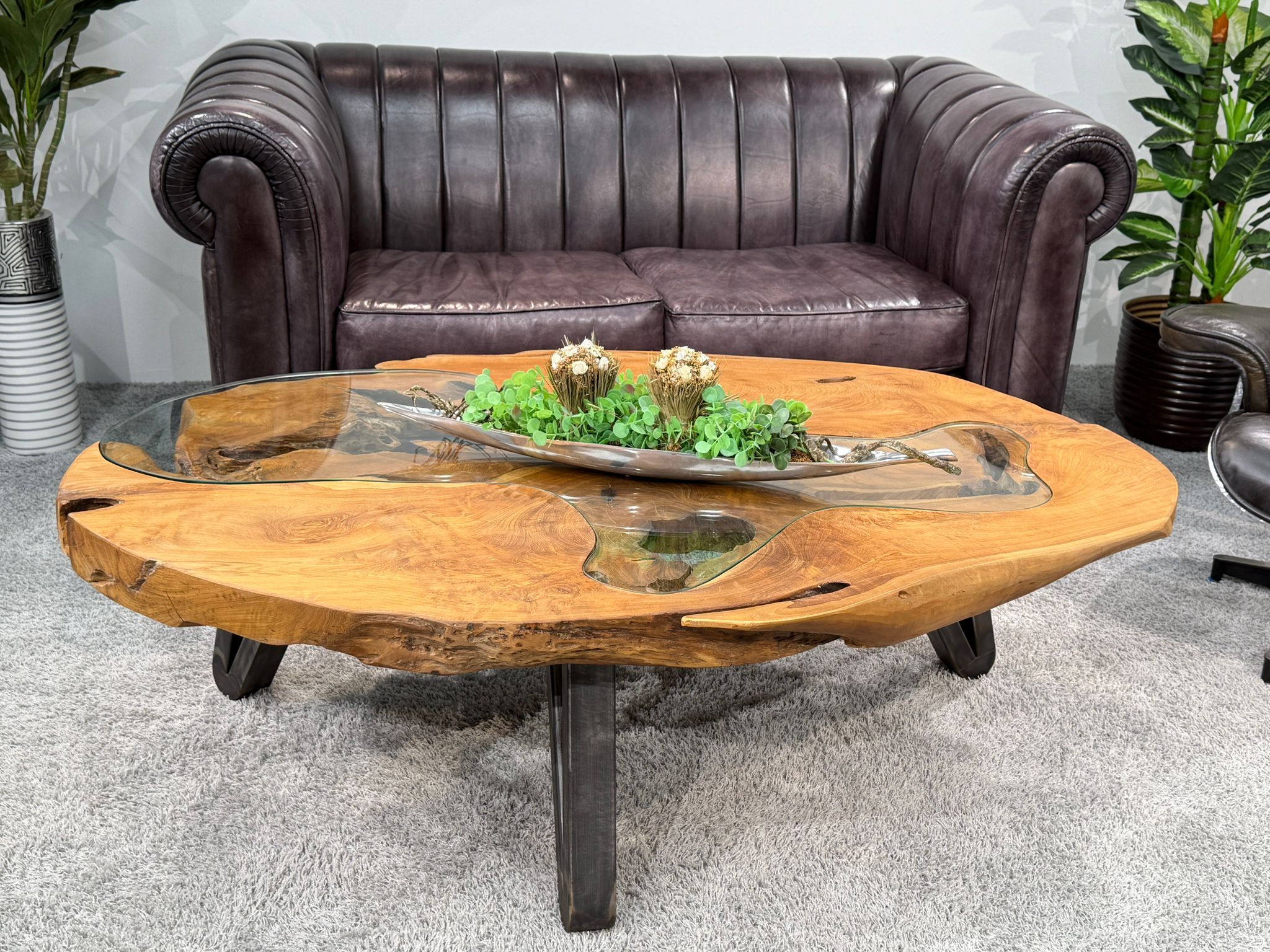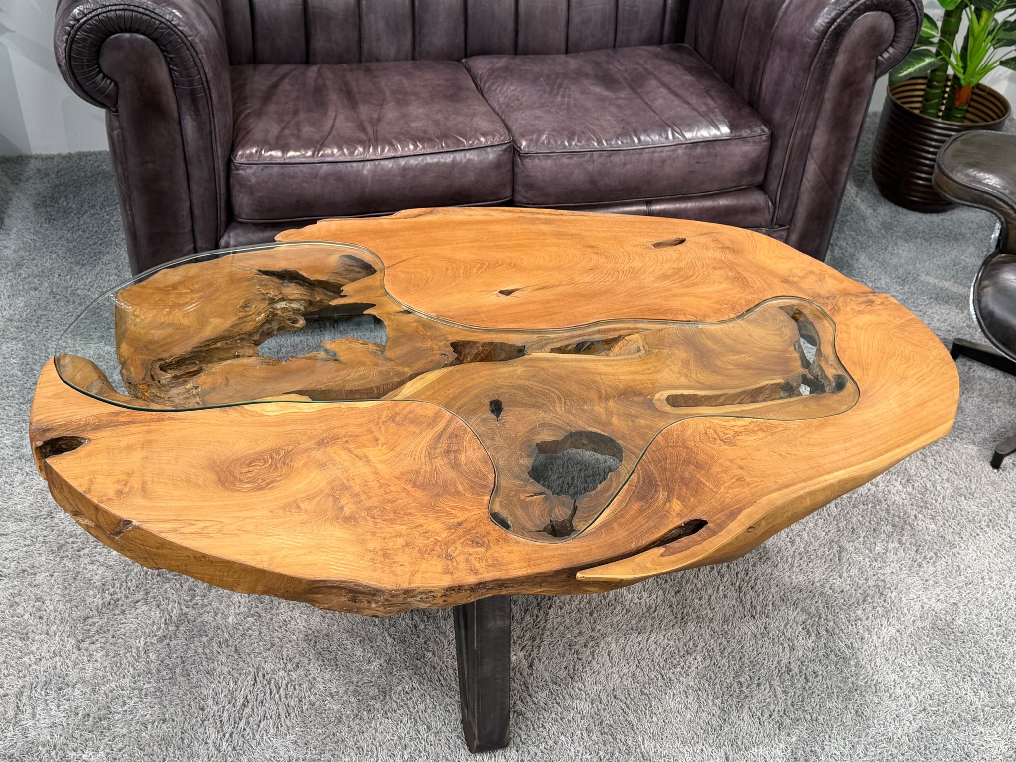 Die Tischplatte besteht aus zwei verleimten Baumscheiben, die aus antiken Baumstämmen aus Wiederaufforstungsgebieten der Inseln Java und Bali stammen. Die natürliche Wildkante in der Mitte der Tischplatte wurde bewusst erhalten und mit einer handgefertigten Glasplatte ergänzt.