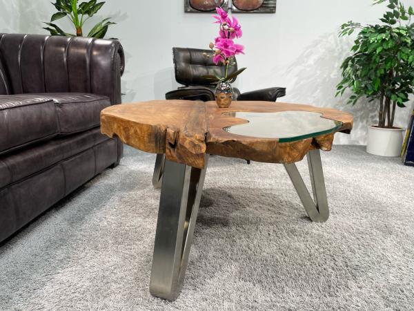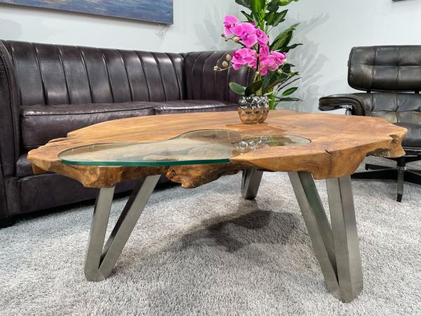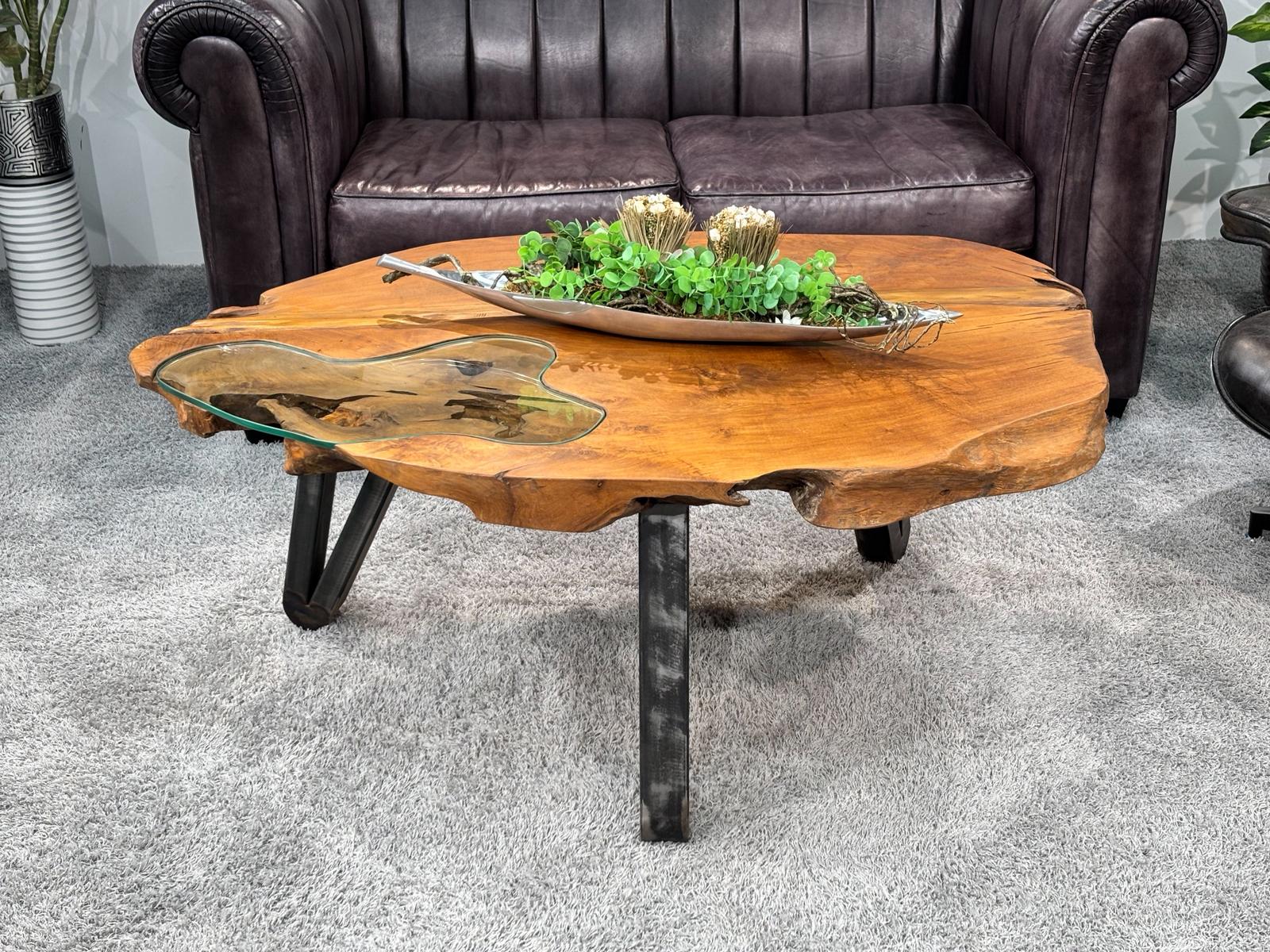 Für die Tischplatte wurden zwei antike Baumscheiben eines alten Teakbaumstumpfes sorgfältig miteinander verleimt. Dabei wurde bewusst darauf geachtet, dass die ursprünglichen Baumkanten und Spuren der natürlichen Verwitterung erhalten bleiben. Diese markanten Strukturen wurden im Innenbereich durch eine handgefertigte Glasplatte betont, die dem Tisch eine einzigartige Ästhetik verleiht.