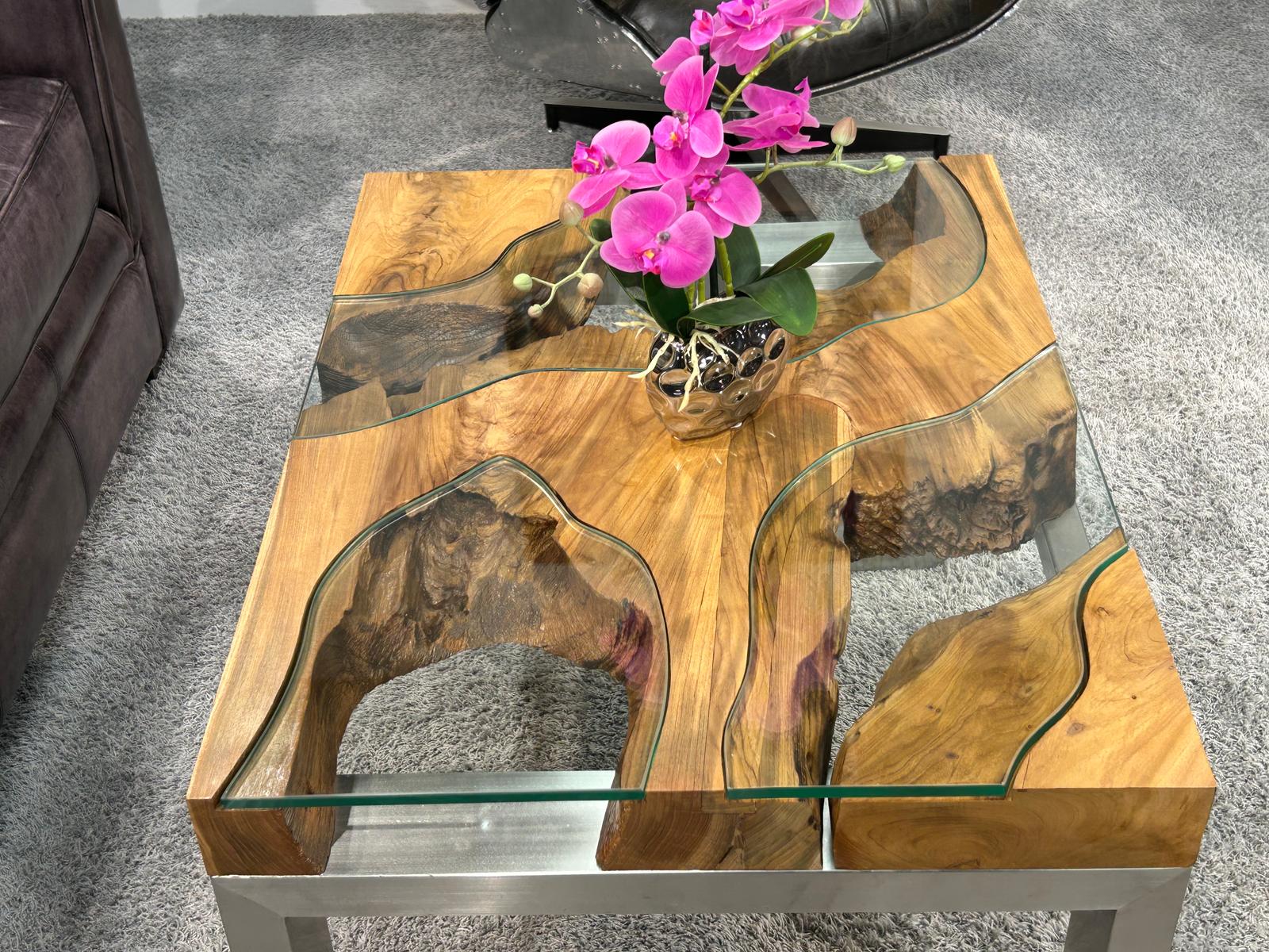 Die Tischplatte wurde aus massiven Baumscheiben alter Teakbaumstümpfe gefertigt. Das verwendete Holz stammt aus dem Bereich der Baumwurzel, was sich in einer besonders lebendigen Maserung und markanten Verwachsungen widerspiegelt. Diese natürlich entstandenen Formen wurden im Innenbereich der Tischplatte in reiner Handarbeit mit einer Glasplatte aus Freihandschnitt ergänzt. Die so geschaffene Ansicht gibt den Blick auf die ursprüngliche Struktur des Holzes frei – ein authentisches Detail, das jeder Tischplatte ihre ganz eigene Geschichte verleiht.