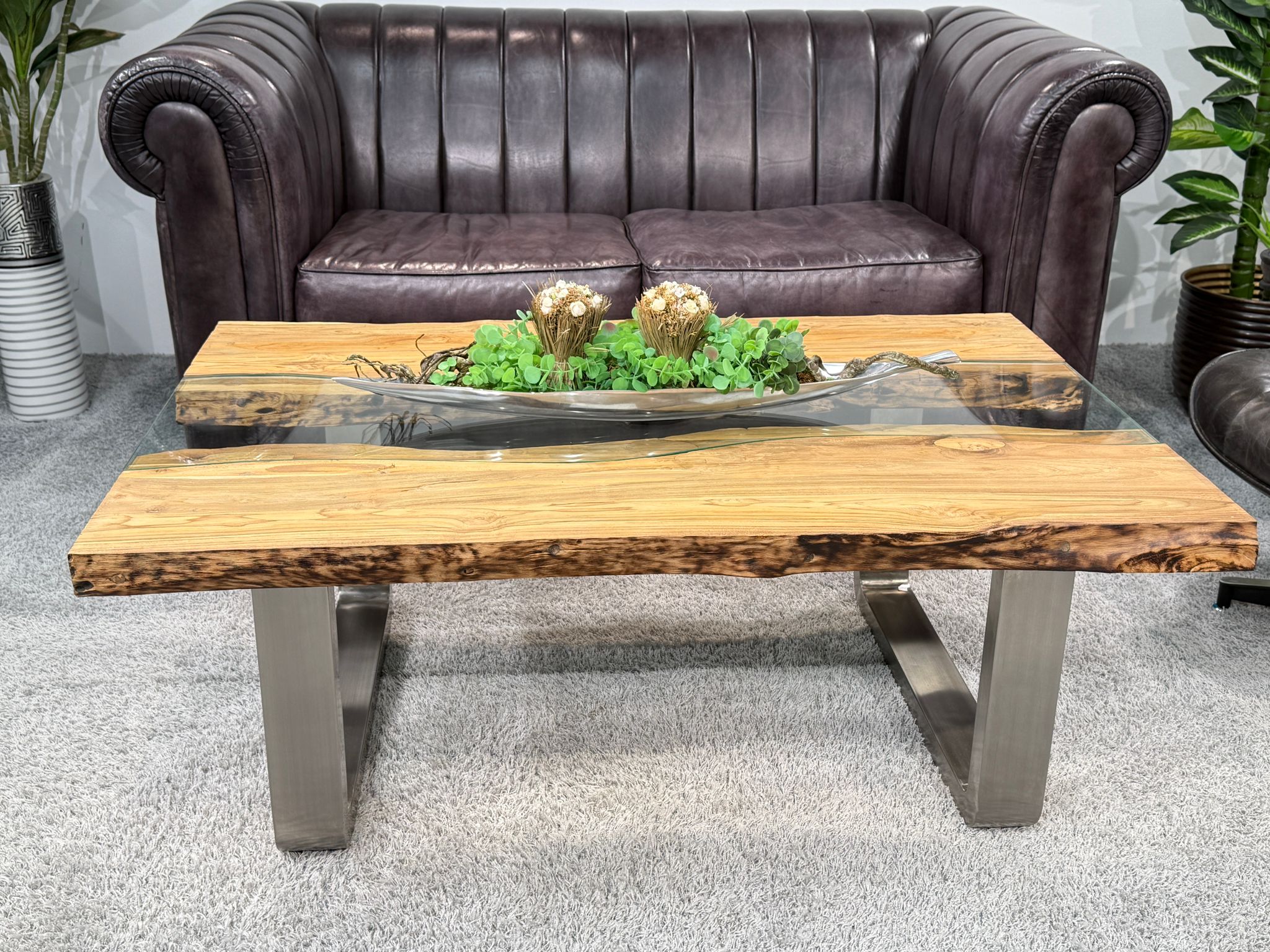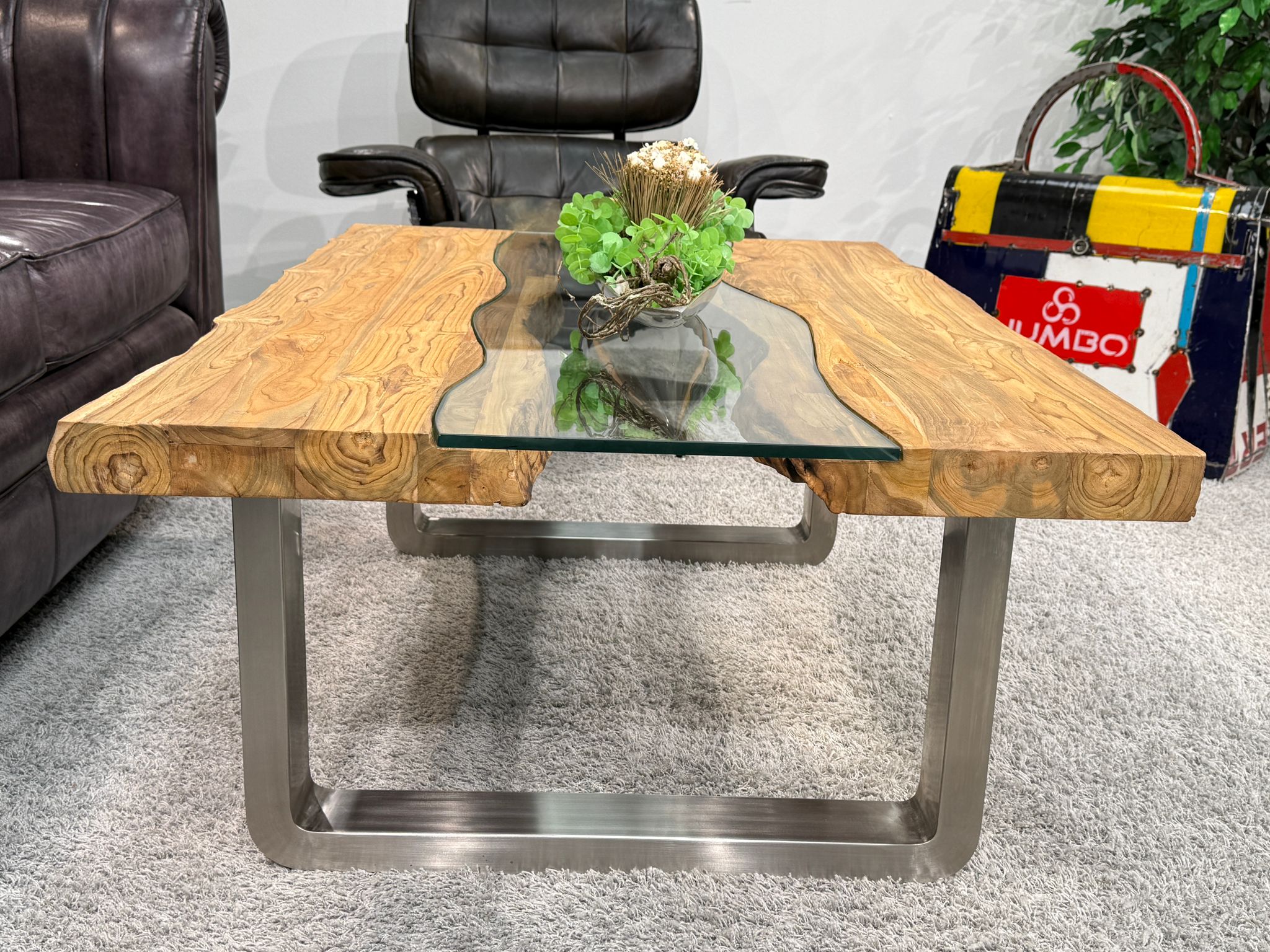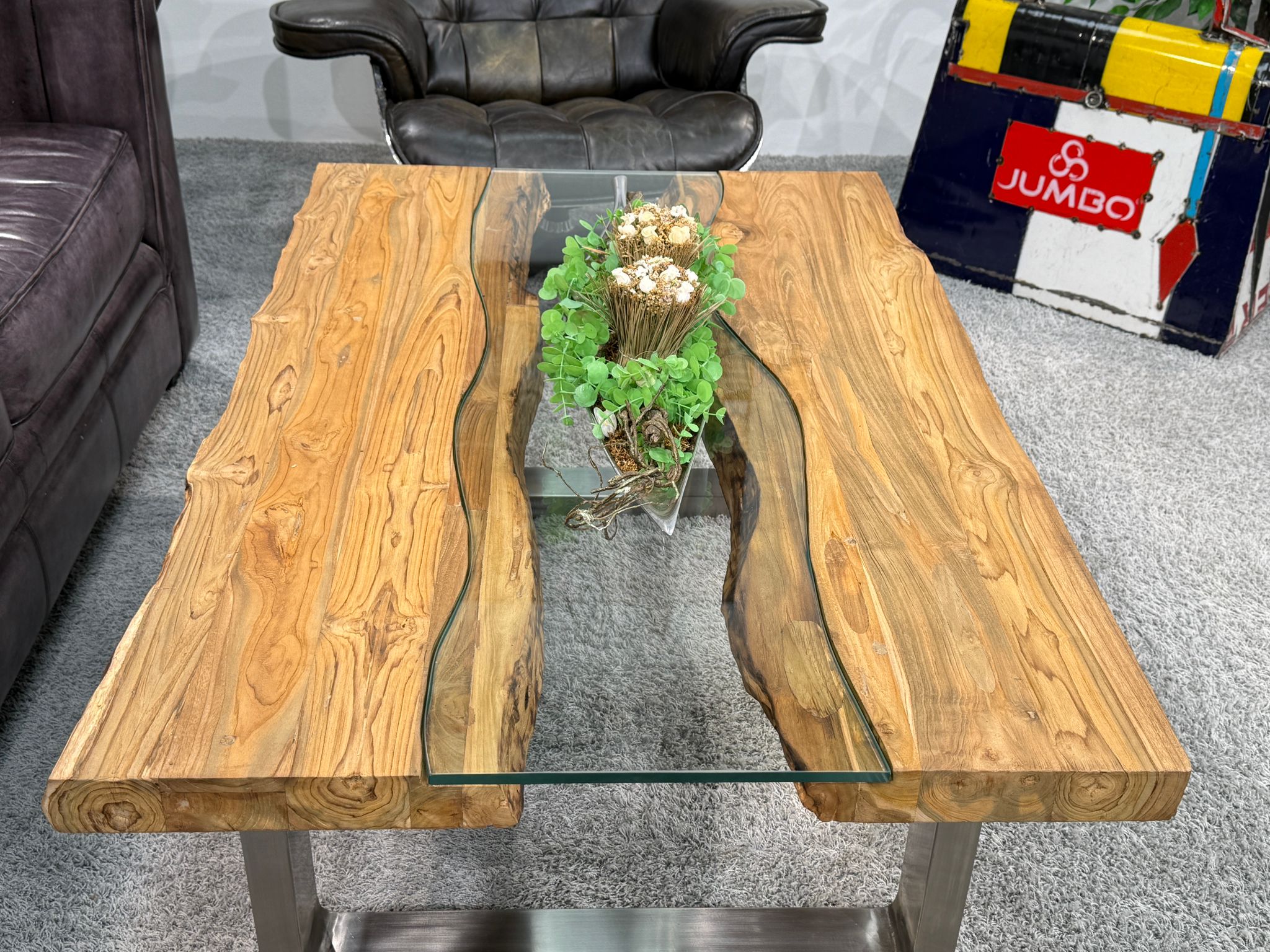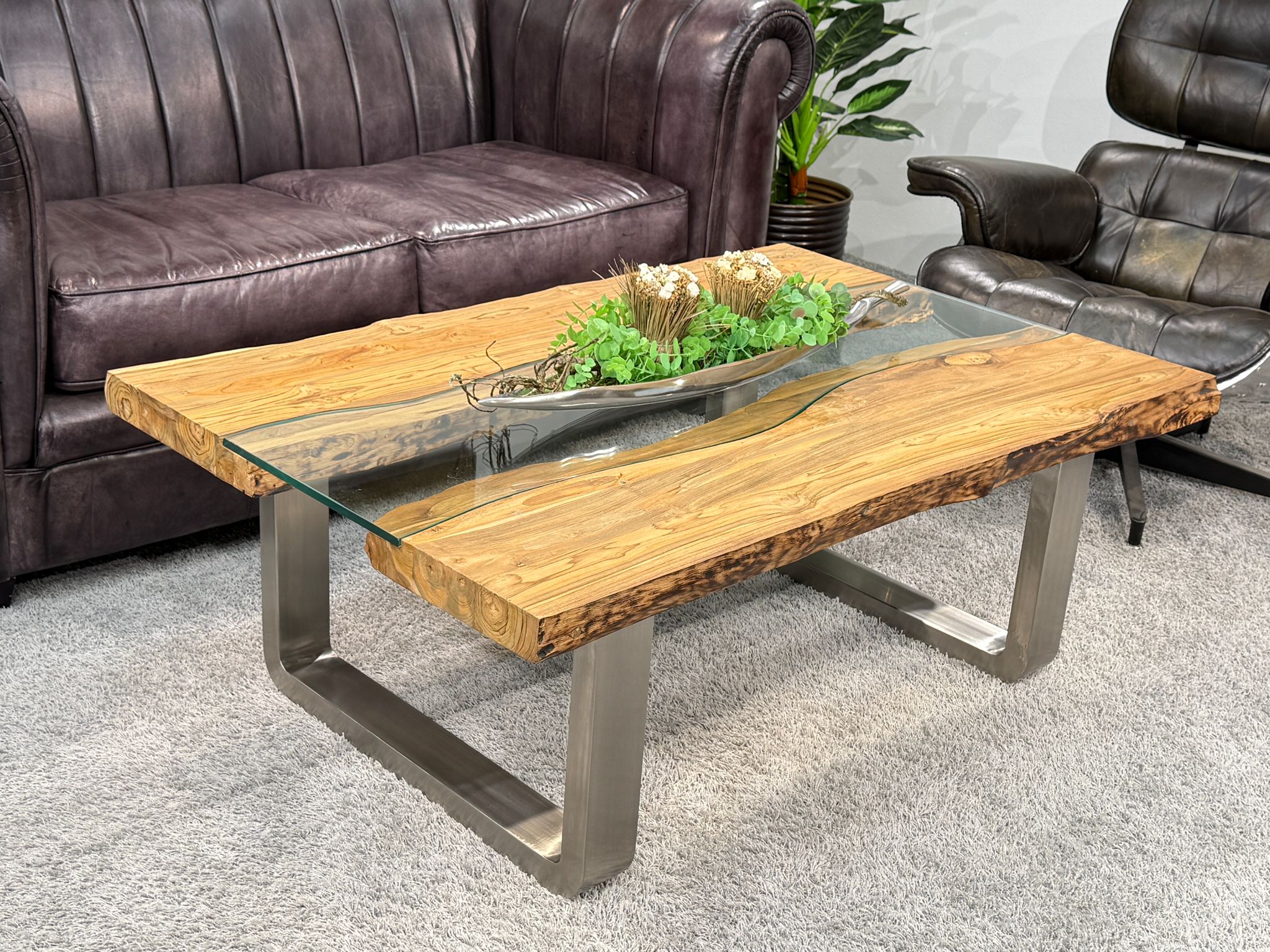 Echtholz-Wohnzimmertisch aus der Serie Old Elements :: Eine interessante Kombination aus Holz, Edelstahl und Glas