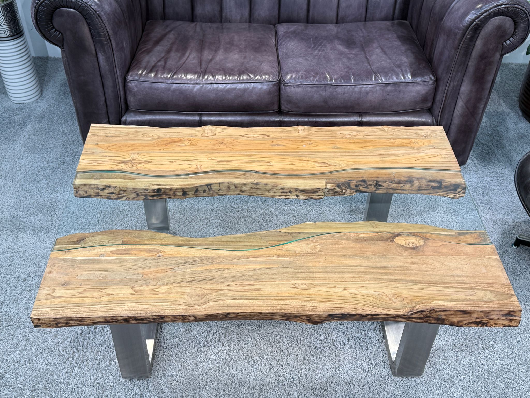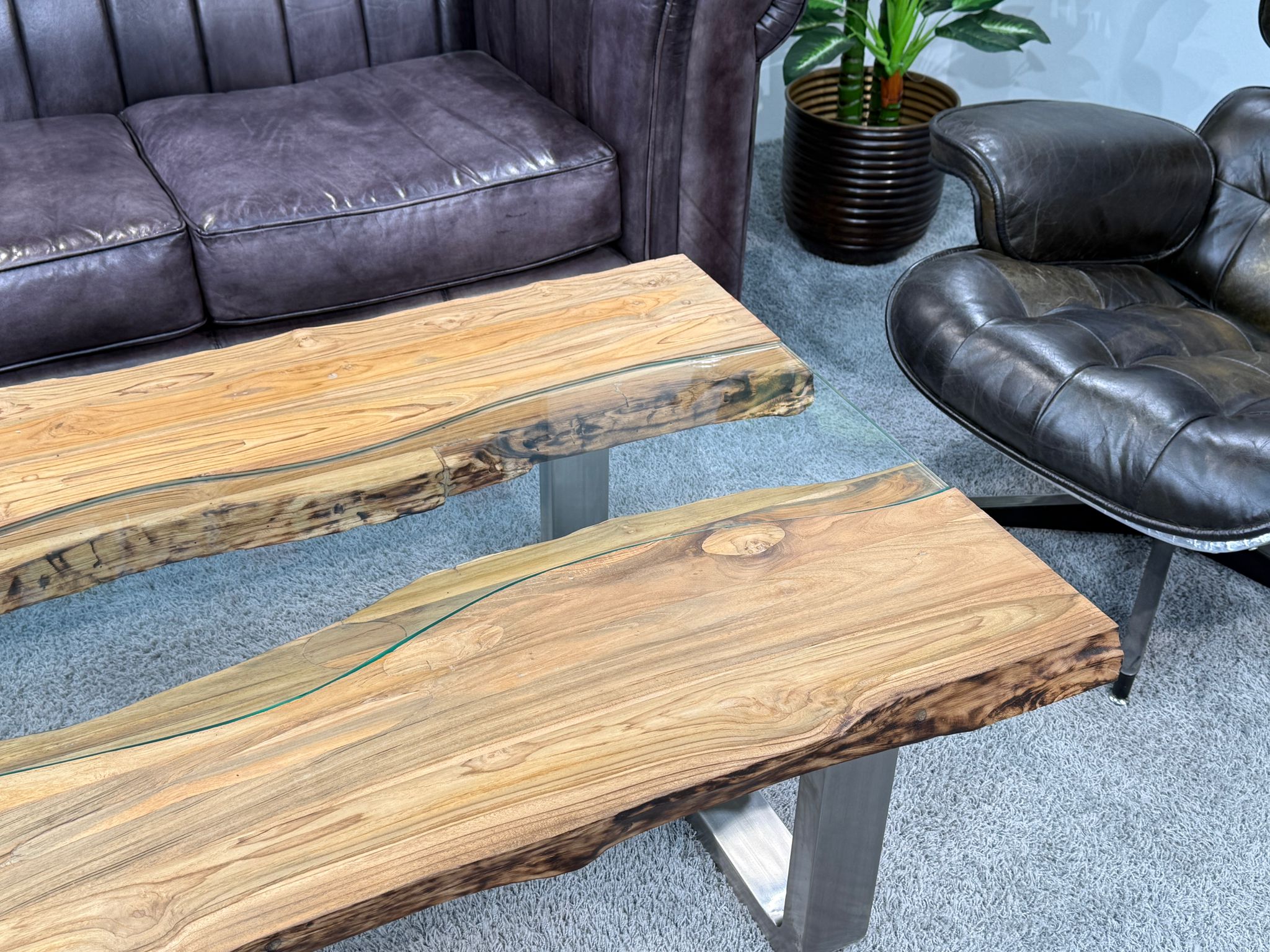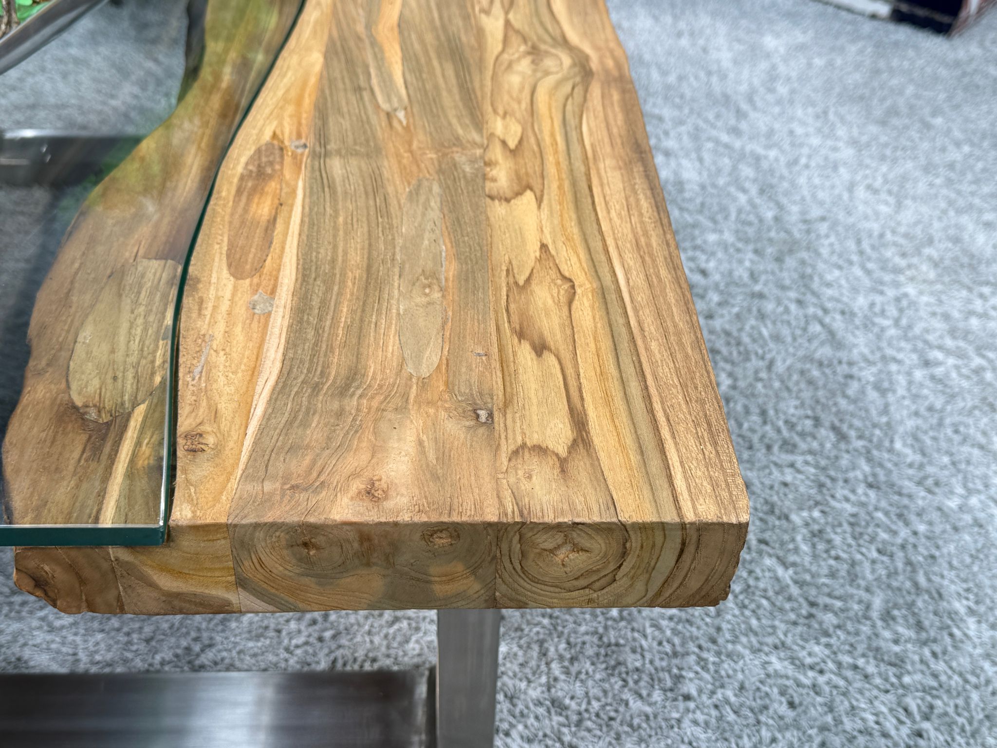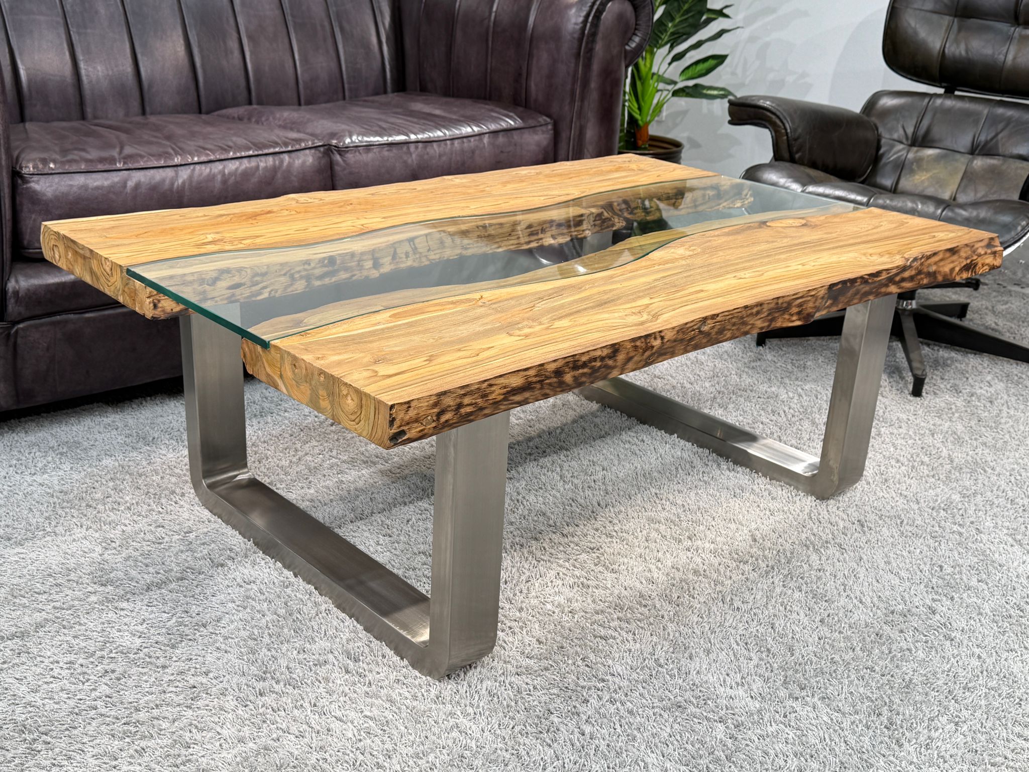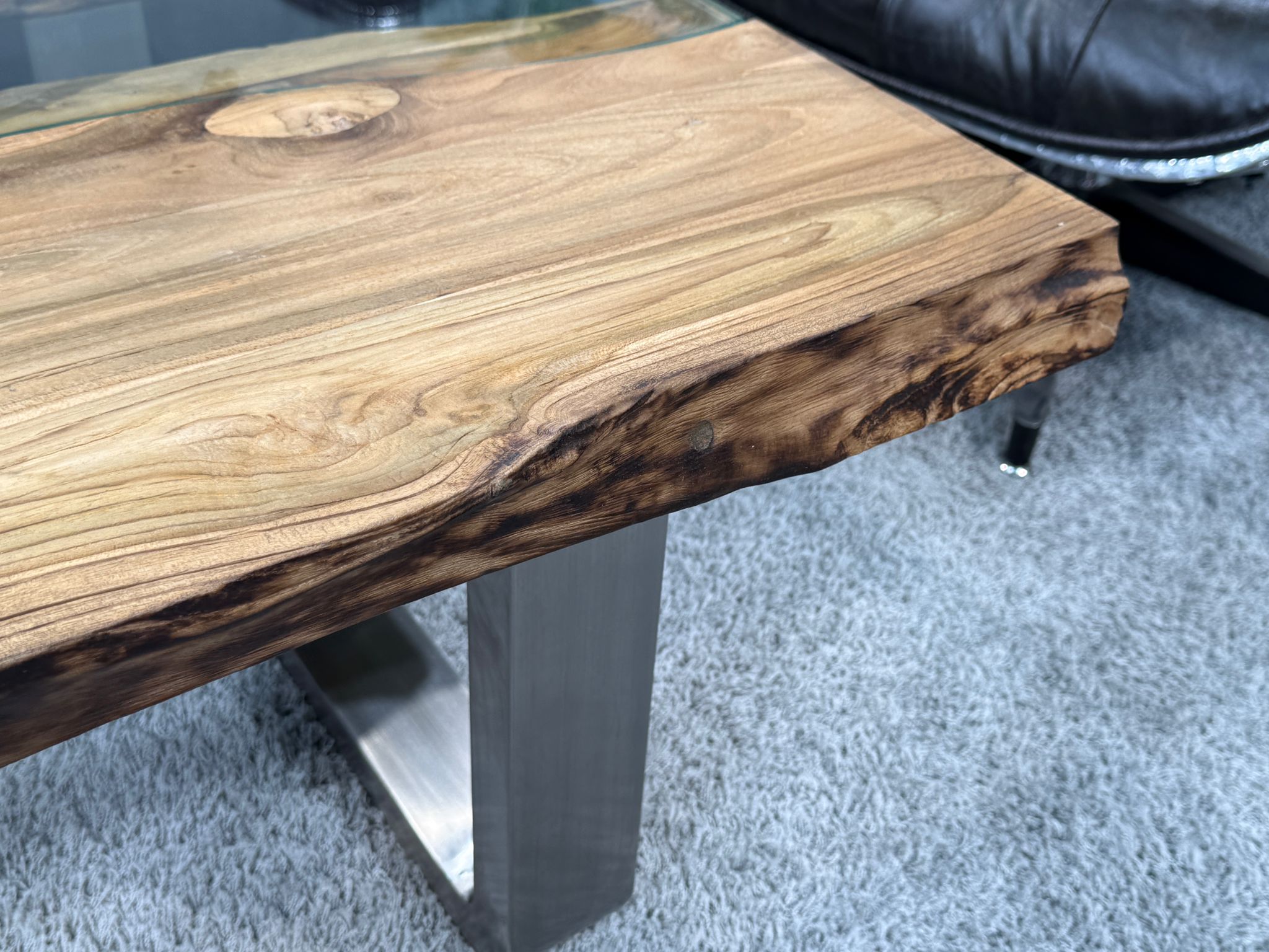 Echtholz-Wohnzimmertisch aus der Serie Old Elements :: Eine interessante Kombination aus Holz, Edelstahl und Glas