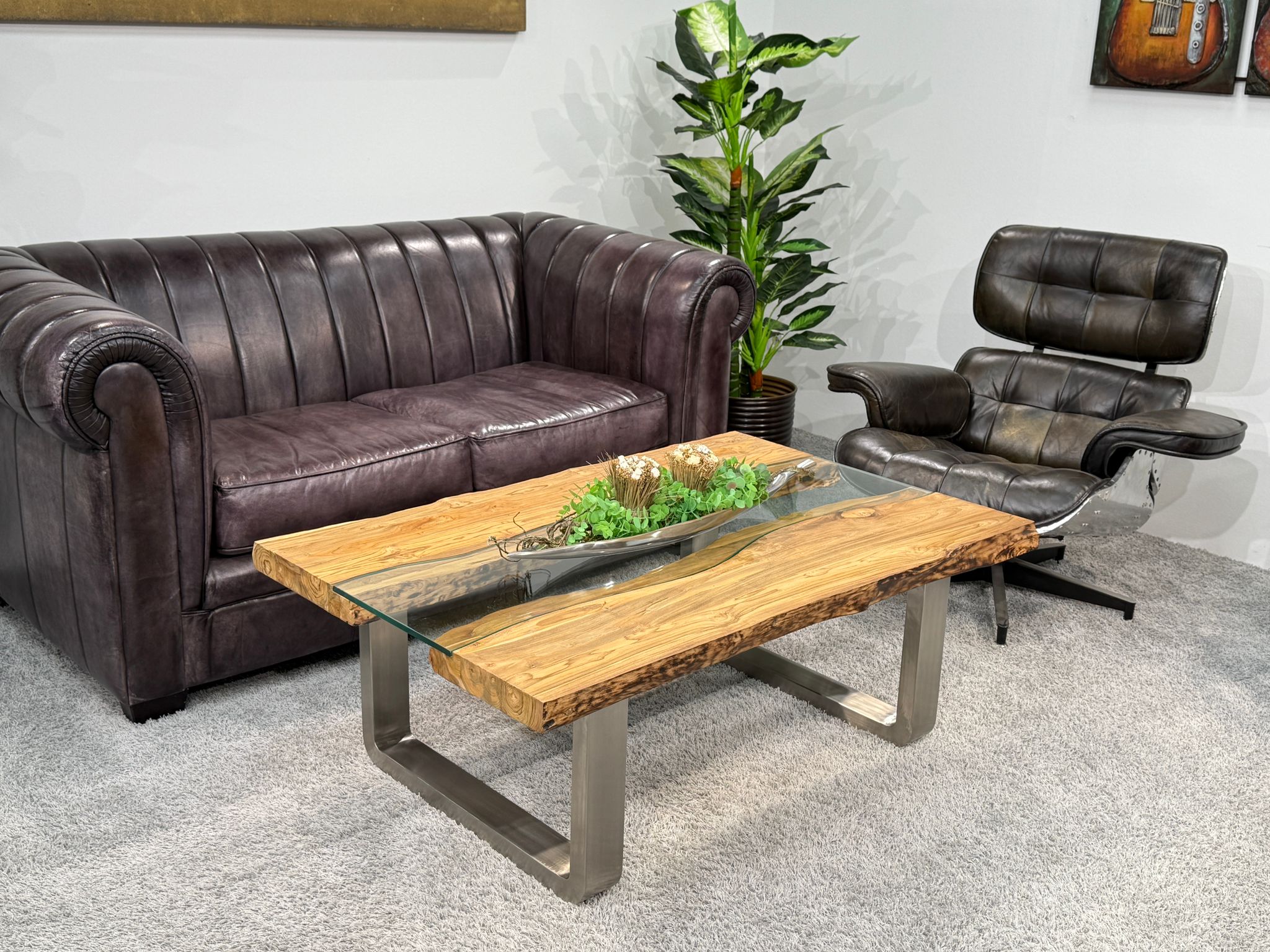Der Echtholz Wohnzimmertisch aus der Serie Old Elements beeindruckt durch die harmonische Kombination aus natürlichen Materialien und modernen Akzenten. Die Verbindung von Massivholz mit handgearbeiteten Baumkanten und einer kunstvollen Glaseinlage macht diesen Tisch zu einem echten Highlight in Ihrem Wohnzimmer. Die klaren Linien des Edelstahlgestells setzen einen modernen Kontrast und runden das Design ab.