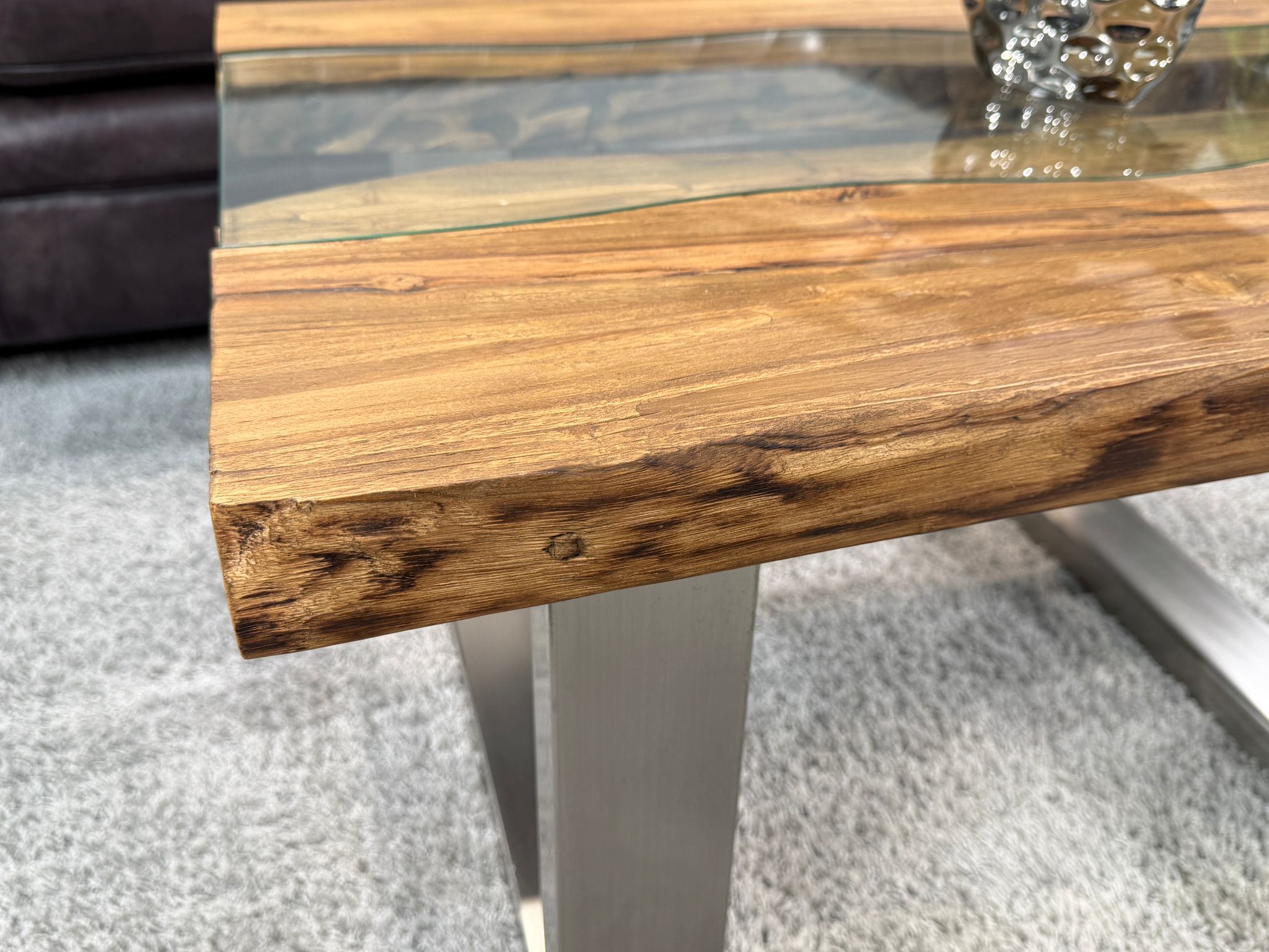 Couchtisch "Old Elements" aus recyceltem Teakholz mit Edelstahlgestell und eingefrästem Glas