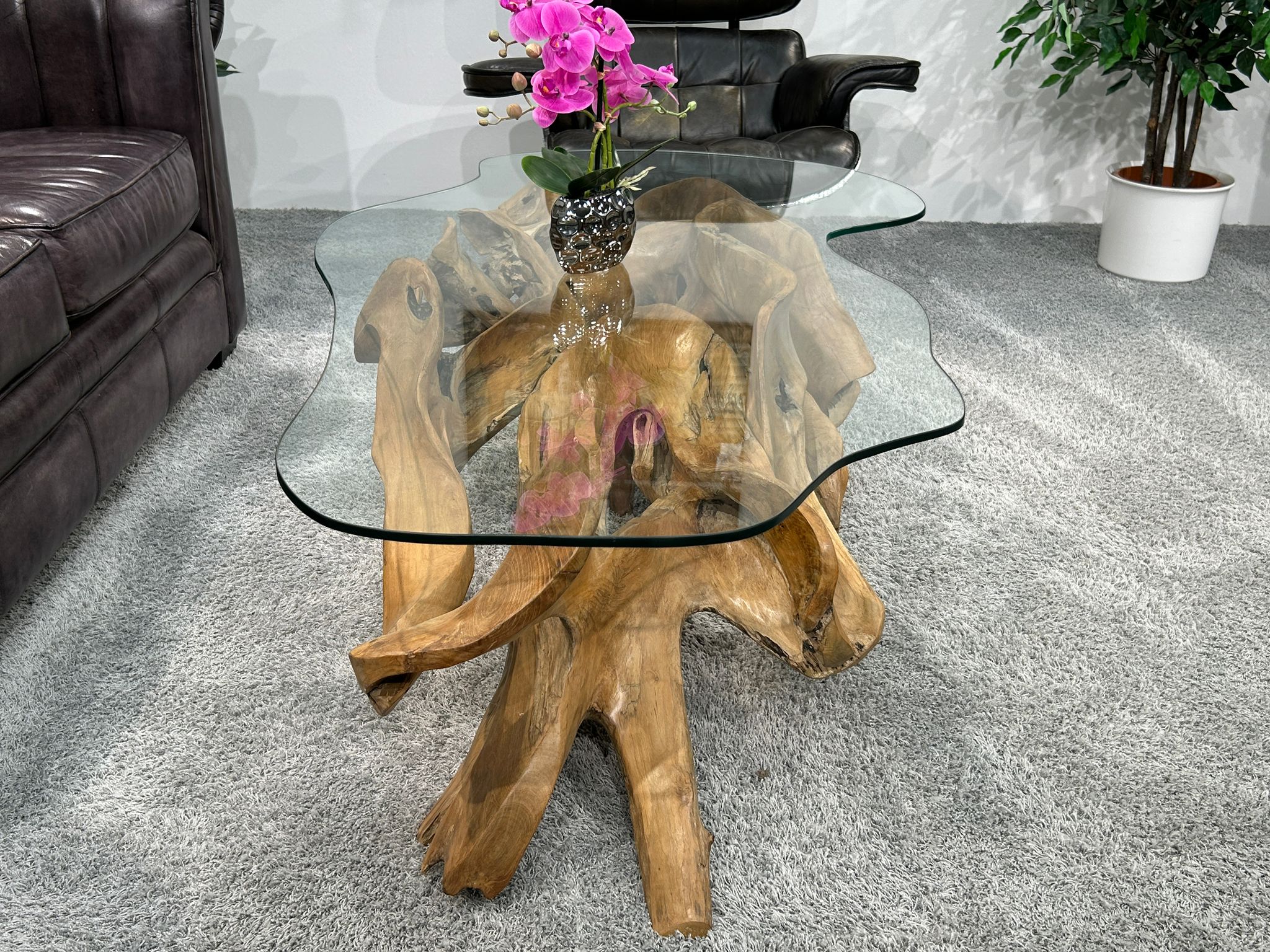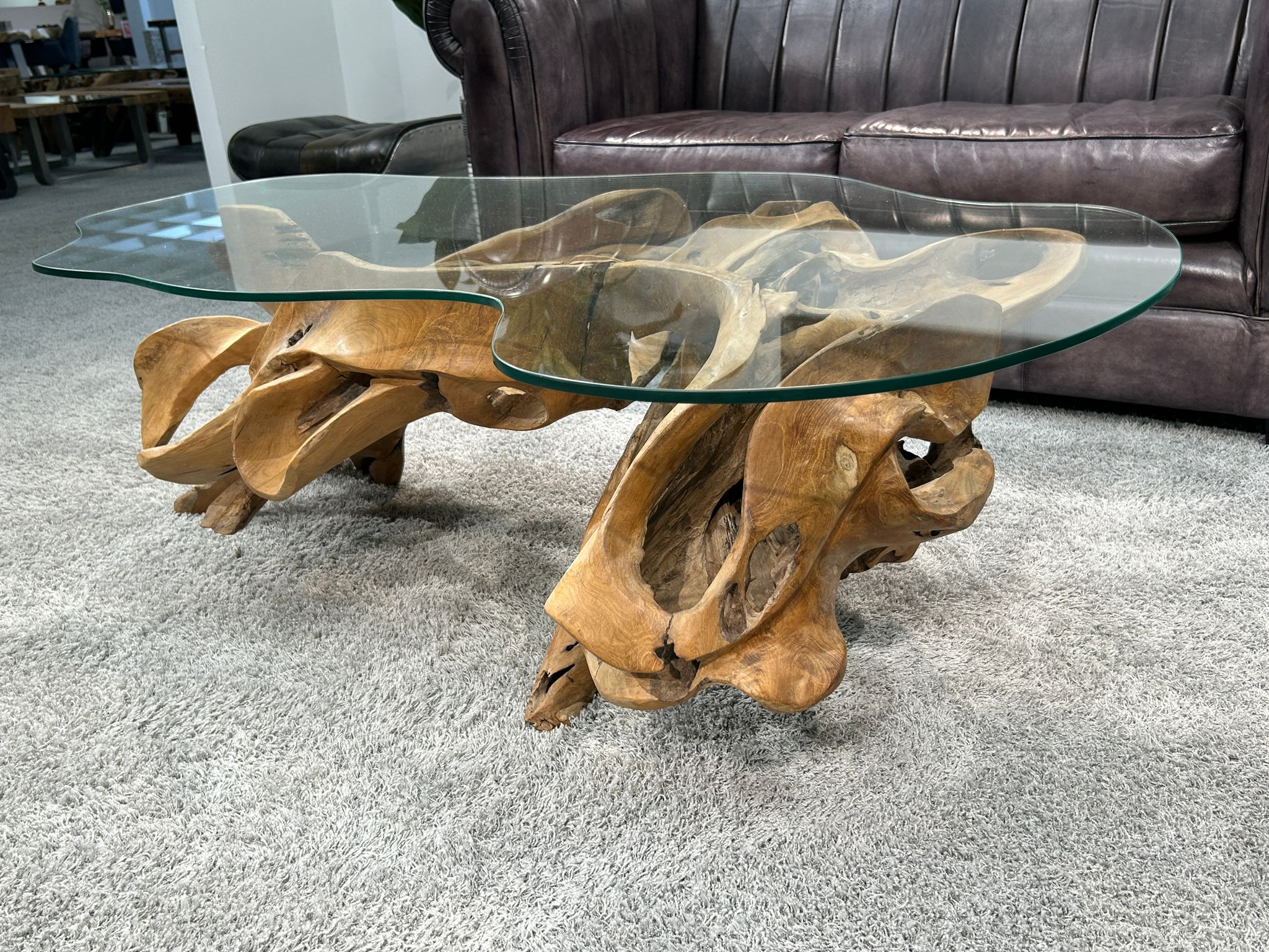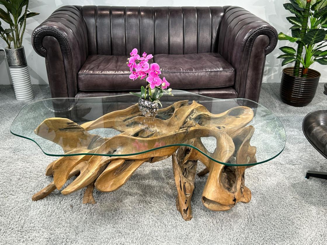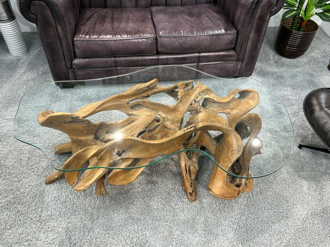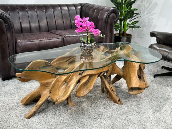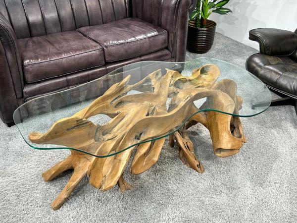 Handgeschnitzter Wohnzimmertisch aus einer Teak Baumwurzel mit Glasplatte