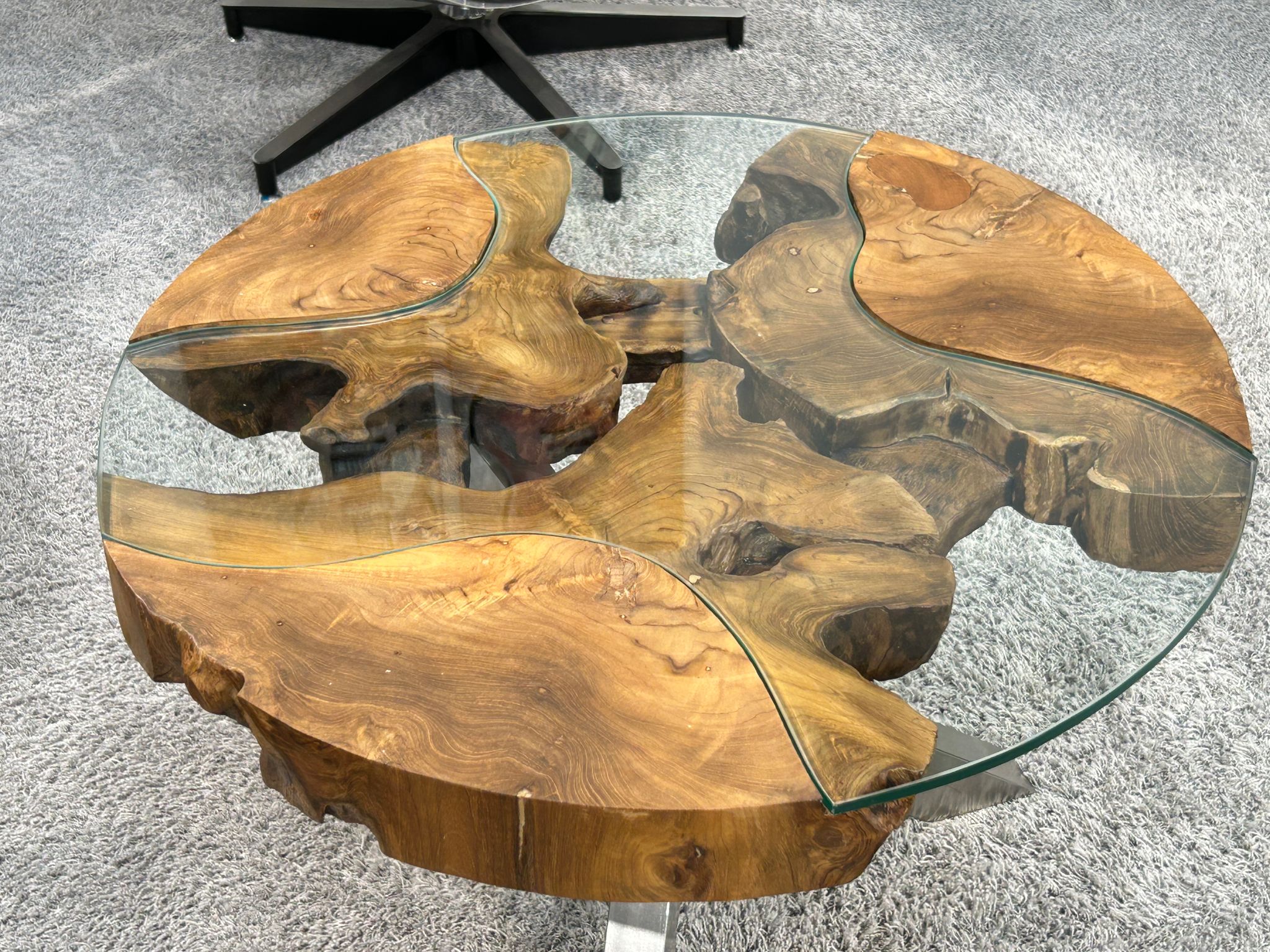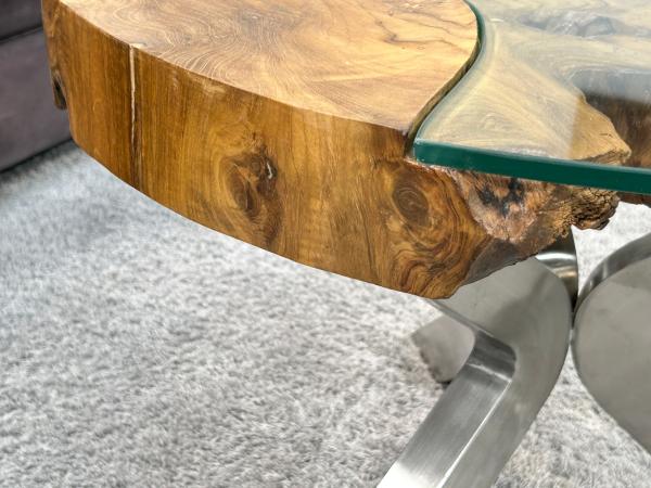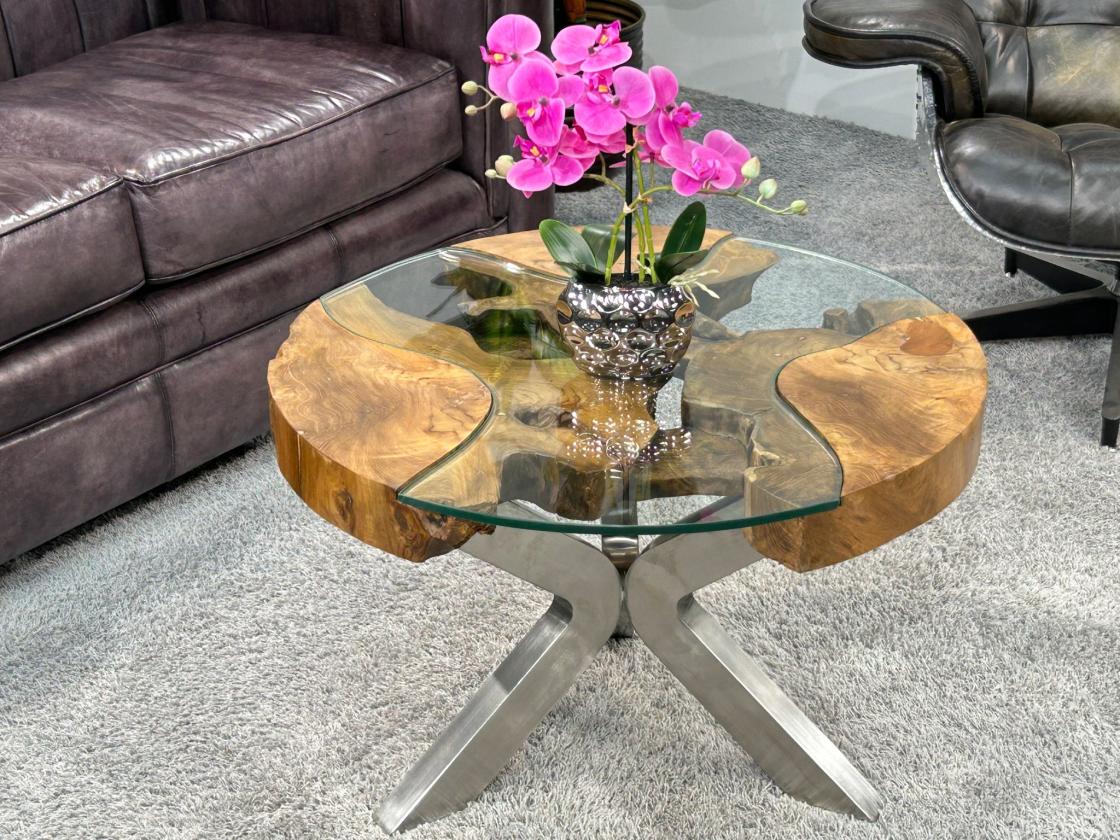 Dieser runde Couchtisch mit massiver Tischplatte verbindet die Ursprünglichkeit von Teakholz mit der klaren Linie moderner Materialien. Die Kombination aus den einzigartigen Wildkanten, den handgearbeiteten Glaseinlagen und dem robusten Edelstahlgestell macht diesen Tisch zu einem vielseitig einsetzbaren Highlight in jedem Wohnzimmer. Ob als runder Wohnzimmertisch, Massivholztisch oder Design-Tisch, dieses Möbelstück bringt Stil und Funktionalität in Ihr Zuhause.