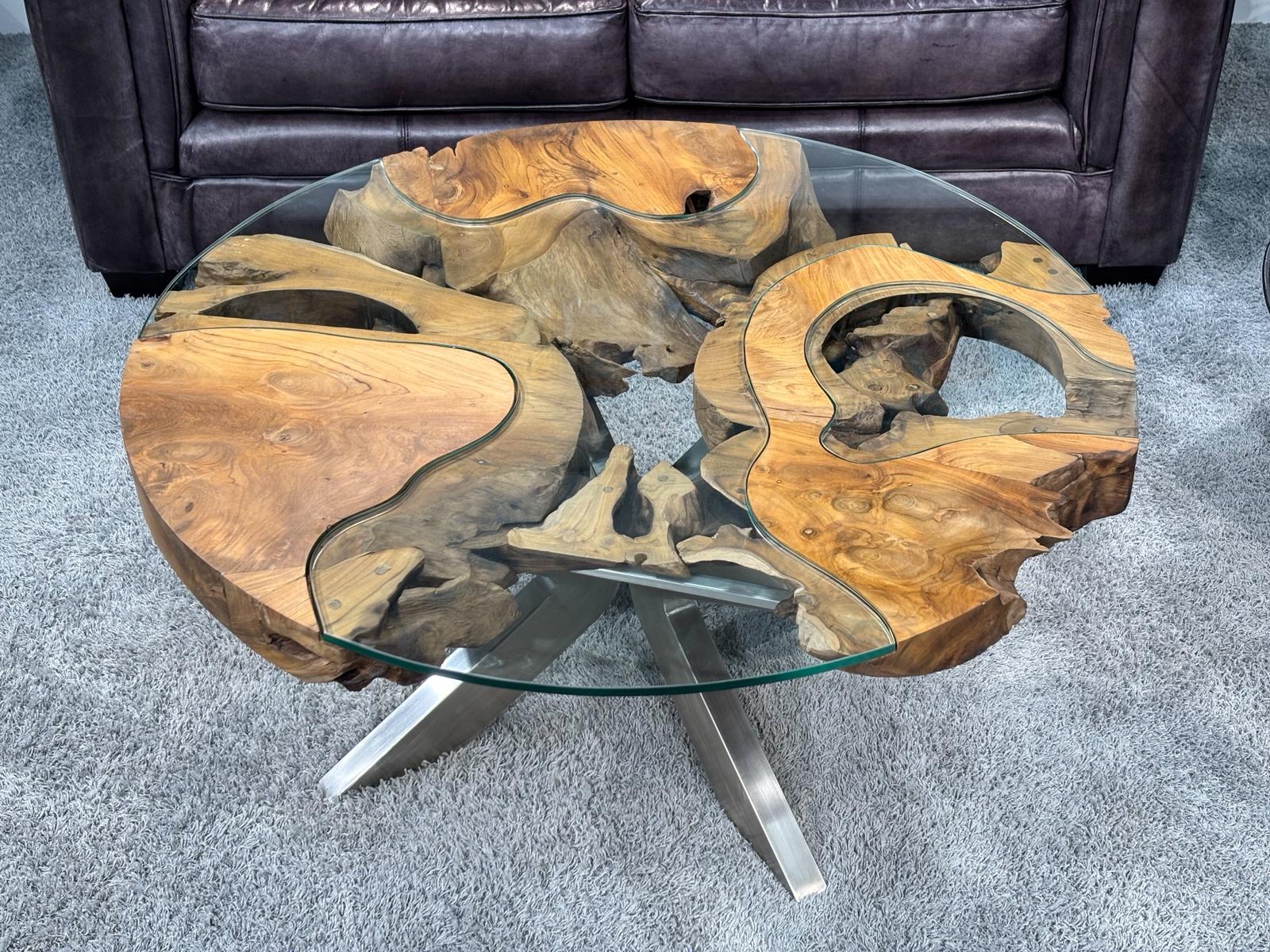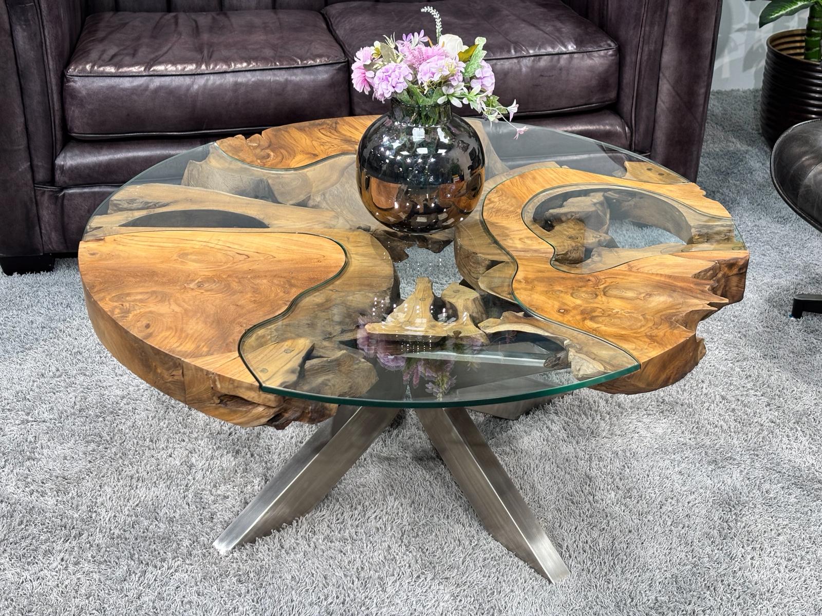 Runder Couchtisch „Sunrise“ Ø 100 cm – Kunstvoll verarbeitetes Teakholz mit Glaselement