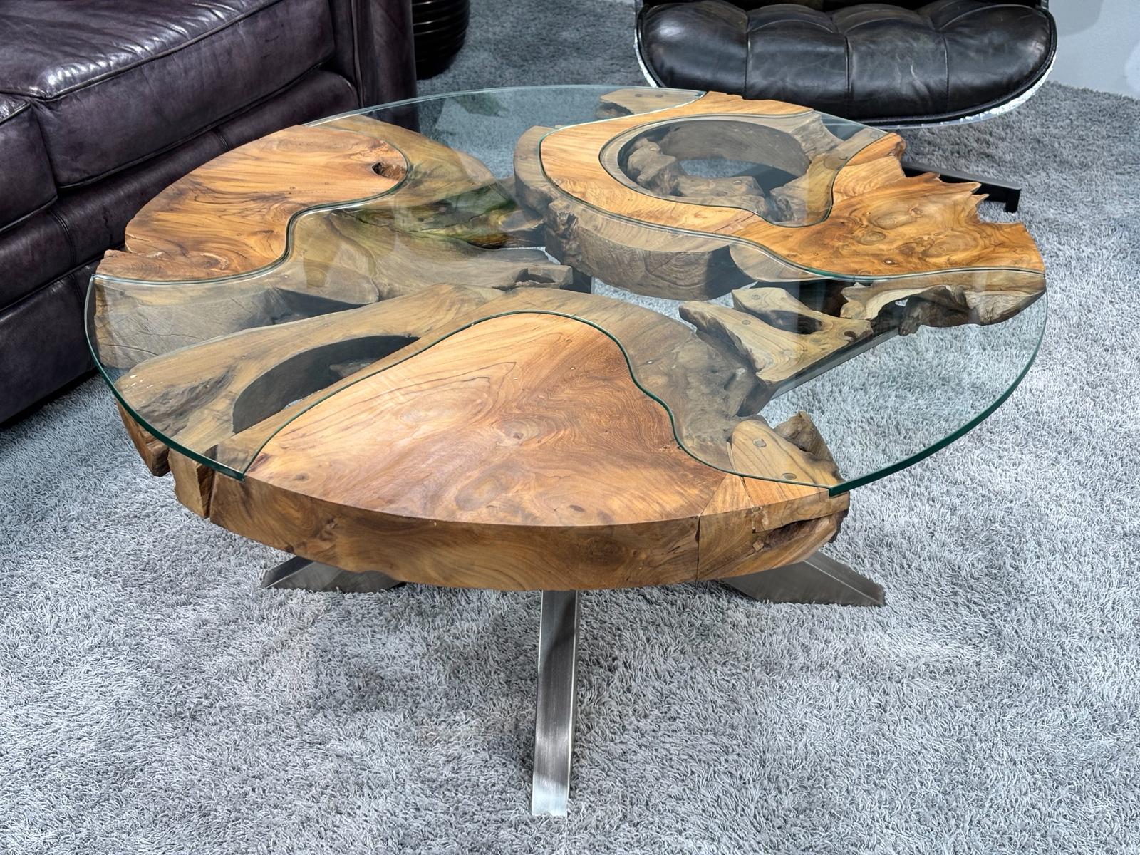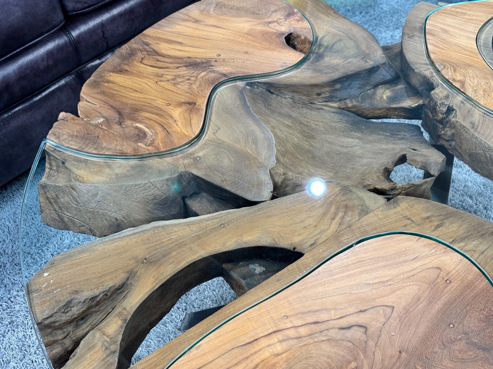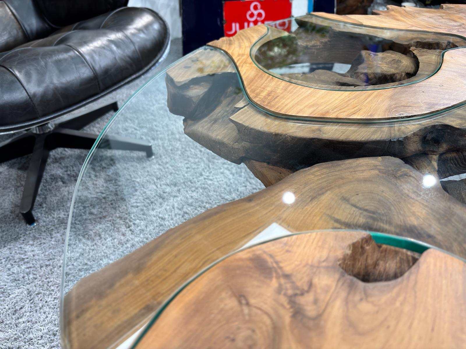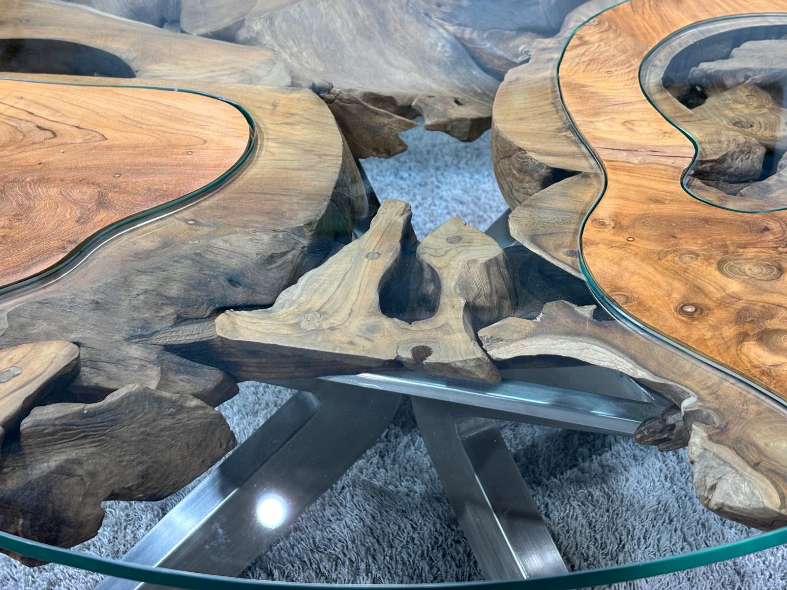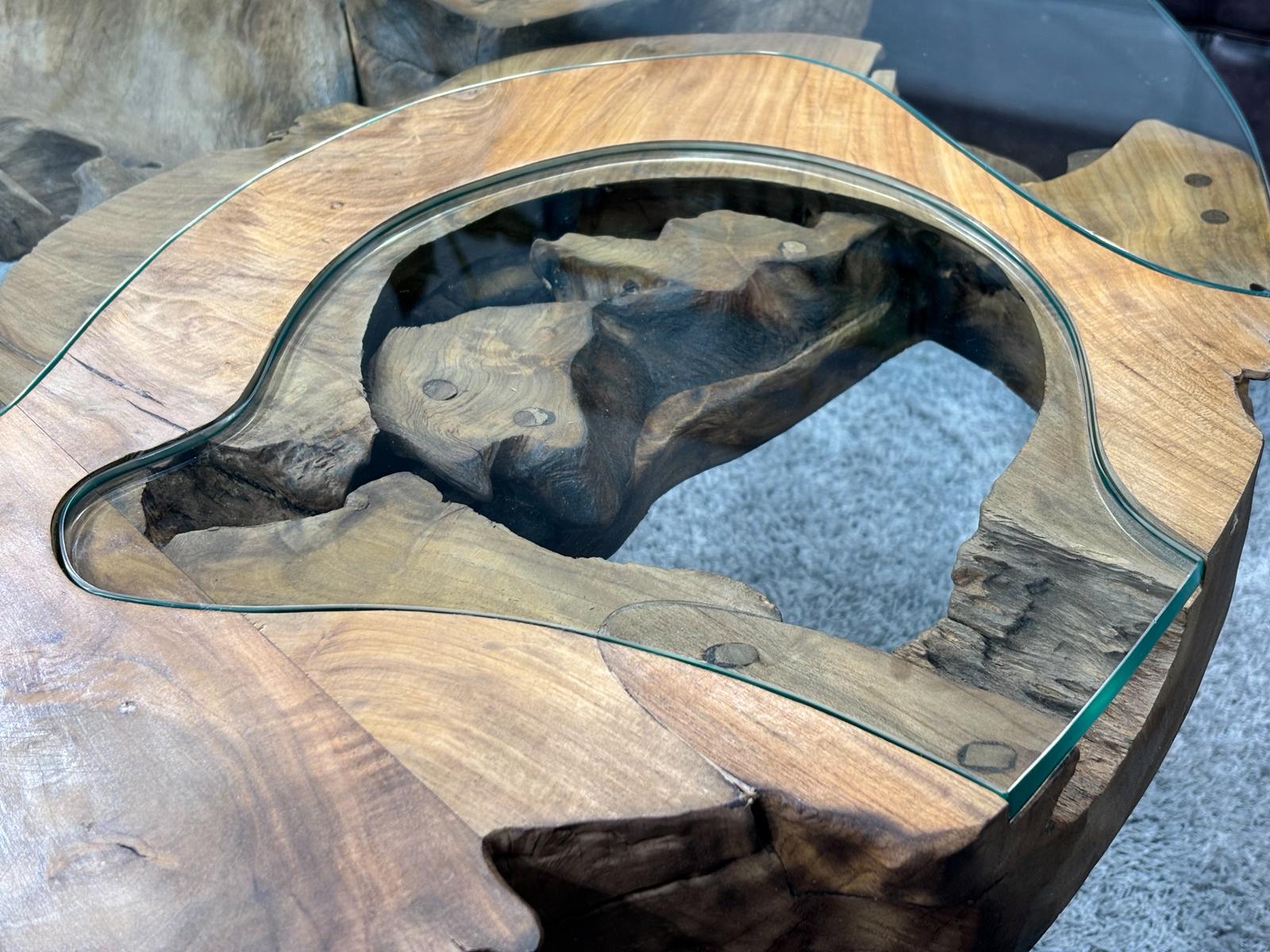 Zwischen den verwachsenen Holzformen entstehen natürliche Zwischenräume, die kunstvoll mit handgefertigten Glaseinlagen ergänzt werden. Das Ergebnis ist eine runde Couchtischplatte, die organisch, lebendig und einzigartig wirkt. Die verwendeten Materialien sind nicht nur nachhaltig, sondern auch ein echtes optisches Erlebnis.