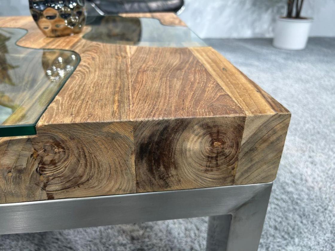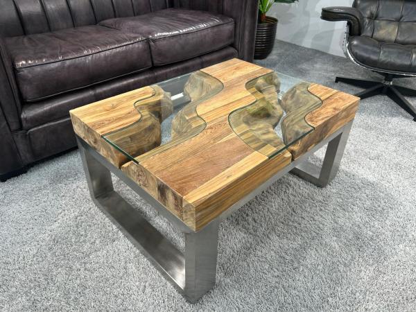 Der Wohnzimmertisch aus der Serie „Wild Landscape“ ist eine interessante Kombination aus recyceltem Holz in Verbindung mit den modernen Elementen Edelstahl und Glas. Das massive Holz der Tischplatte hat eine Stärke von 8 cm und besteht aus einzeln miteinander verleimten Massivholzbalken. An der Oberfläche der Tischplatte wurde durch den Einsatz zweier Glaseinleger ein Flusslauf, ähnlich einer Landkarte nachempfunden. Die montierten Tischkufen bestehen aus gebürstetem Edelstahl. Der Couchtisch "Wild Landscape" wird in jeder einzelnen Komponente in Handarbeit hergestellt.