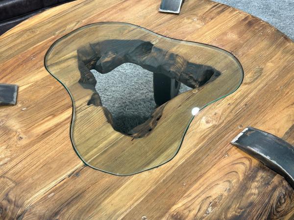 Mittig in der runden Tischplatte wurde eine Glaseinlage eingearbeitet, die den Blick durch den Tisch freigibt und die natürliche Schönheit des Holzes zusätzlich hervorhebt.