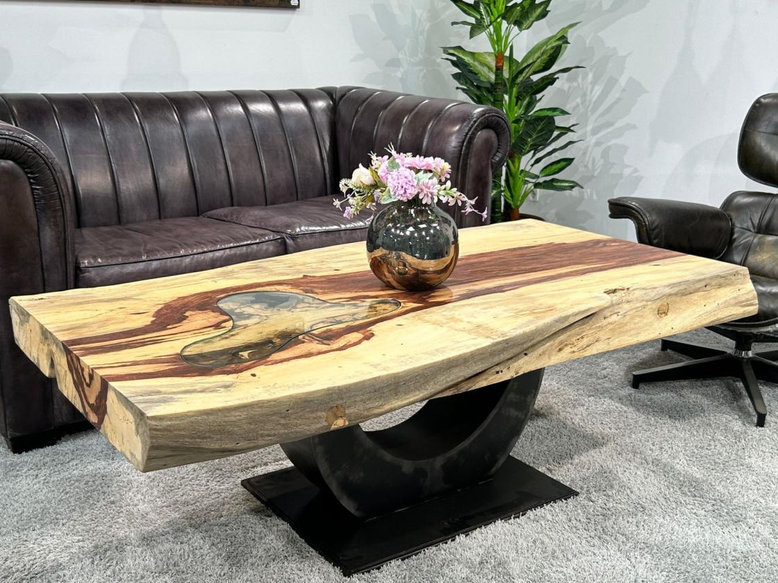 Eckiger Couchtisch "Deep Island Tamarind" ca. 150 x 75–78 x 50,5 cm aus Tamarindenholz mit Rohstahlgestell in Halbmondform und Glaseinlage