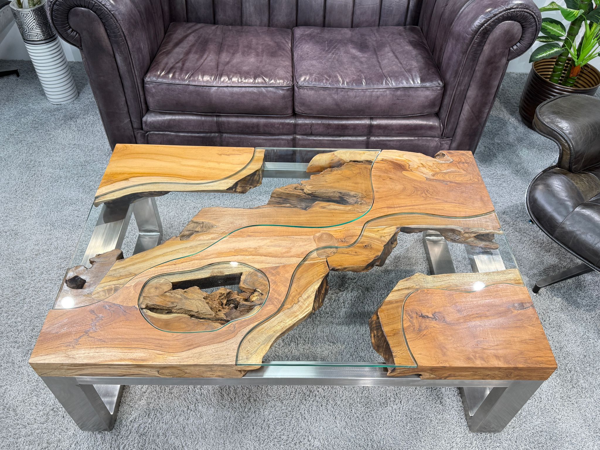 Couchtisch "Natural Landscape" (ca. 120 x 80 x 44,5 cm) aus Teakholz mit Glaseinlage und Edelstahlgestell