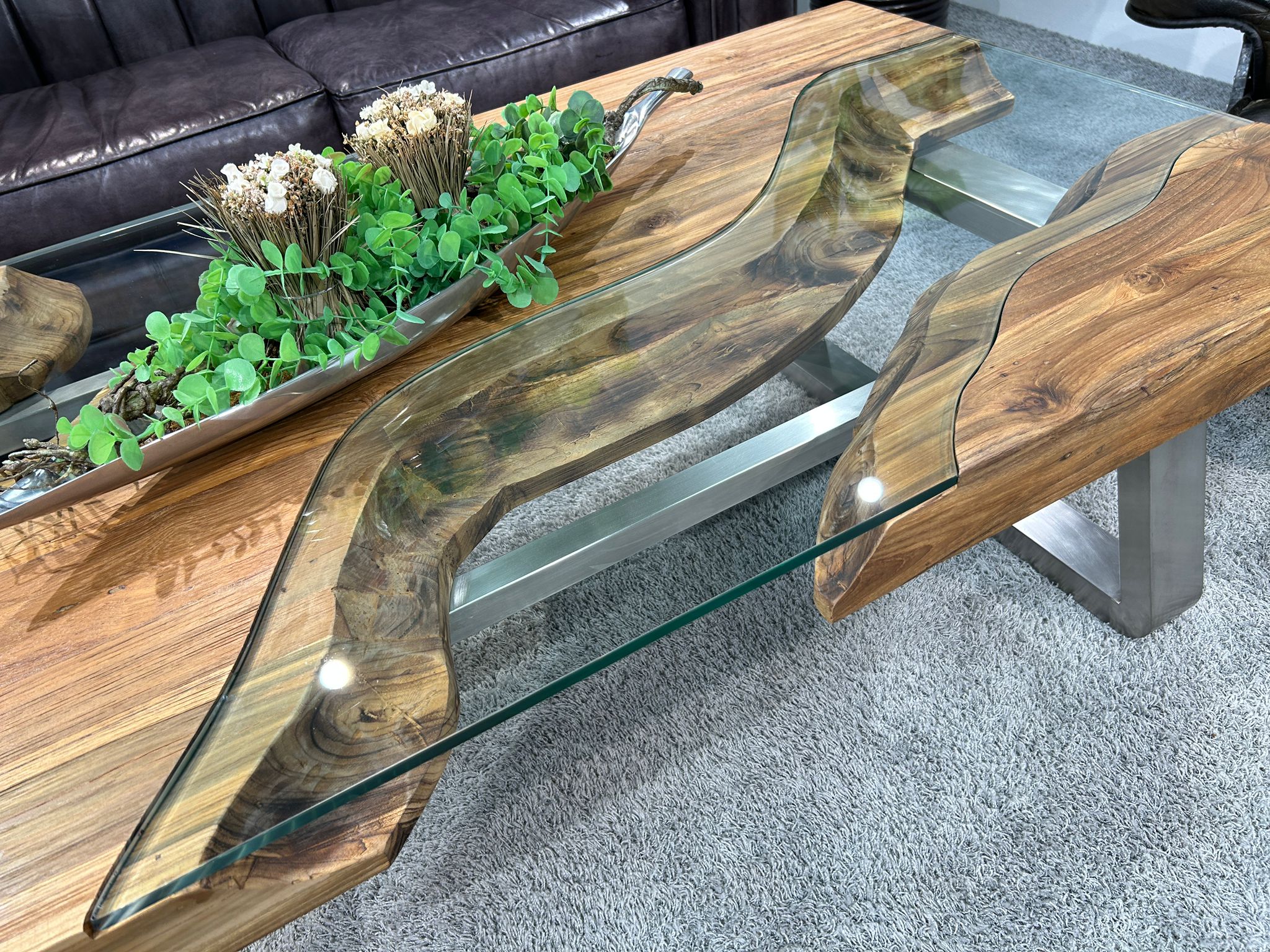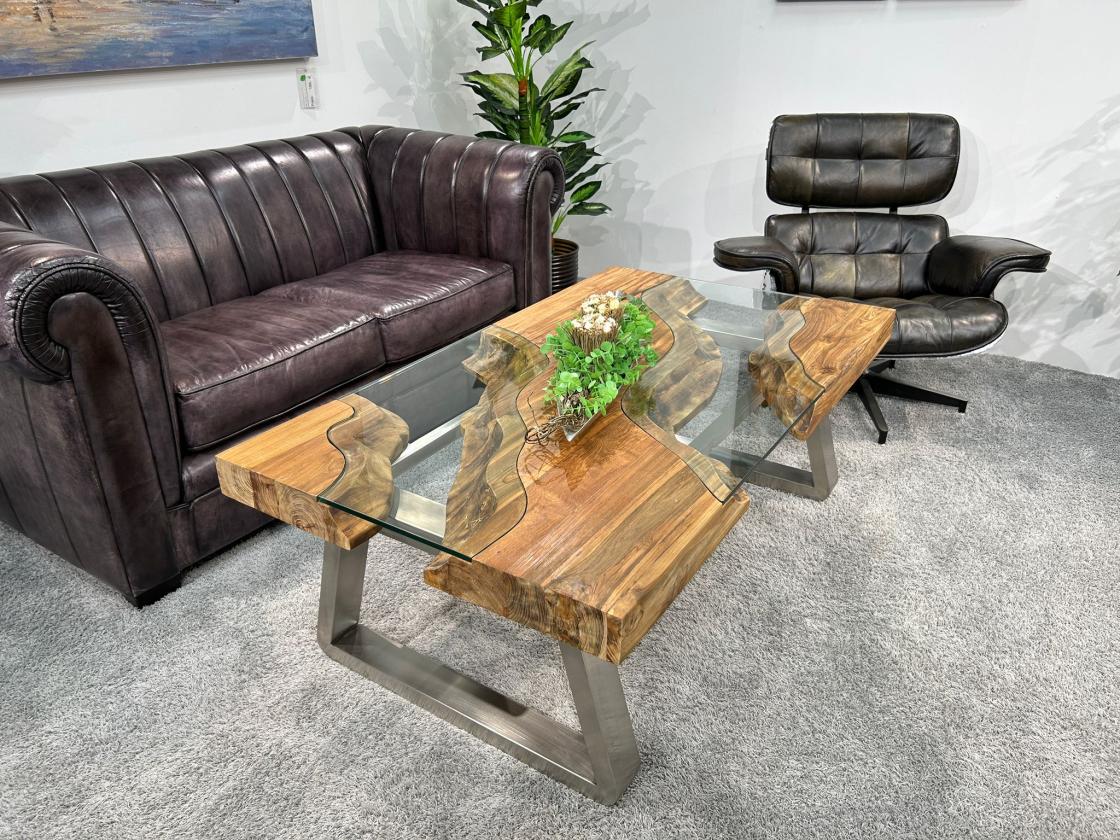 Der Holz-Wohnzimmertisch aus Holz aus der Serie „Wild Landscape“ ist mehr als nur ein Möbelstück – er ist ein Kunstwerk, das jedes Wohnzimmer aufwertet. Die Kombination aus massivem Holz, handgearbeiteten Glaseinlagen und dem modernen Edelstahlgestell macht ihn zu einem besonderen Highlight in jeder Einrichtung.