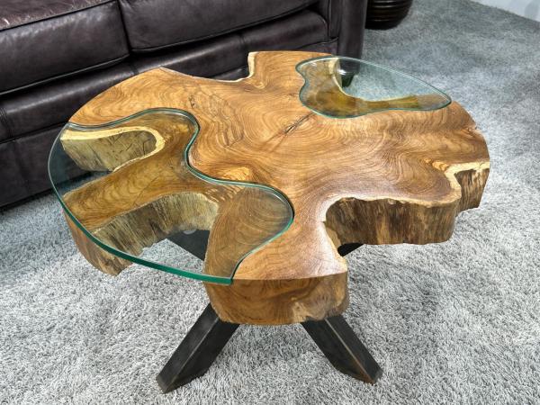Kleiner runder Wohnzimmertisch der Serie "Sunrise" aus Teakholz (Wurzelstamm) mit einem Tischgestell aus Rohstahl und Glas