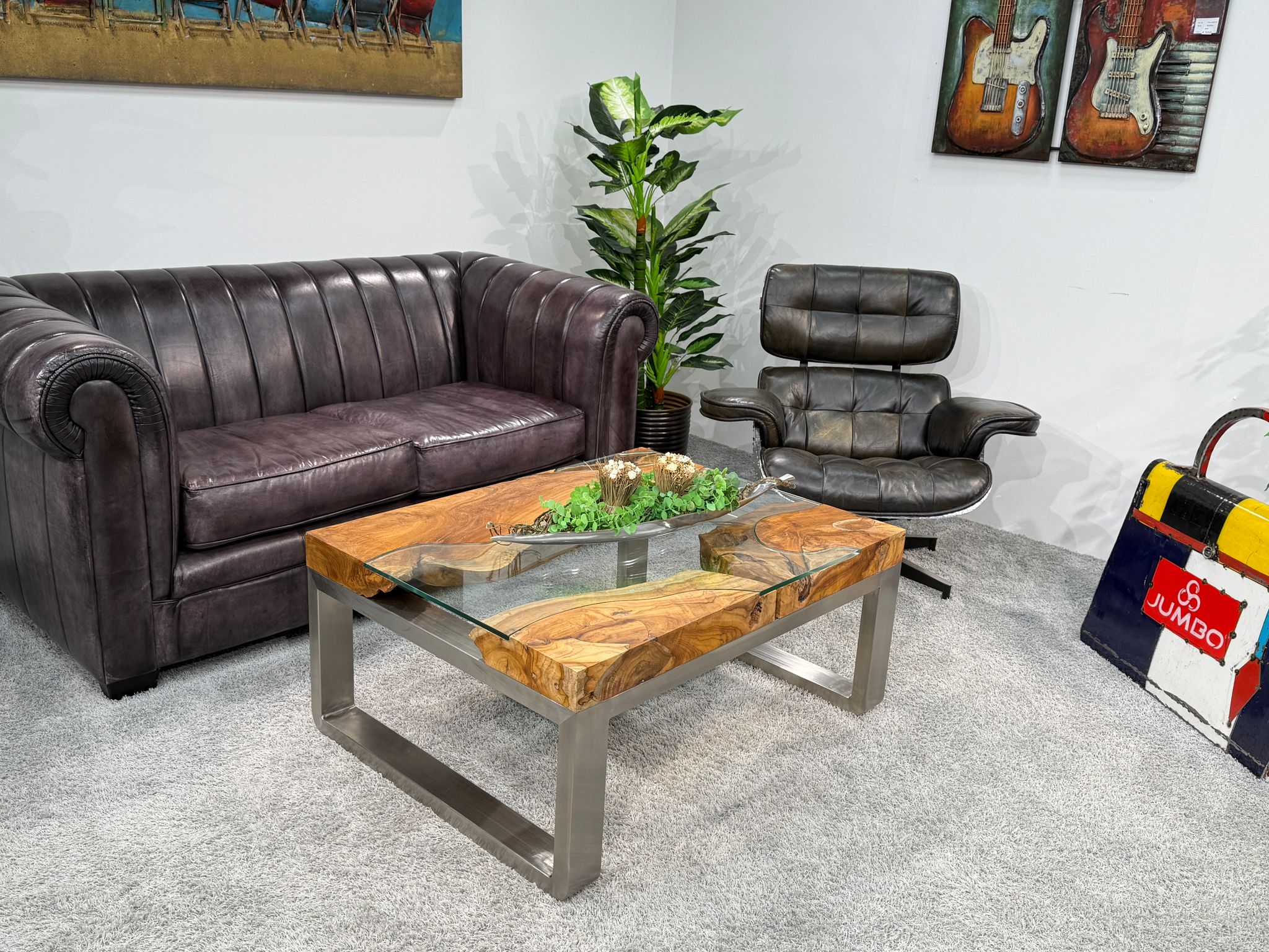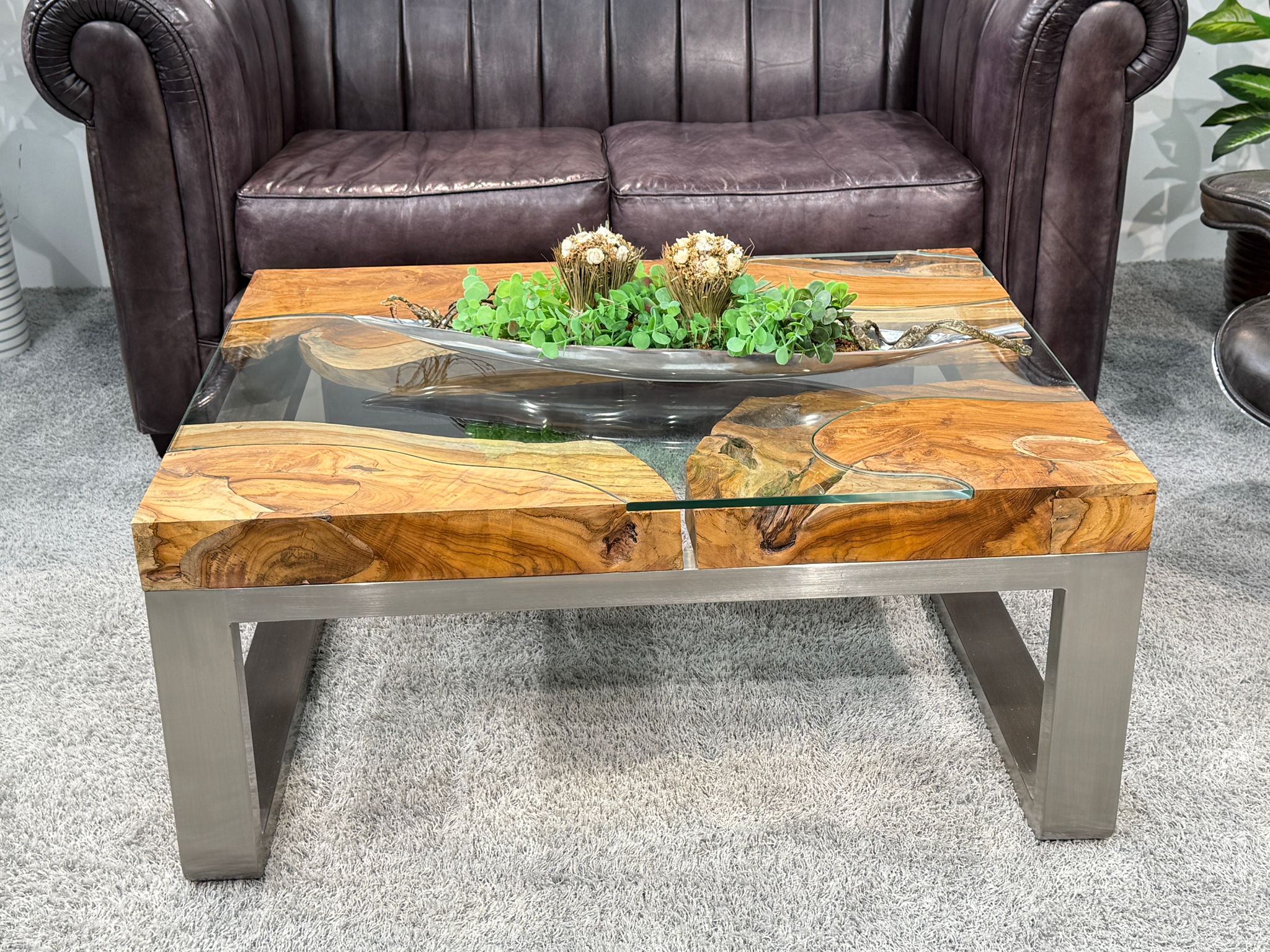 Couchtisch "Natural Landscape" (ca. 100 x 80 x 45 cm) aus Teakholz mit Glaseinlage und Edelstahlgestell