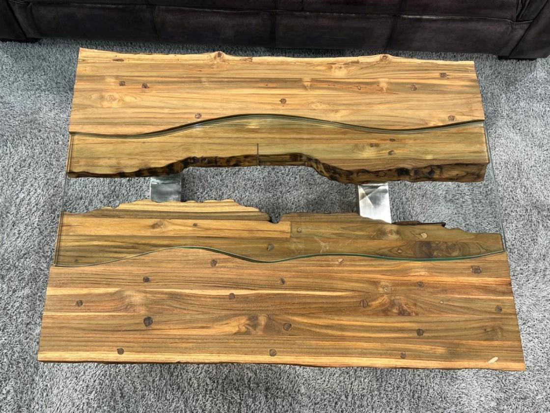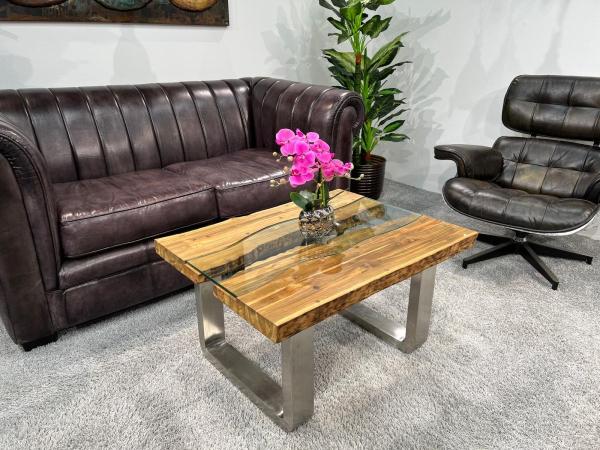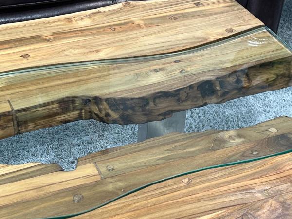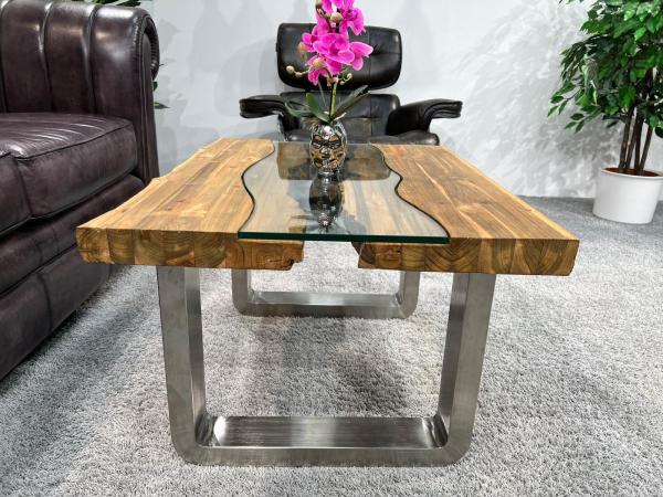 Rechteckiger Couchtisch "Old Elements" mit Baumkante ca. 80,5 x 60-62 x 45 cm aus recyceltem Teakholz mit Glas und Edelstahl