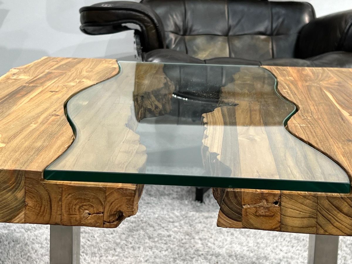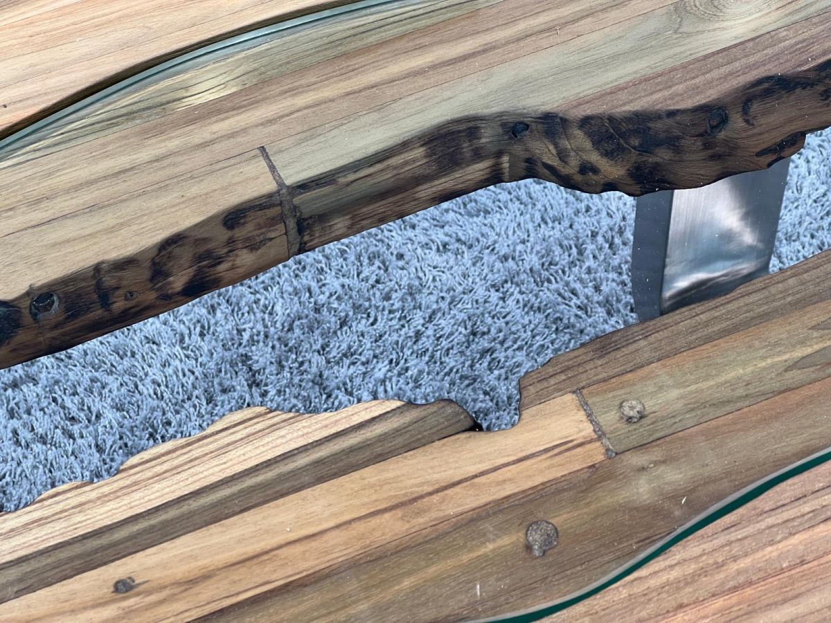 Wie ein Fluss durchquert die 10 mm starke Glasplatte das massive Teakholz. Die verleimten Bohlen weisen eine Stärke von 6 cm auf und sind fest mit dem Tischgestell aus gebürstetem Edelstahl verschraubt. Die Oberfläche des Holzes wurde von Hand gebürstet und anschließend gewachst.