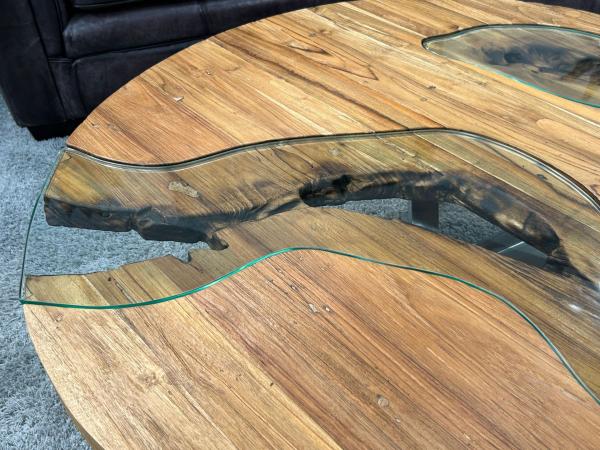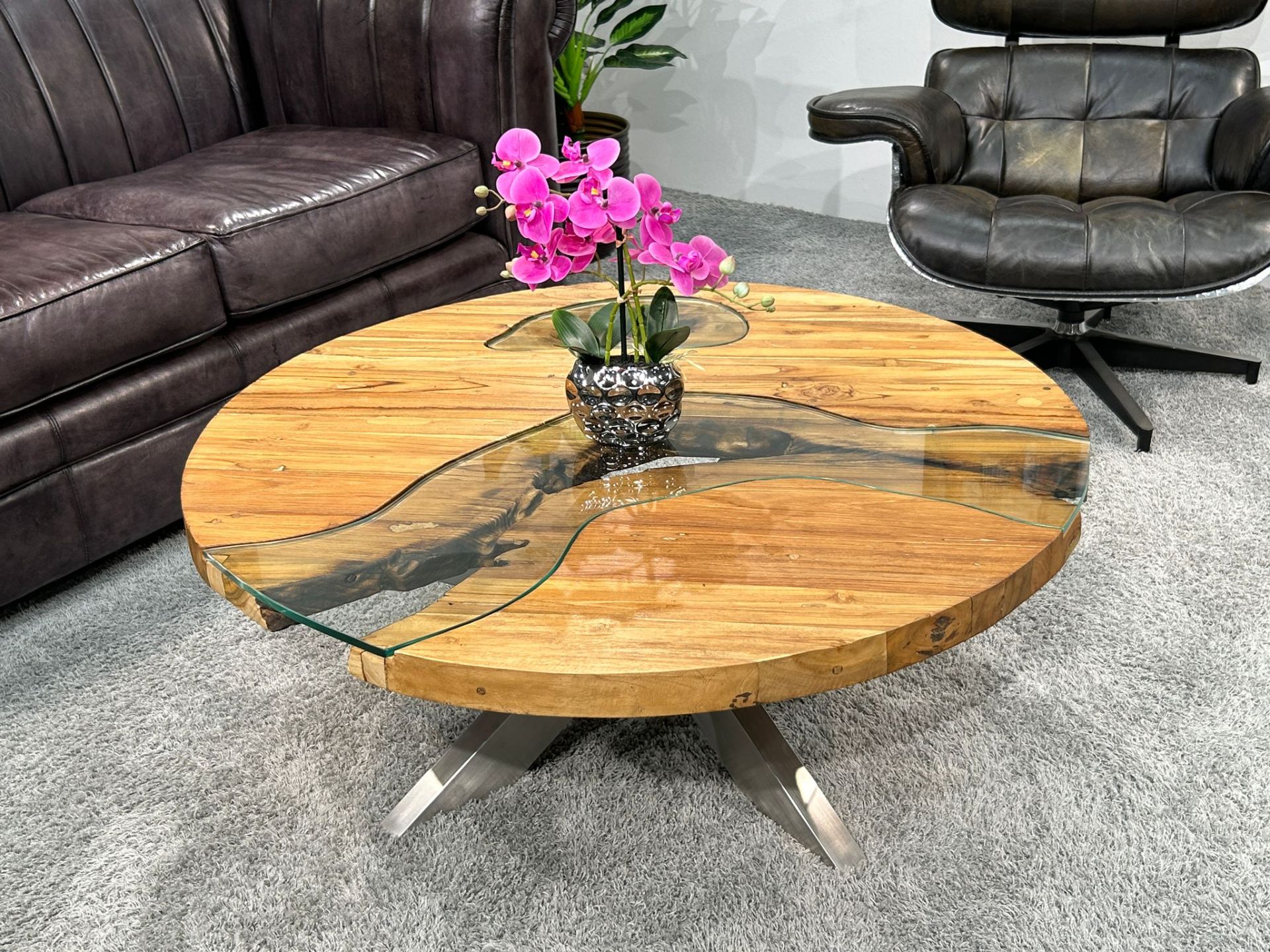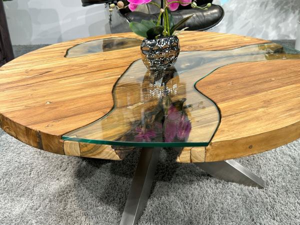 Runder Design Couchtisch "Eternia" (Ø 100 x H40,5 cm) aus Altholz mit einem Tischgestell aus Edelstahl und Glas