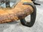 Auf der Tischoberfläche wurde eine handgefertigte Glasplatte mit einer Stärke von 10 mm eingelassen. Diese Glasplatte ermöglicht faszinierende Einblicke in die Ursprünglichkeit und Struktur des Holzes und setzt einen eleganten Kontrast zur robusten Holzplatte.