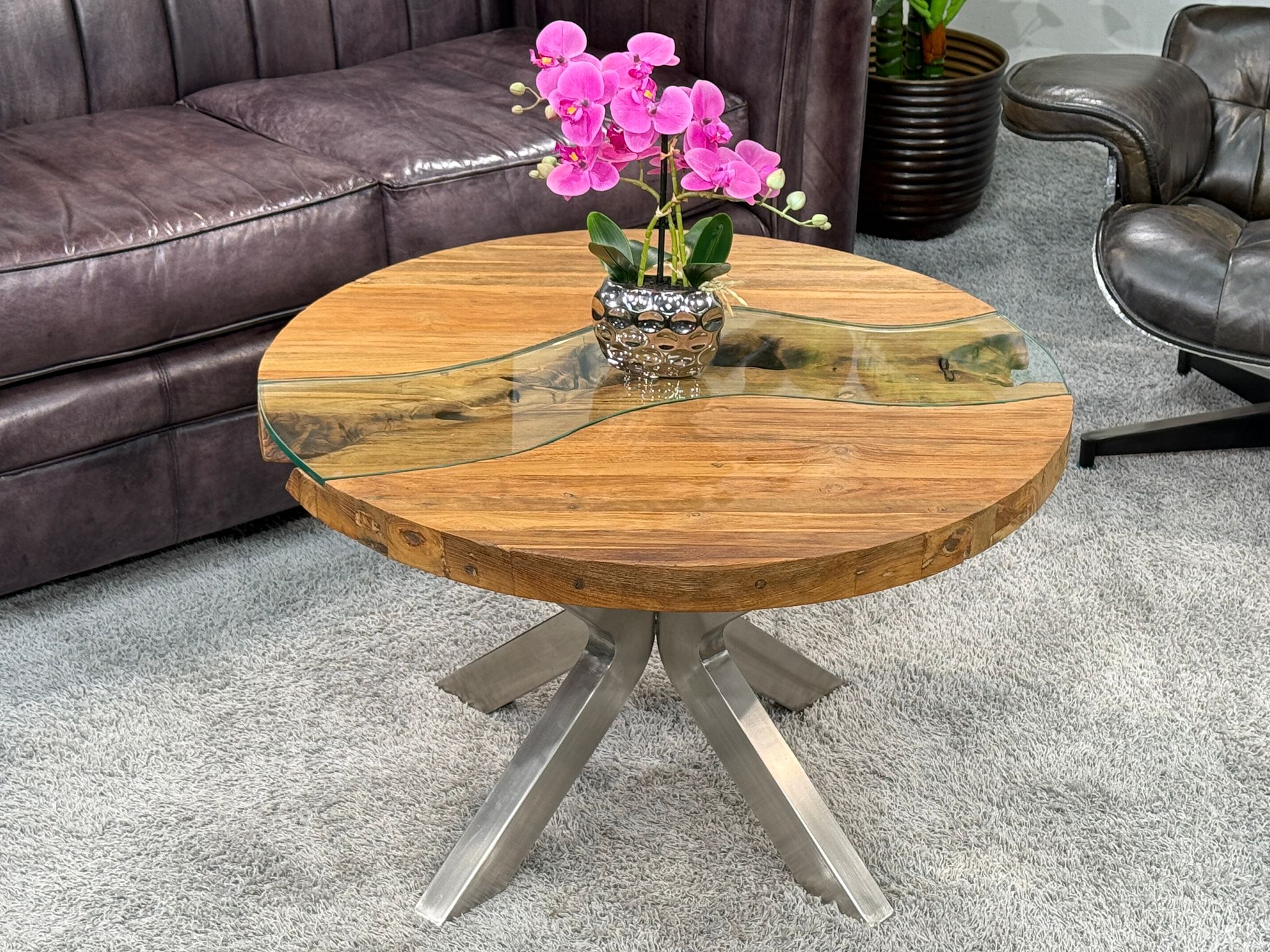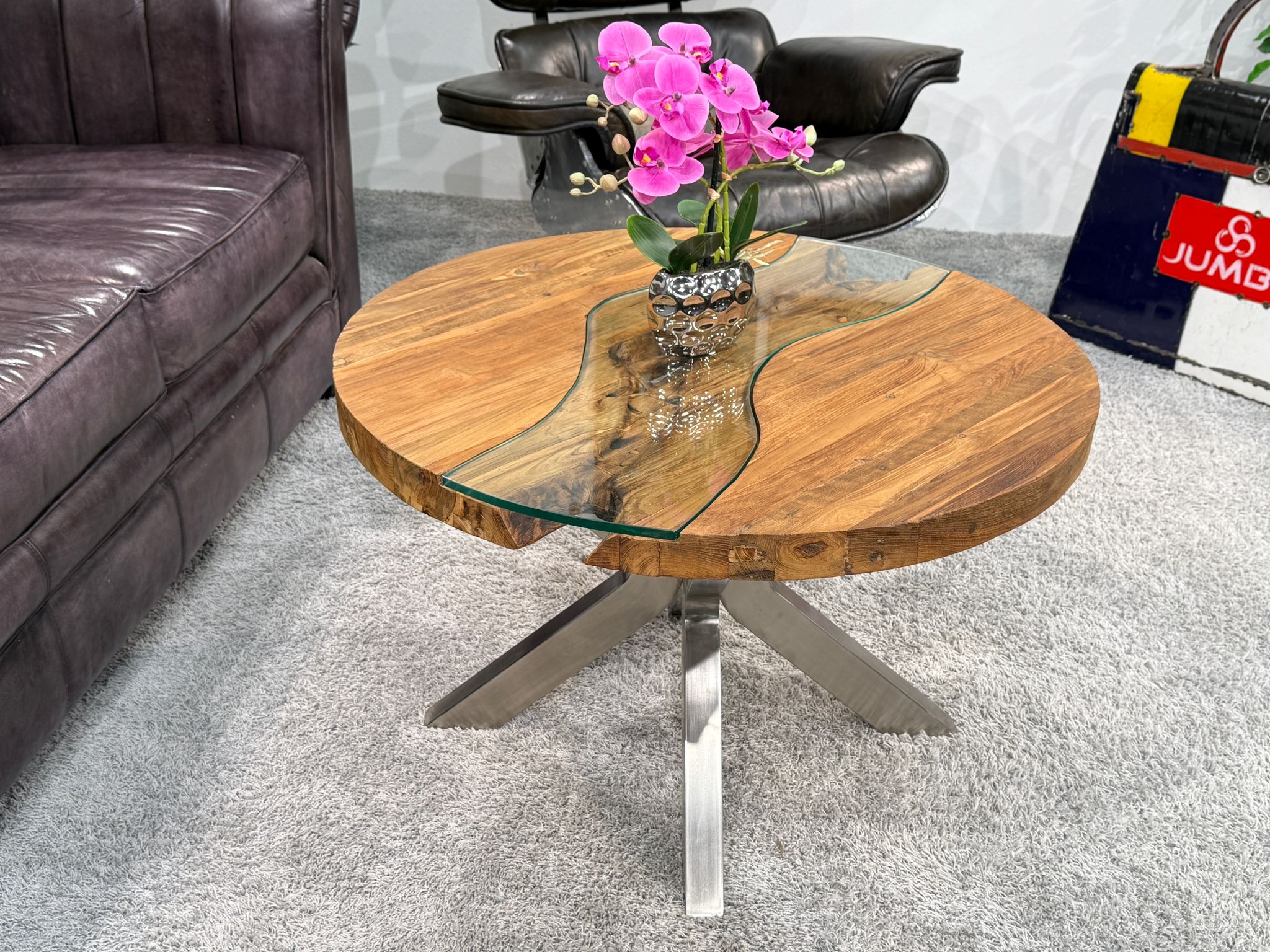 Runder Wohnzimmertisch aus recyceltem Holz – Wohnzimmertisch rund mit Edelstahlgestell und Glaseinlage