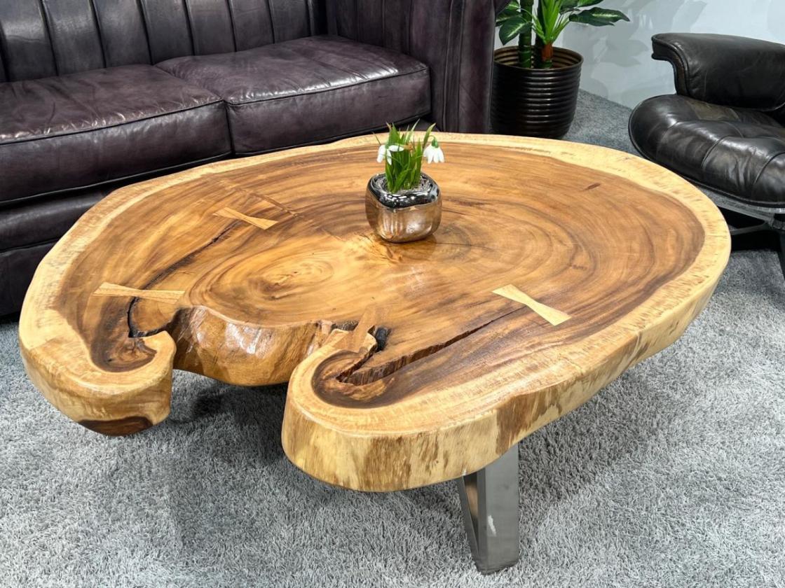 Ein Wohnzimmertisch aus einem Baumstamm muss nicht immer eine schlichte, runde Form haben. An dieser Stelle finden wir Baumscheiben mit besonderen Merkmalen oder mit ungewöhnlichen Verwachsungen viel reizvoller.