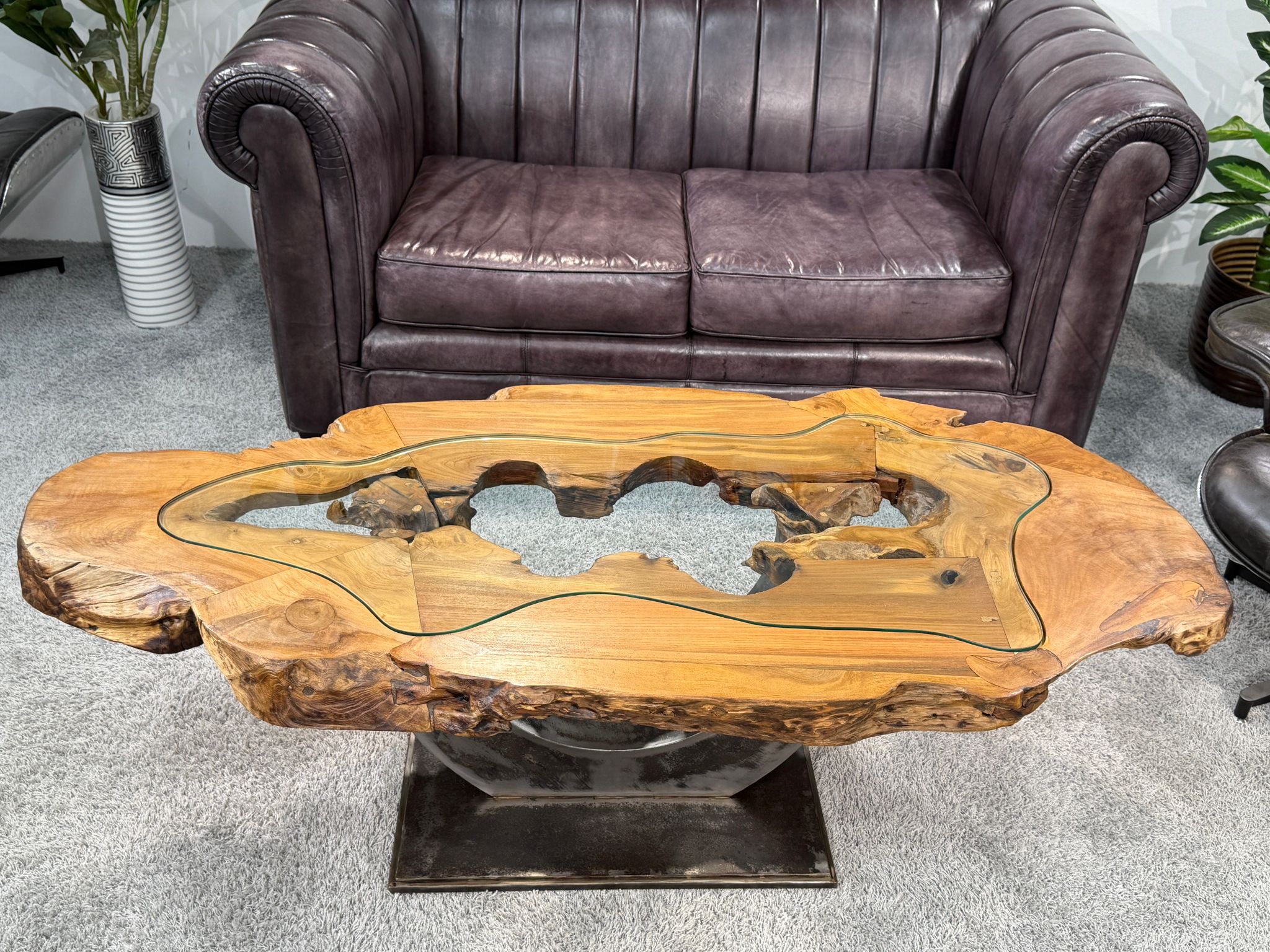 Der Unikat-Couchtisch aus einem Baumstamm aus der Serie Expression ist ein beeindruckendes Möbelstück, das durch seine einzigartige Kombination aus natürlichem Holz und modernem Design besticht. Die Tischplatte besteht aus miteinander verleimten Baumscheiben eines Teakbaums, die aus dem Bereich der Baumwurzel entnommen wurden. Das Wurzelholz verleiht dem Tisch eine besonders ausdrucksstarke Struktur und macht ihn zu einem echten Unikat.