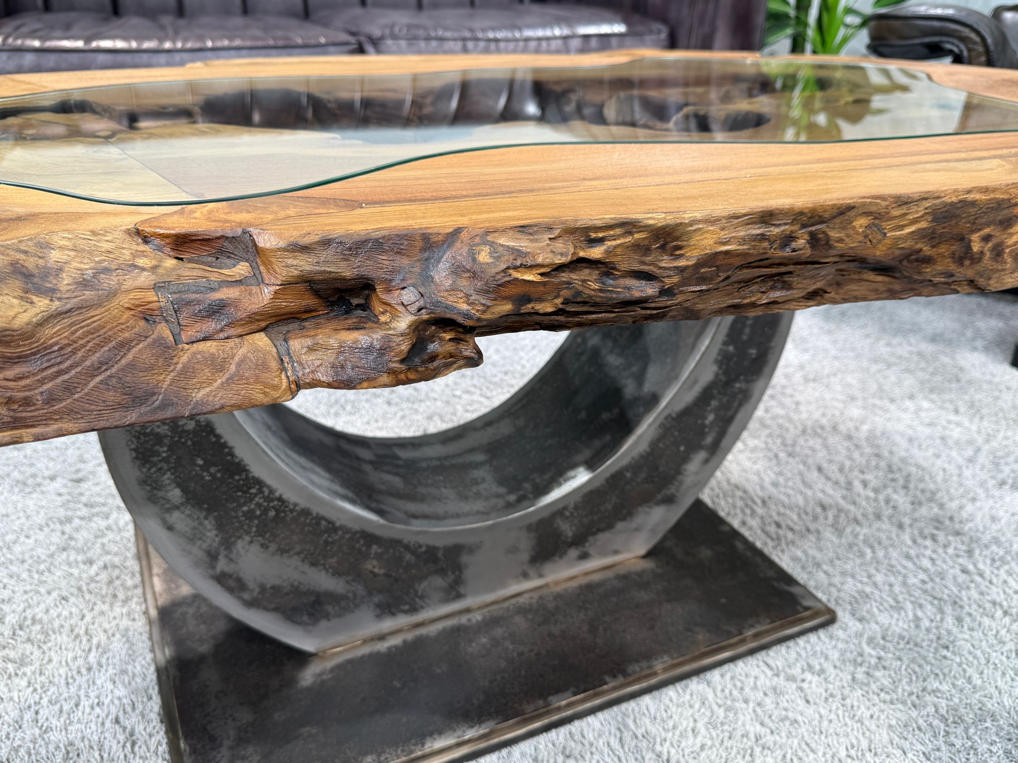 Die natürliche Baumkante wurde sowohl im Außen- als auch im Innenbereich der Tischplatte beibehalten, was die Ursprünglichkeit des Holzes betont. Der im Inneren entstandene freie Raum wurde in sorgfältiger Handarbeit mit einer Glaseinlage versehen, die das Design abrundet und den Blick auf die einzigartige Holzstruktur lenkt.