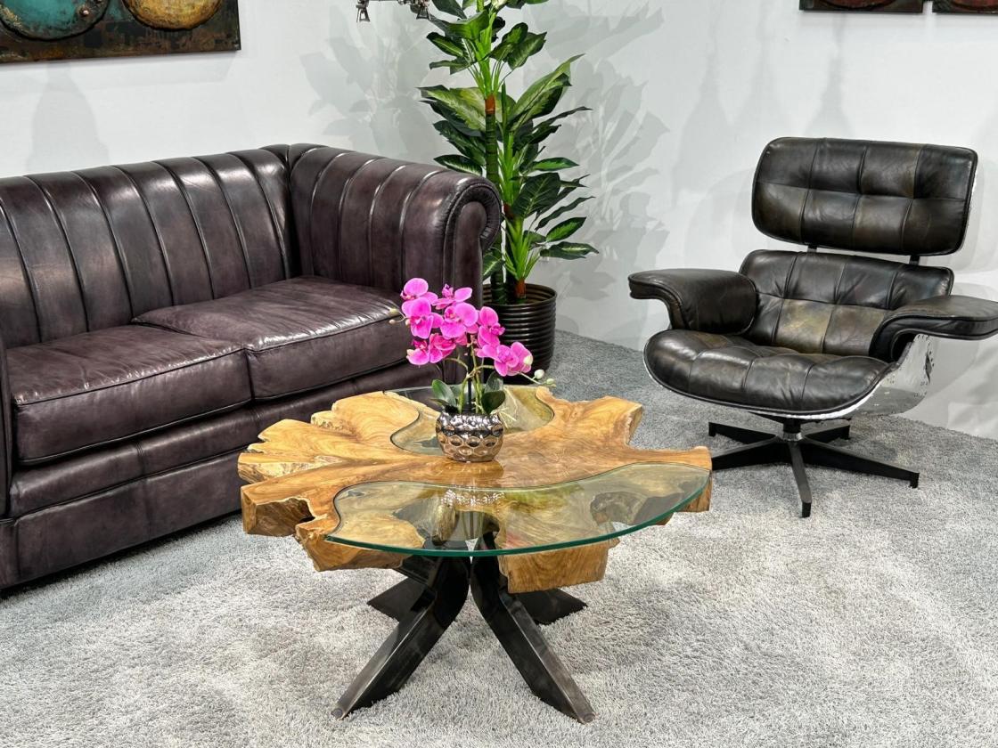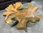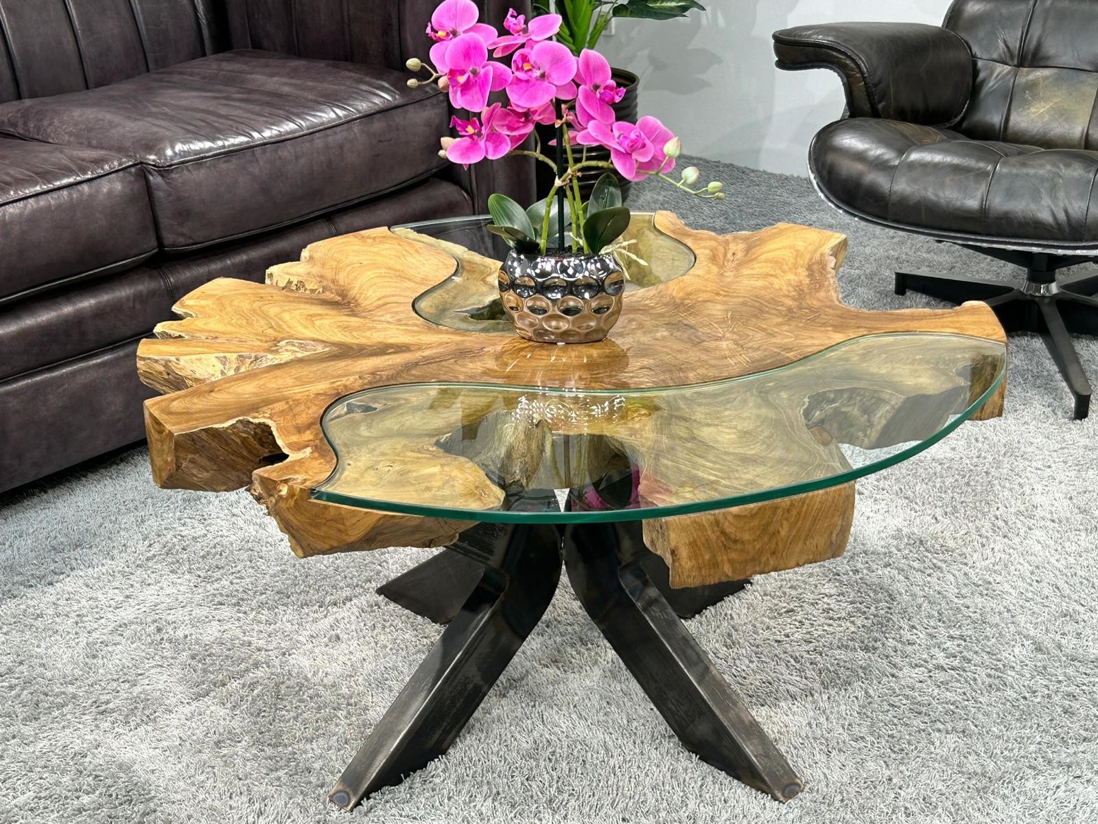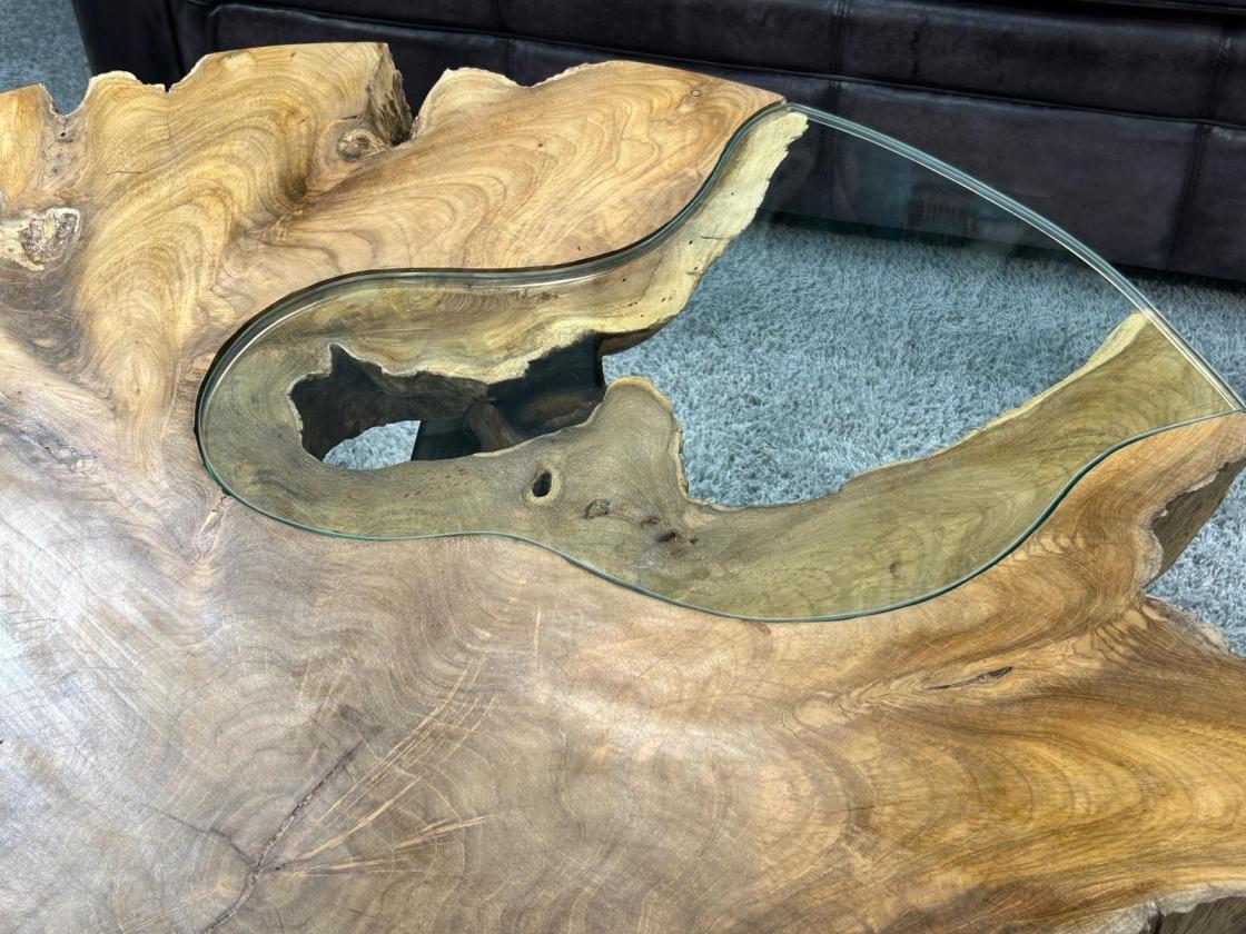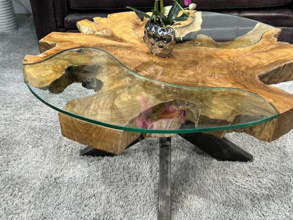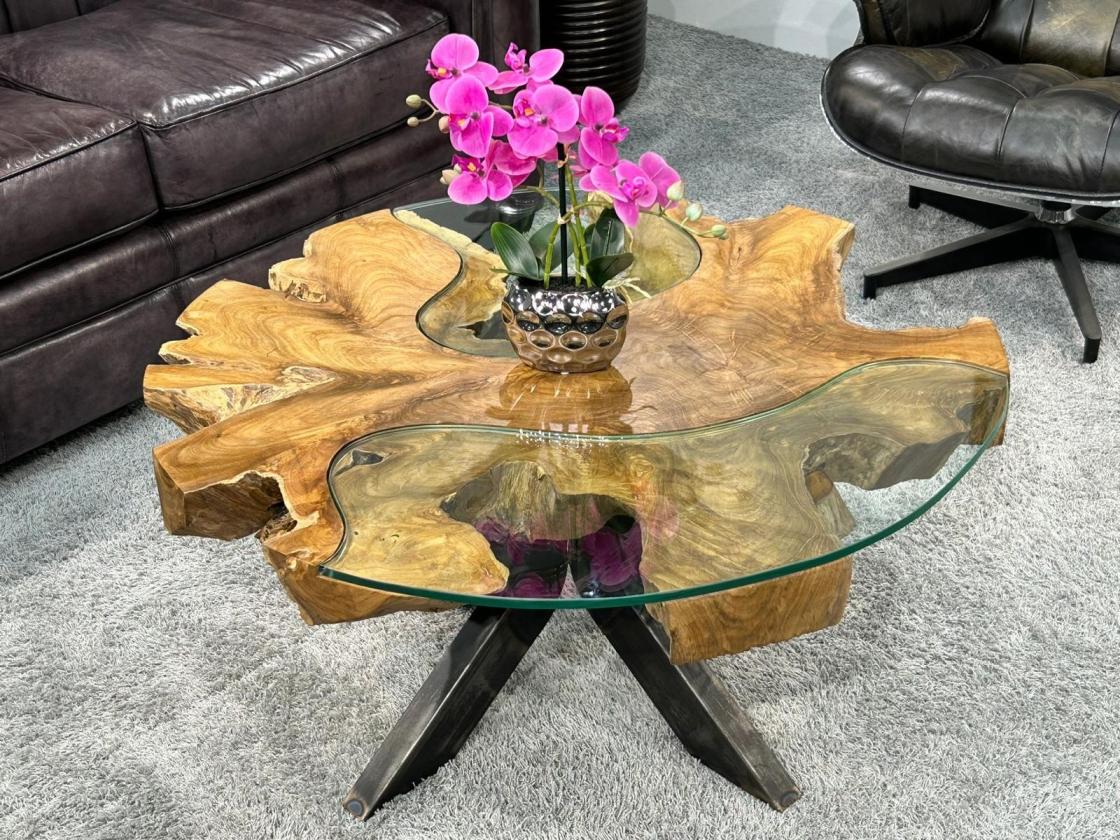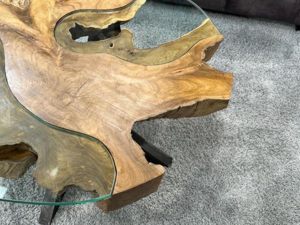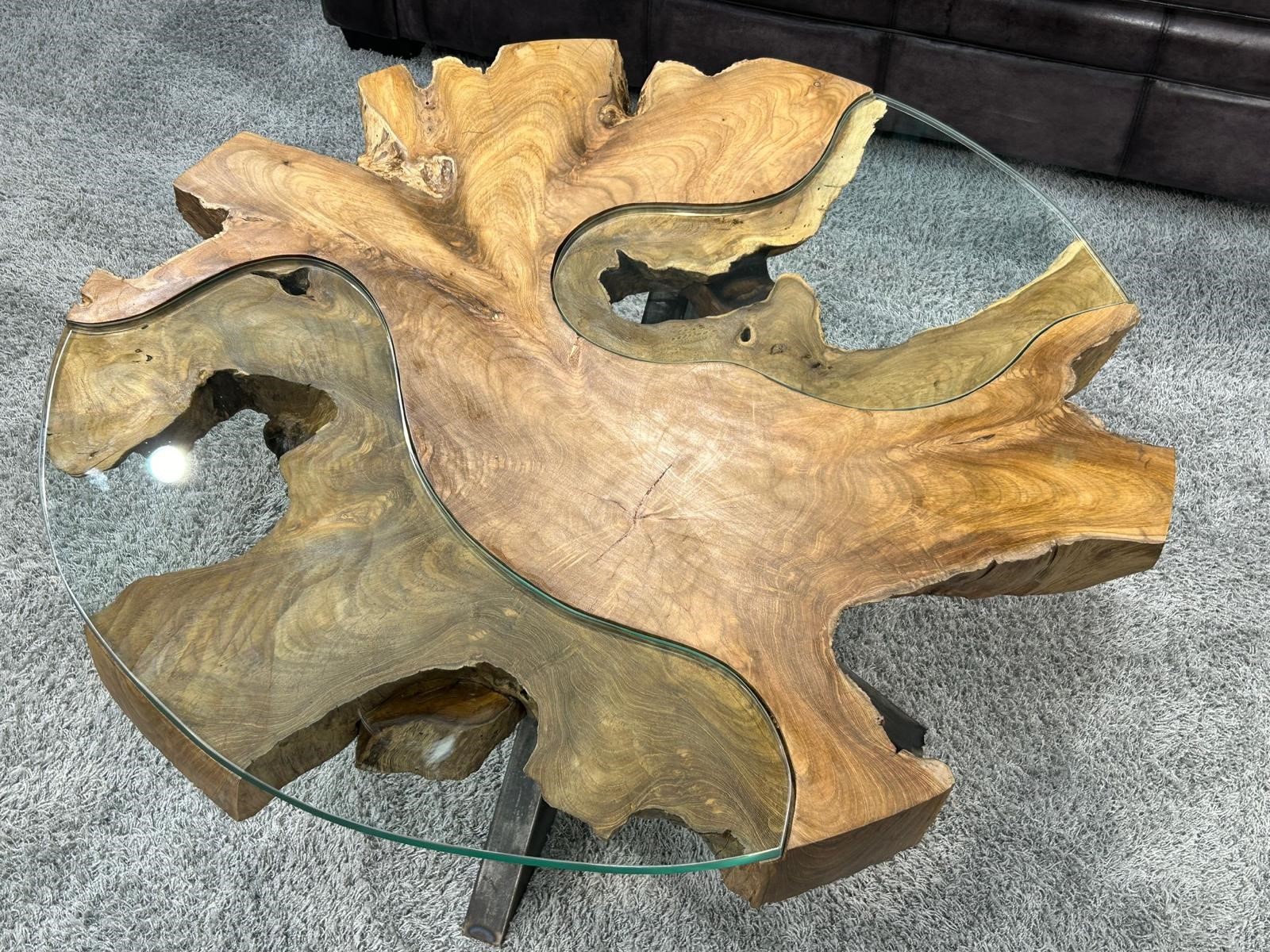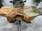 Runder Couchtisch der Serie "Sunrise" aus Teakholz (Wurzelstamm) mit einem Tischgestell aus Rohstahl und Glas