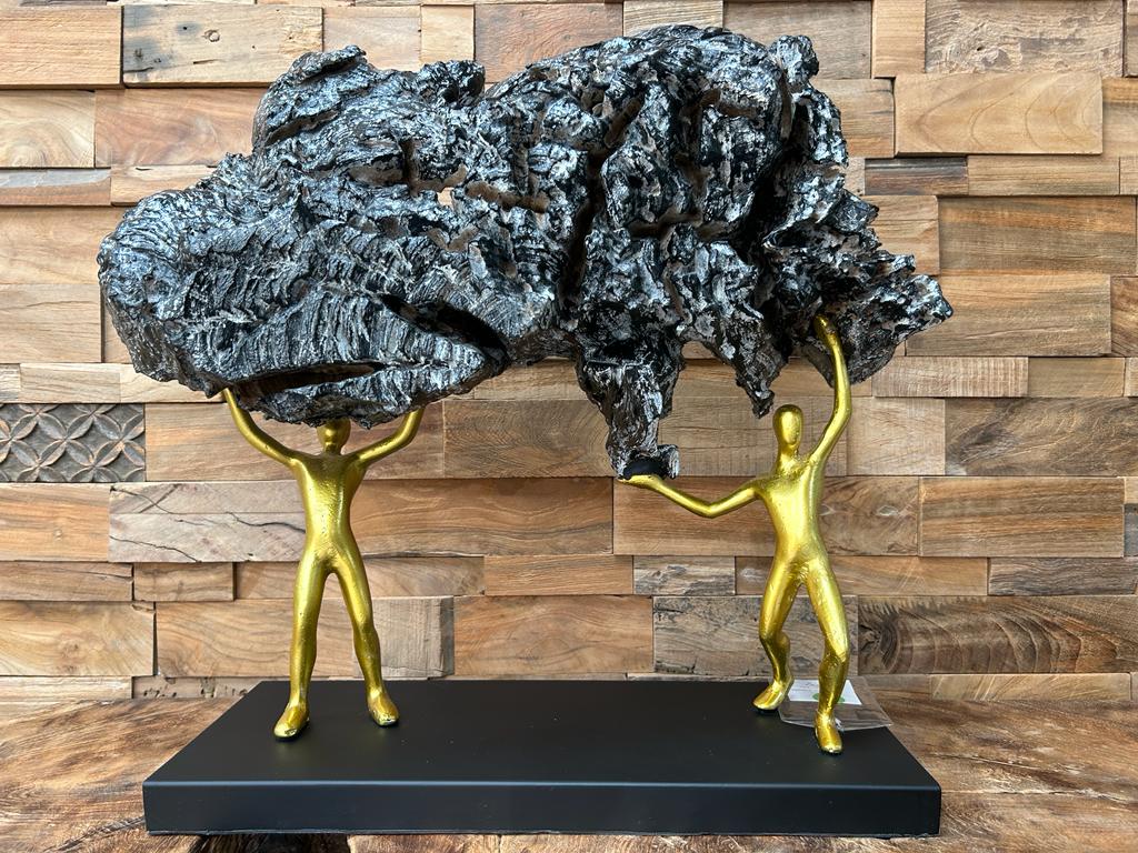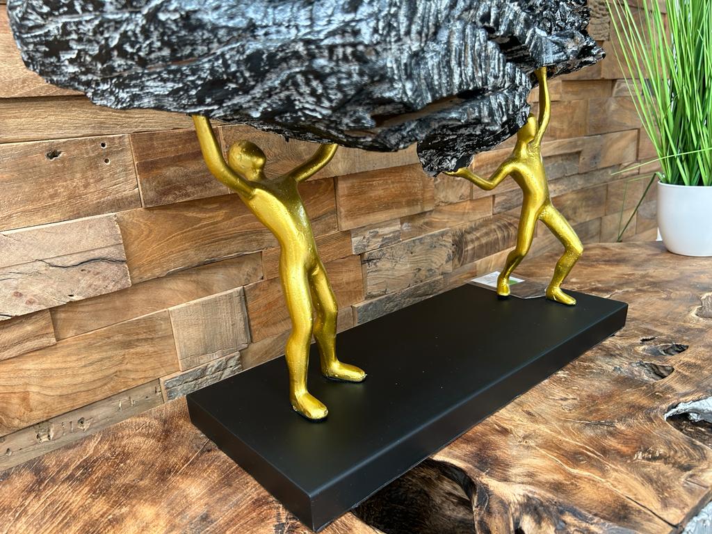 Zwei Figuren aus Metall in goldener Optik stemmen das Holz in die Höhe und sorgen mit ihrem Design für einen optimalen Kontrast zu dem Holz. Das erodiertes Massivholz verwittert über Jahrzehnte in der Natur und erhält dadurch eine einmalige Ästhetik. Je nach Variante wird das Holz mit einem speziellen "Finshing" versehen. Bei dieser Skulptur handelt es sich um ein Unikat.