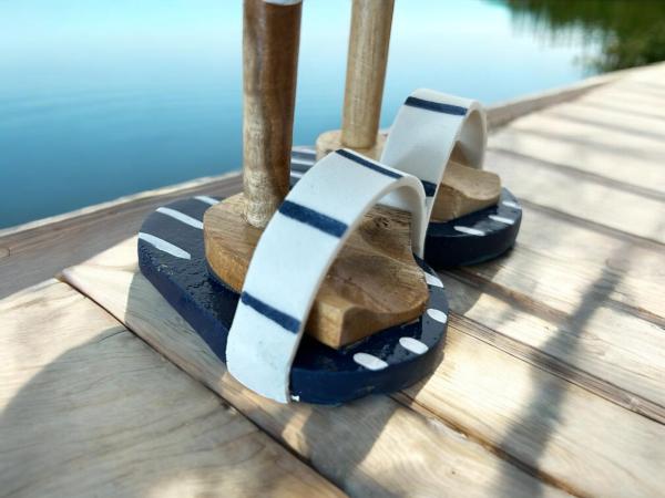 Blau-weiß gestreifter Badeanzug, Sonnenhut, Badelatschen |